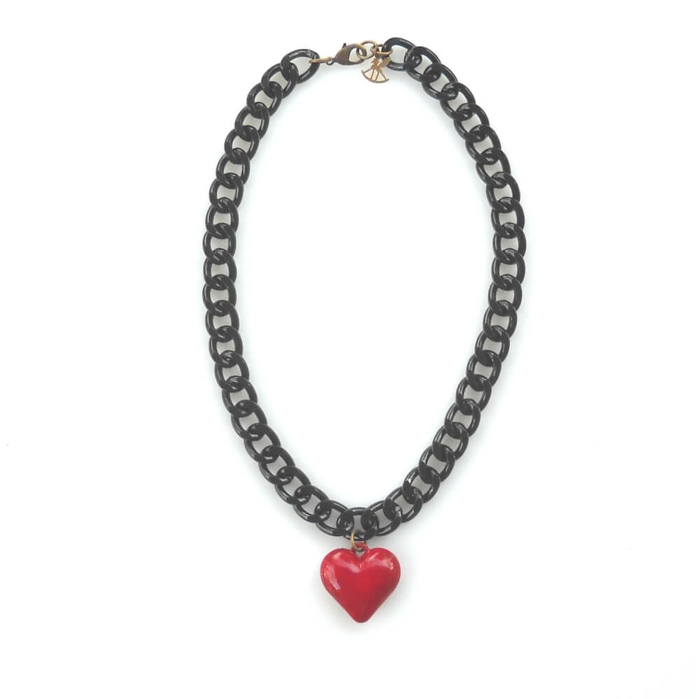 לב אדום גדול על שרשרת גורמט עבה בציפוי שחור