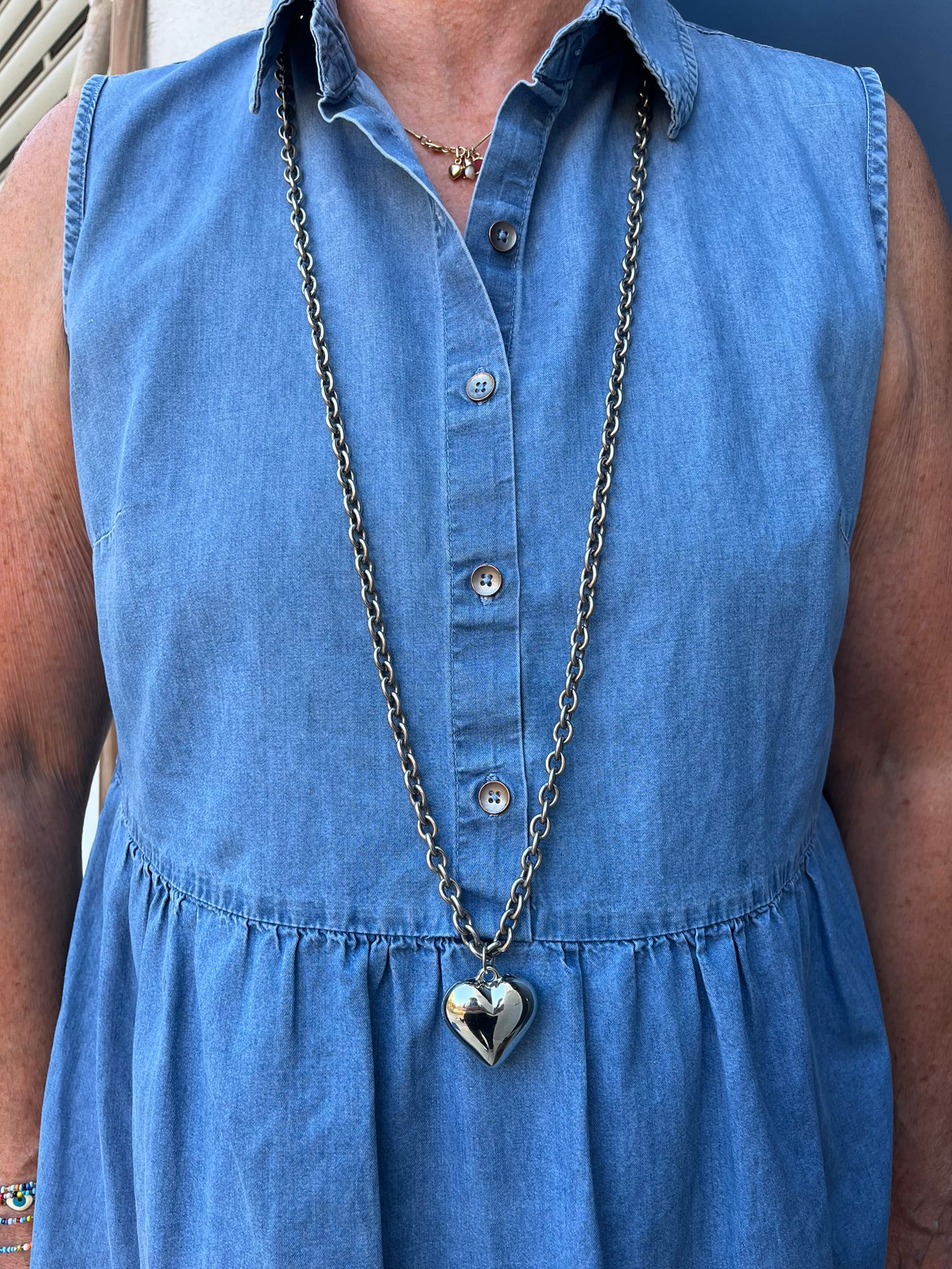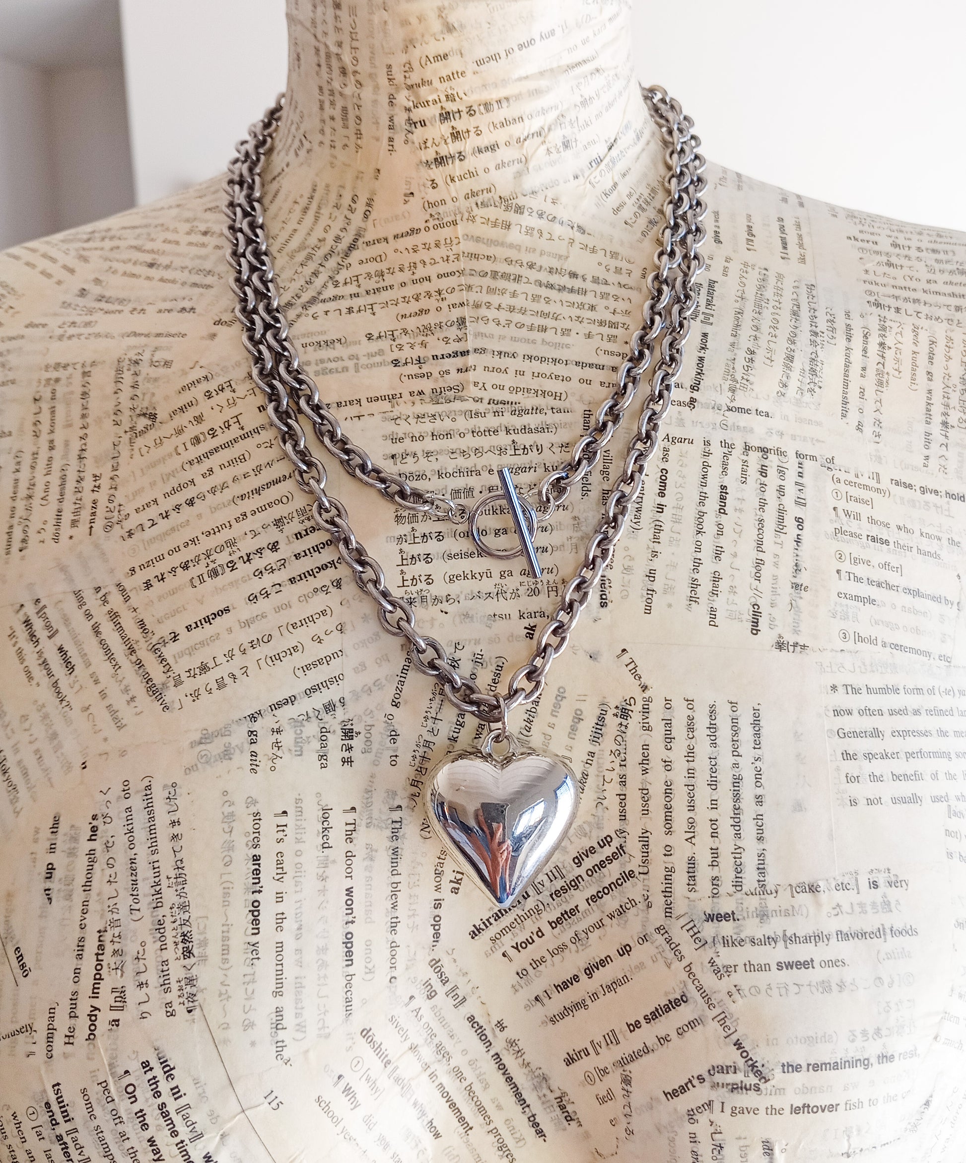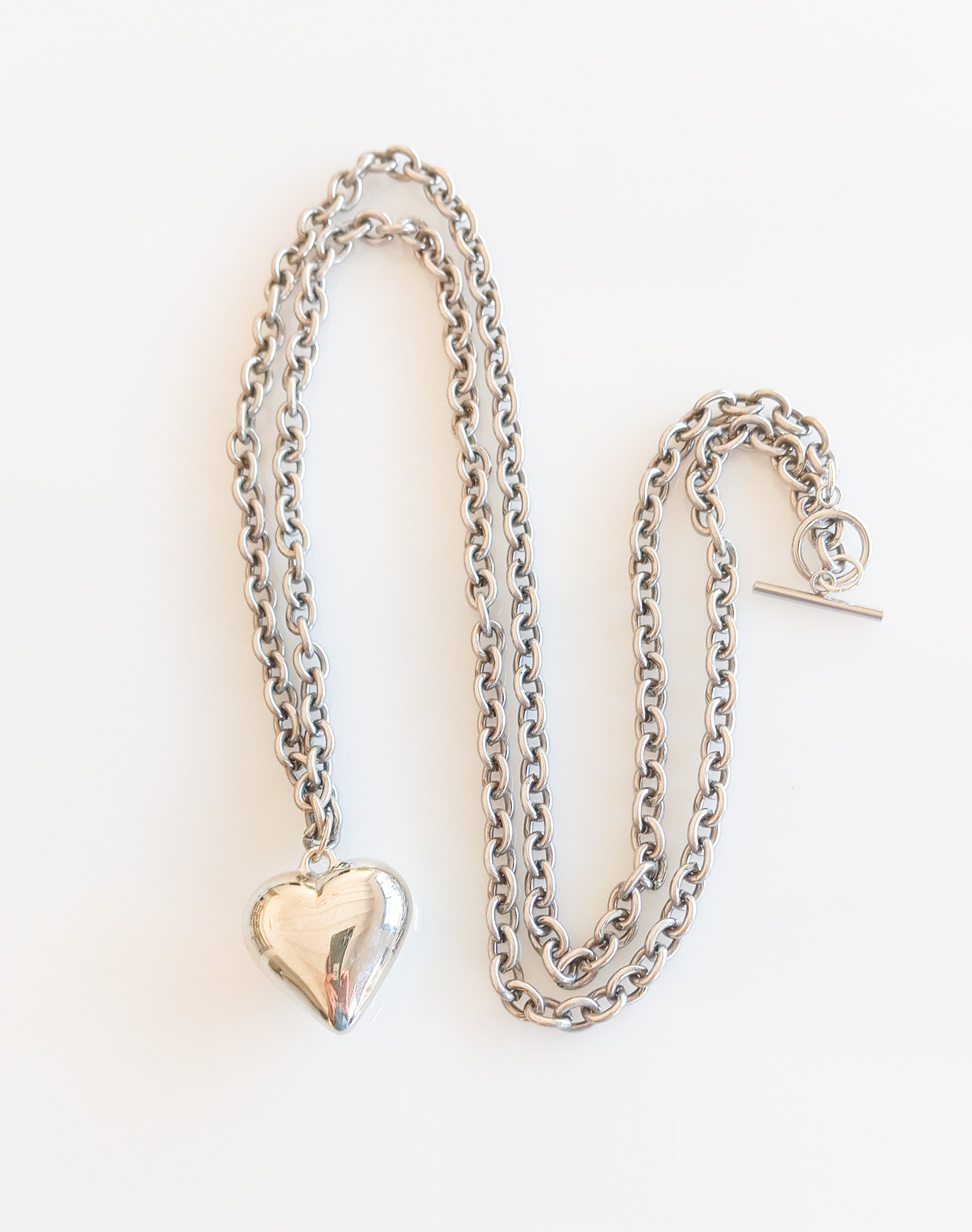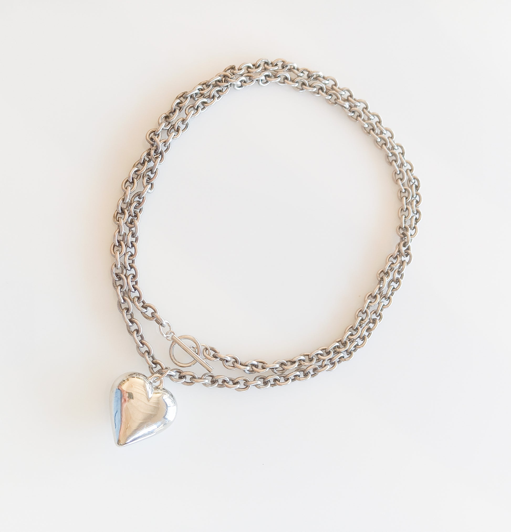 לב כסוף גדול על שרשרת ארוכה מוכספת עם סוגר טוגל