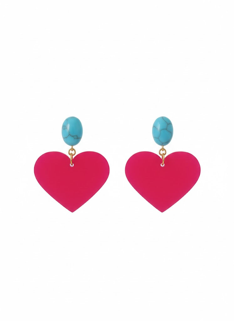 עגילים תלויים כפתור טורקיז אובל ולב וורוד פוקסיה גדול