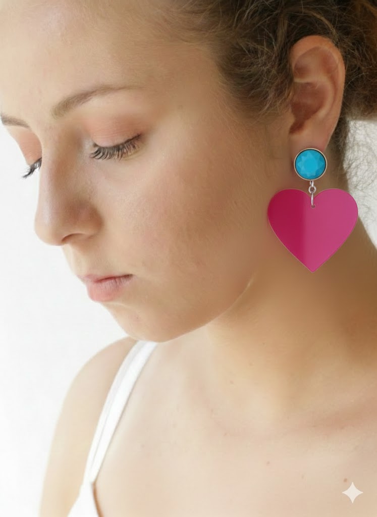 העגיל בנוי מכפתור אובלי בטורקיז (STUD) שיושב על האוזן, עם אביזר עבור חור לאוזן, וממנו תלוי תליון לב שטוח בוורוד פוקסיה
