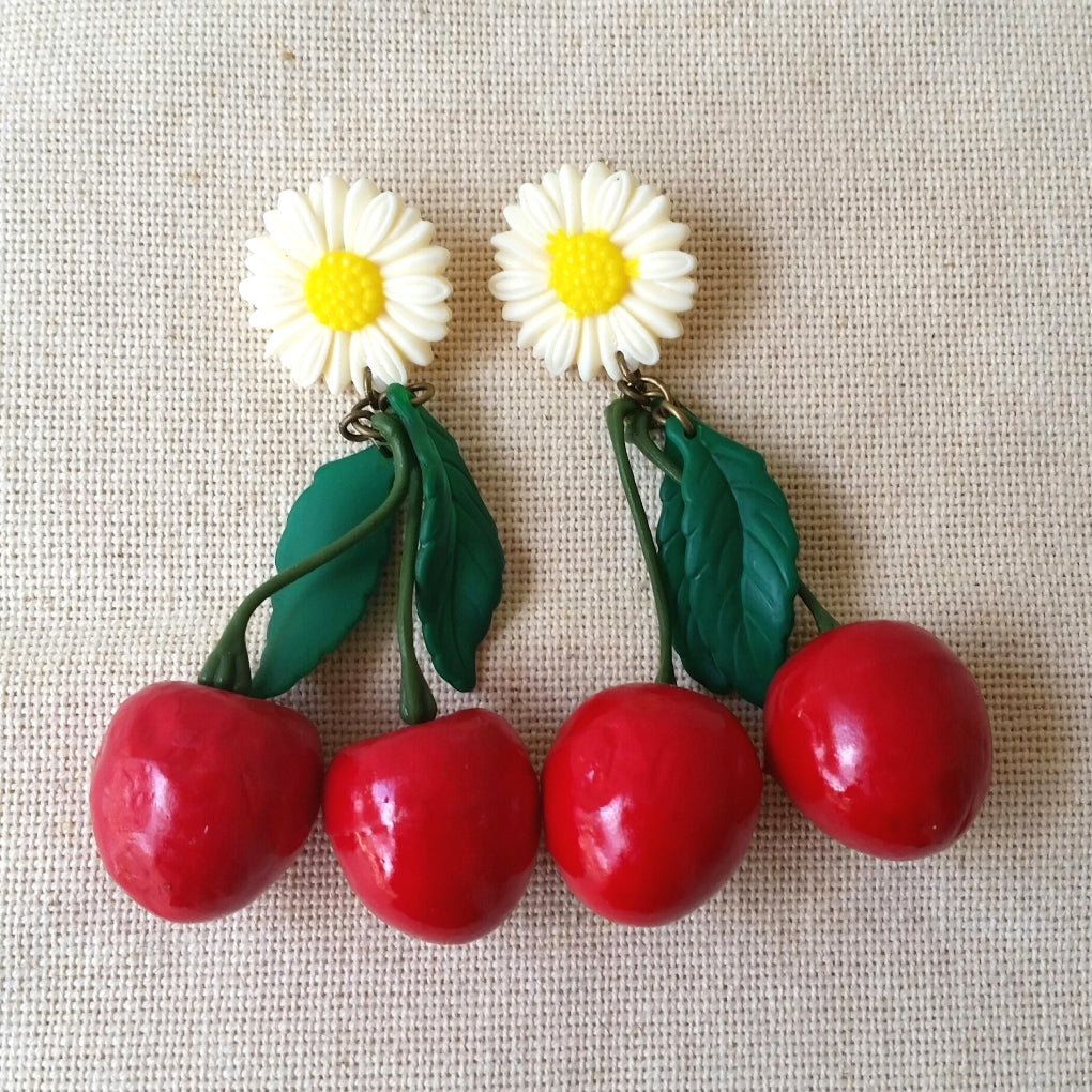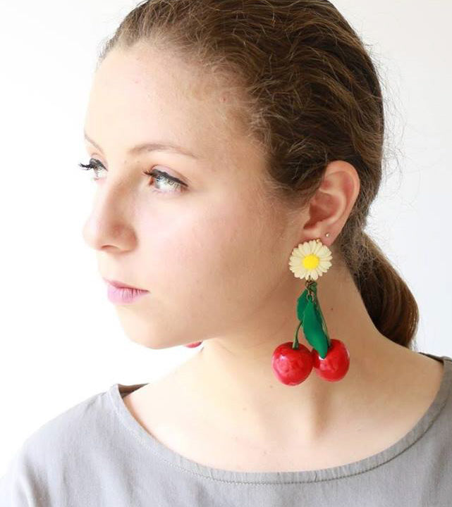 זוג עגילים עם דובדבנים ועלים ירוקים. עגילי נוכחות בסגנון שנות ה-50. עגילים מלאי הומור לנשים עם סגנון מיוחד, בתוספת פרח חהחרצית בלבן וצהוב.