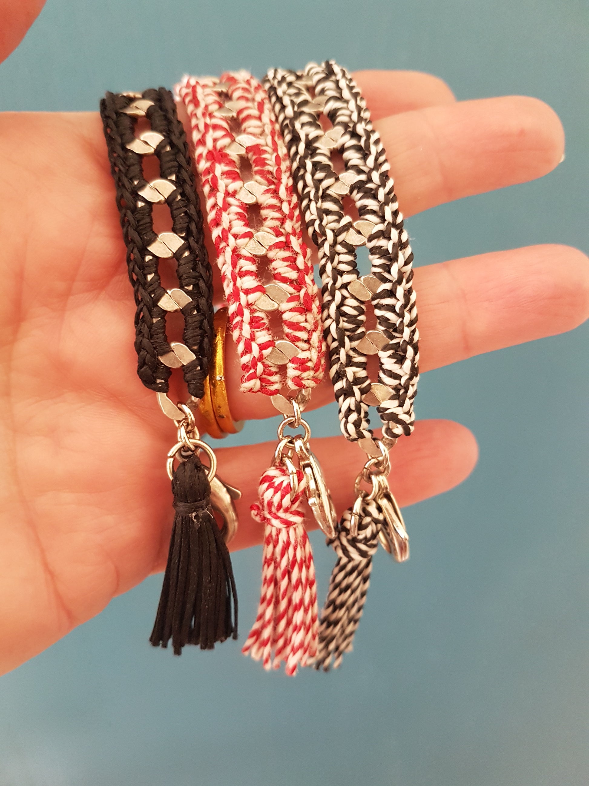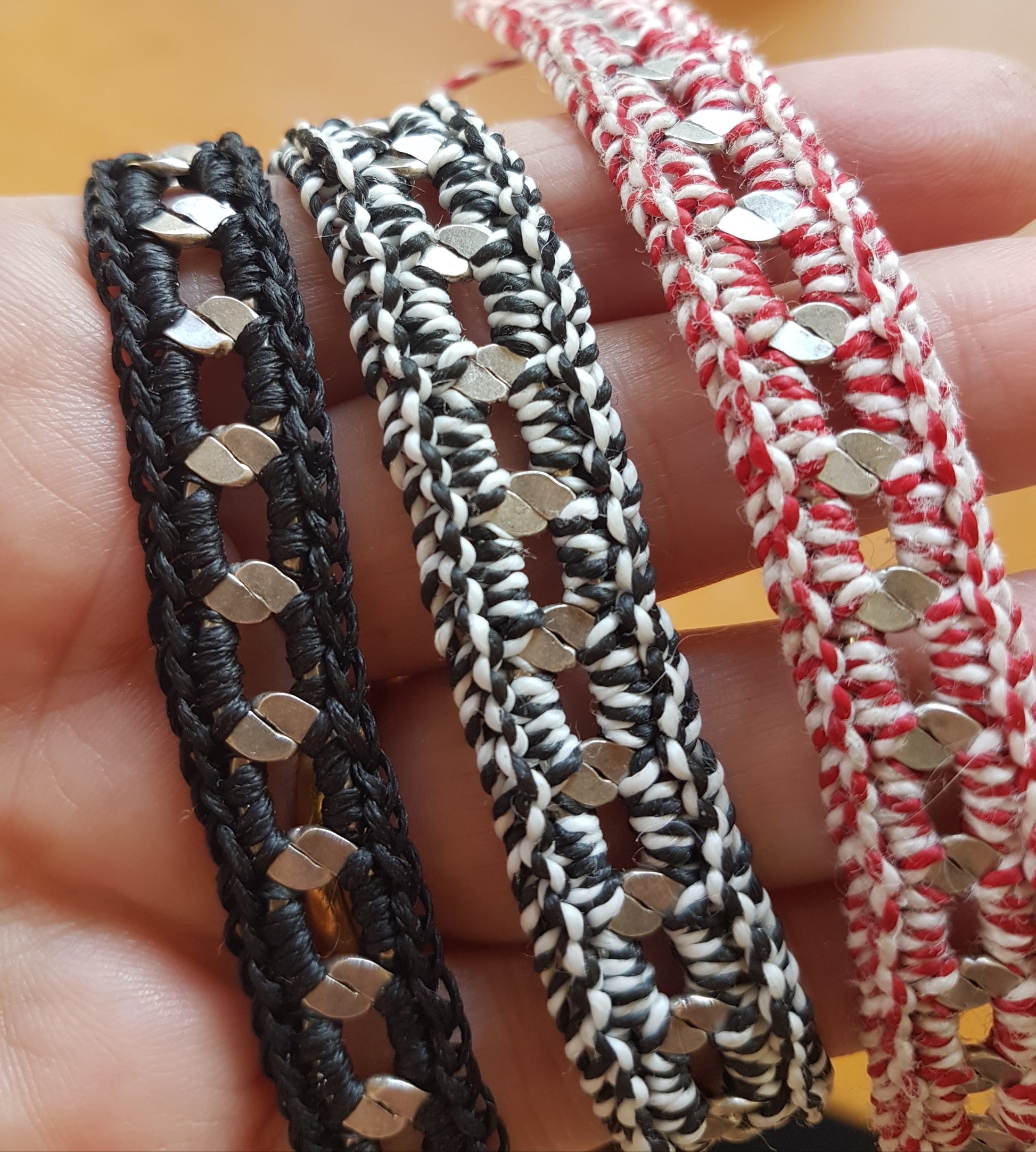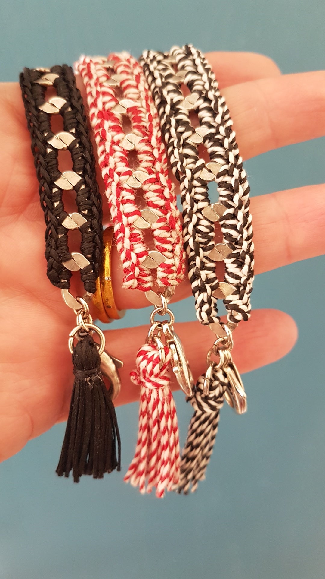 צמיד מיוחד בעבודת יד משרשרת מתכת מצופה כסף, סרוגה ביד עם חוט פוליאסטר מצופה שעווה. עמיד במים. מתנה נהדרת!