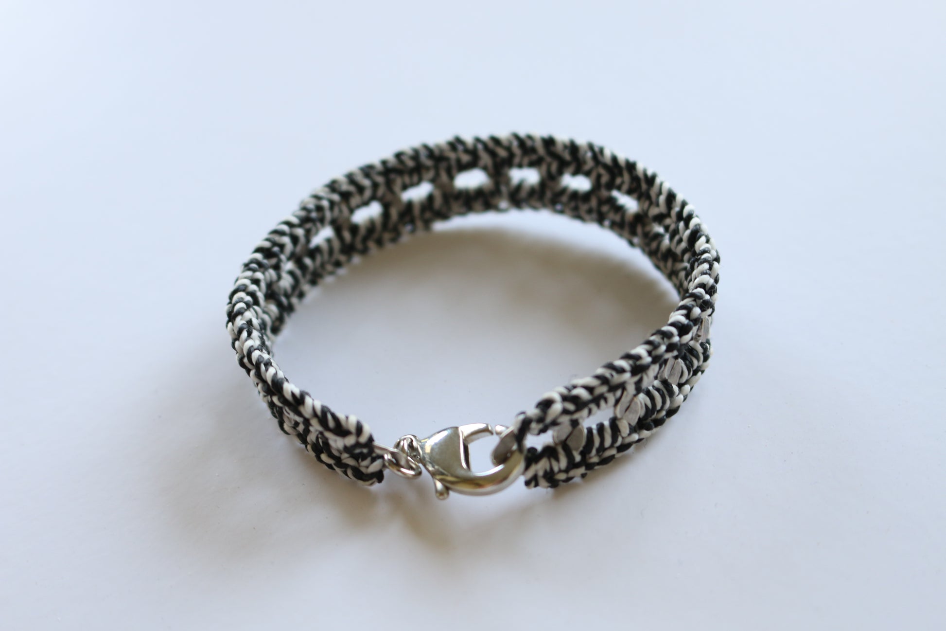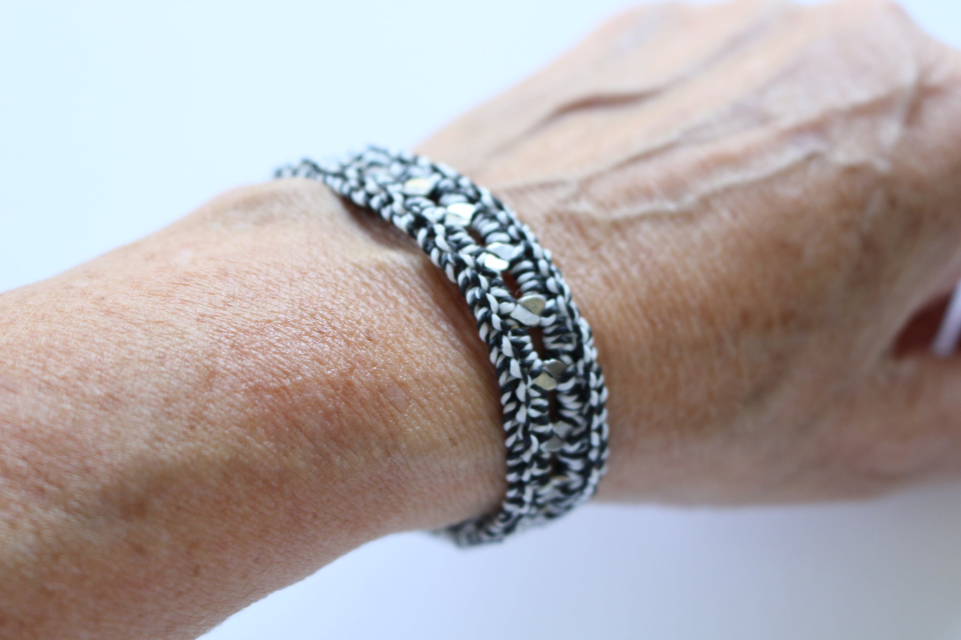 צמיד חוליות יוניסקס, מתאים לגבר וגם לאשה. צמיד קלוע בסריגת קרושה על שרשרת חוליות גמישה ממתכת.