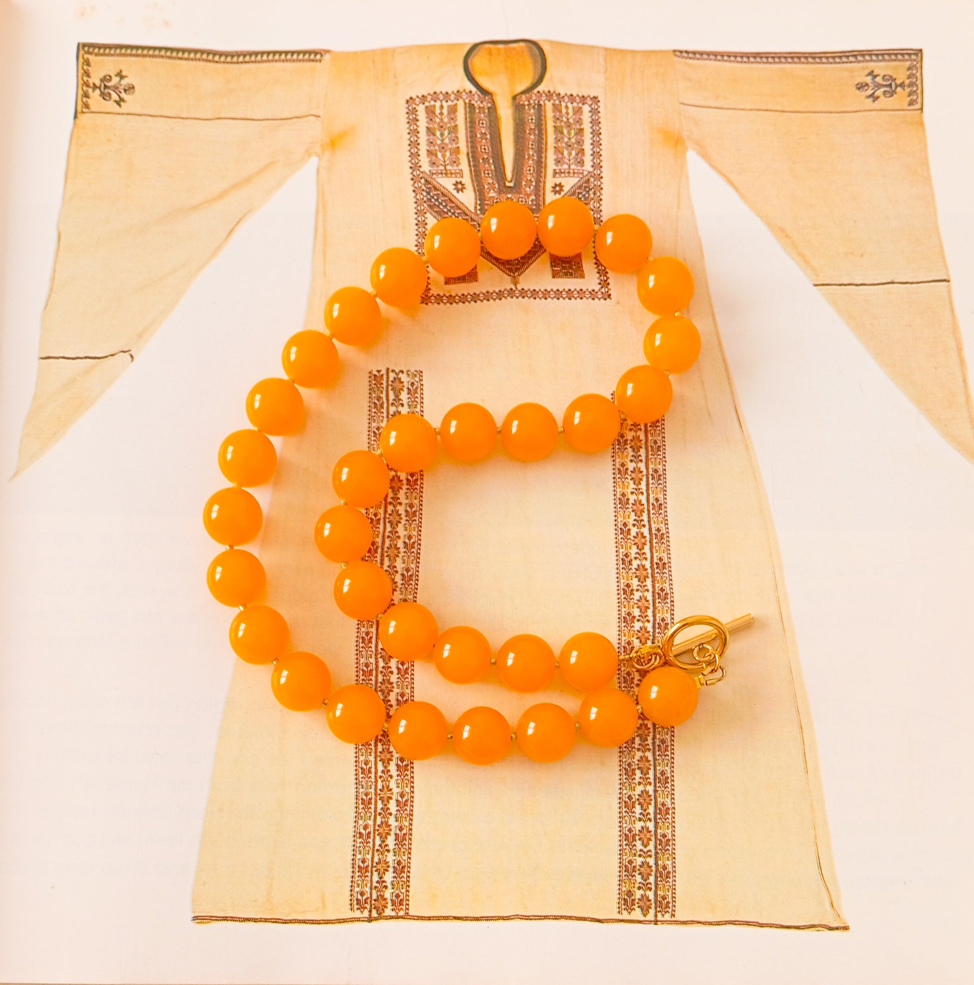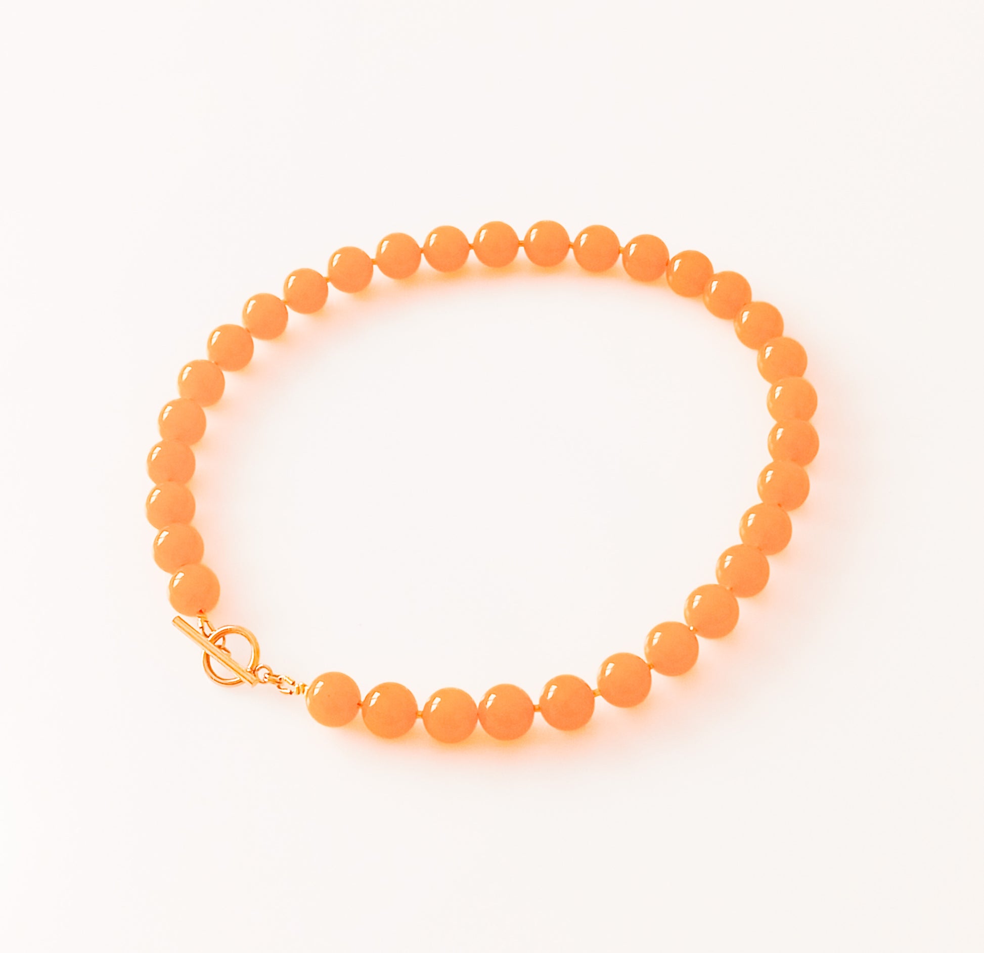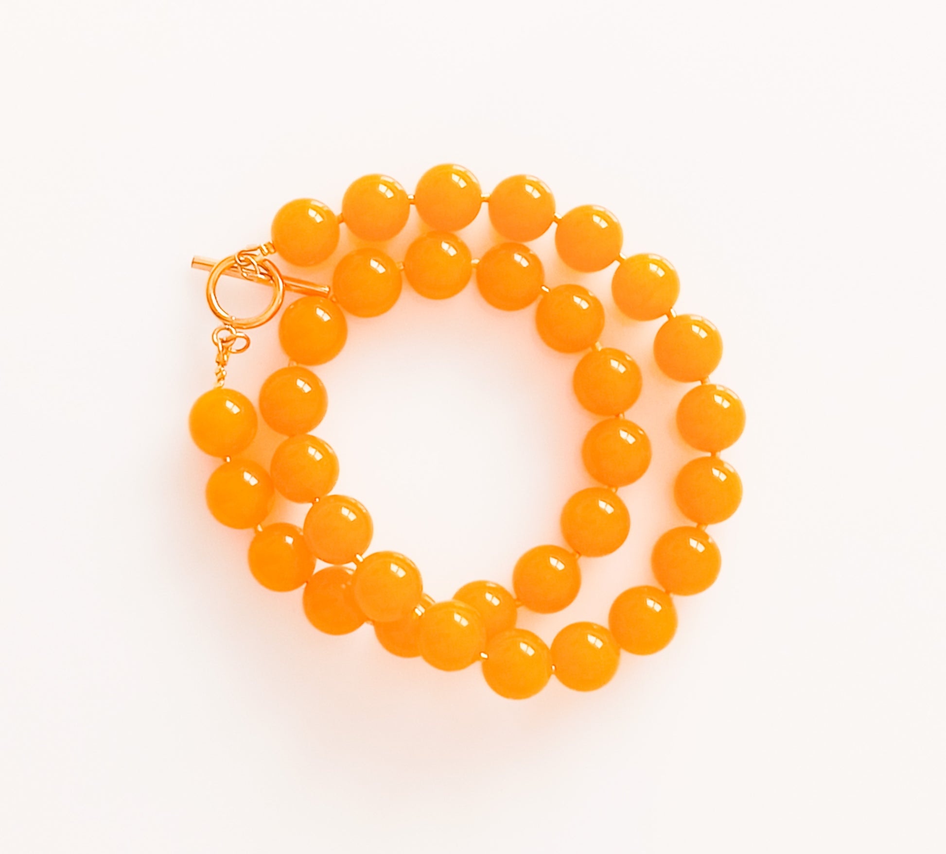 מחרוזת עשויה חרוזי ג'ייד בצבע צהוב ענברי, וחרוזי מיוקי קטנים כתומים. סגירת טוגל קדמית. אביזרי מתכת בציפוי זהוב. המחרוזת נענדת קרובה לצוואר.