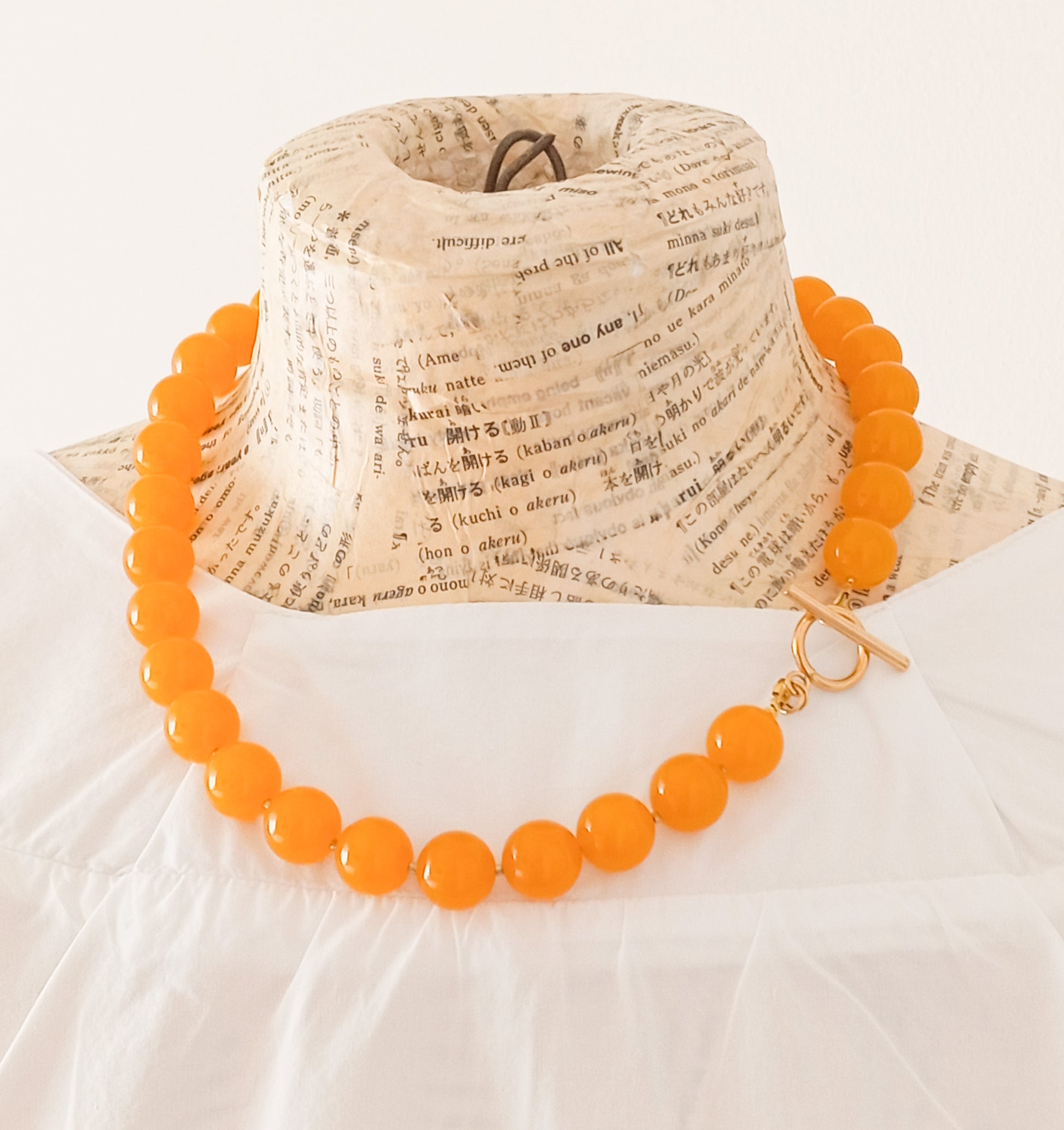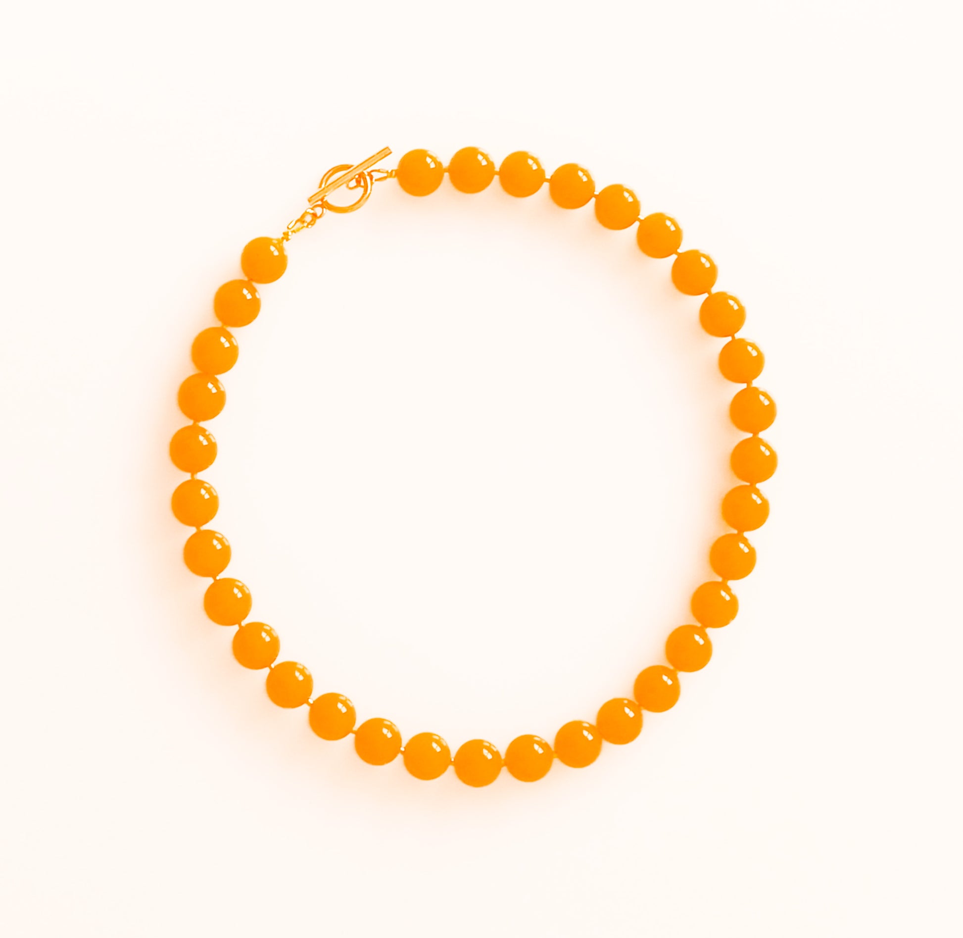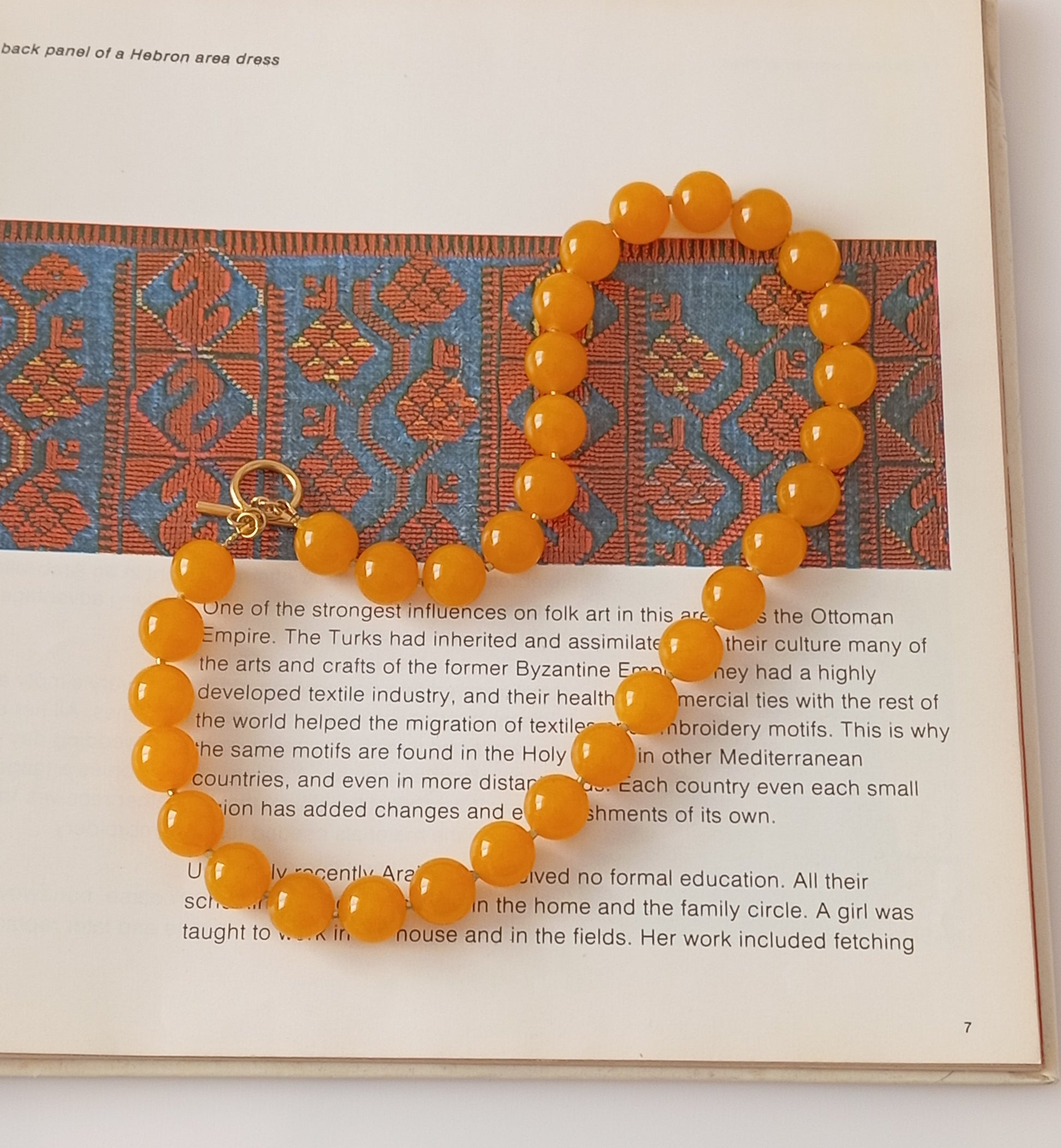 מחרוזת עשויה חרוזי ג'ייד בצבע צהוב ענברי, וחרוזי מיוקי קטנים כתומים. סגירת טוגל קדמית. אביזרי מתכת בציפוי זהוב. המחרוזת נענדת קרובה לצוואר.