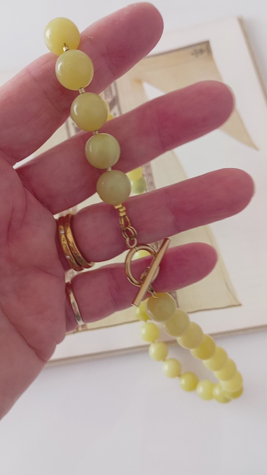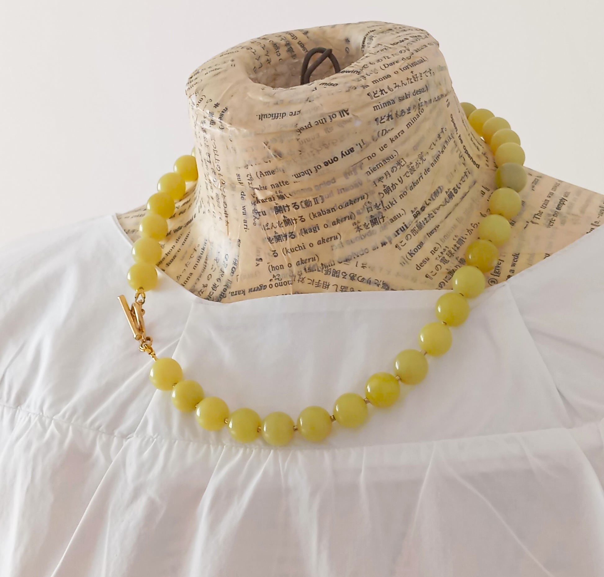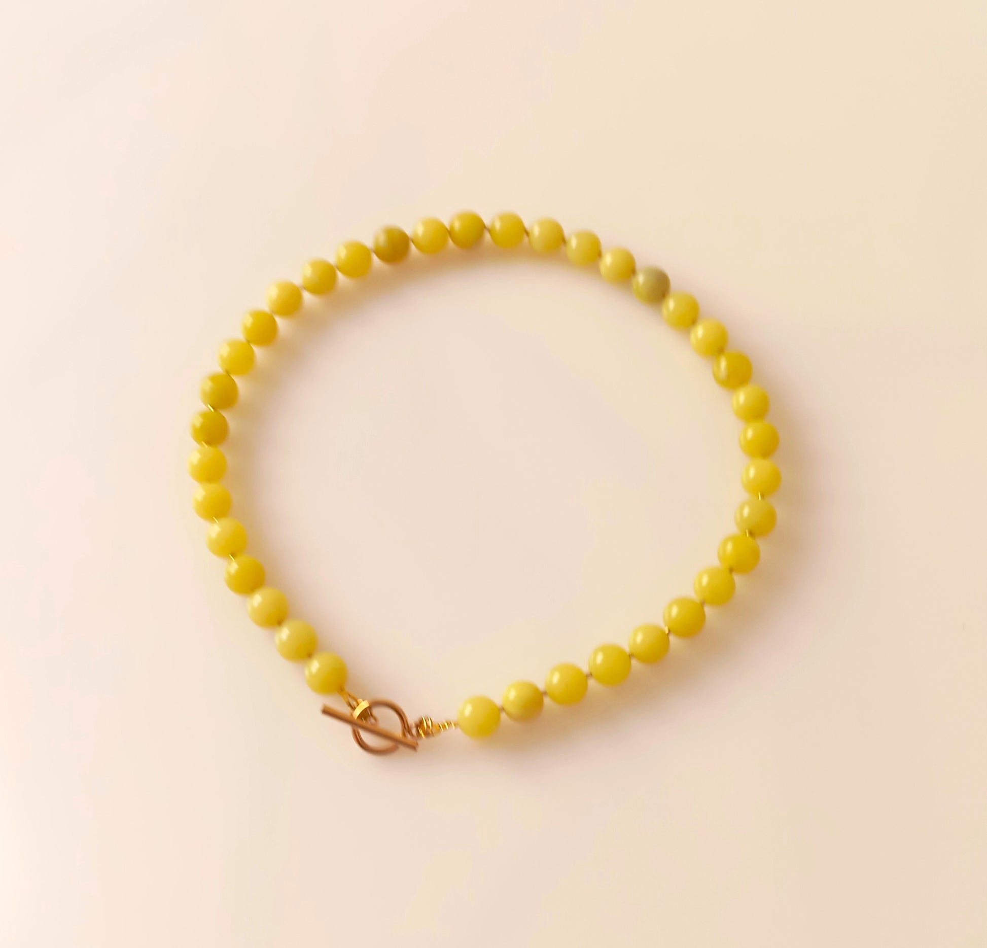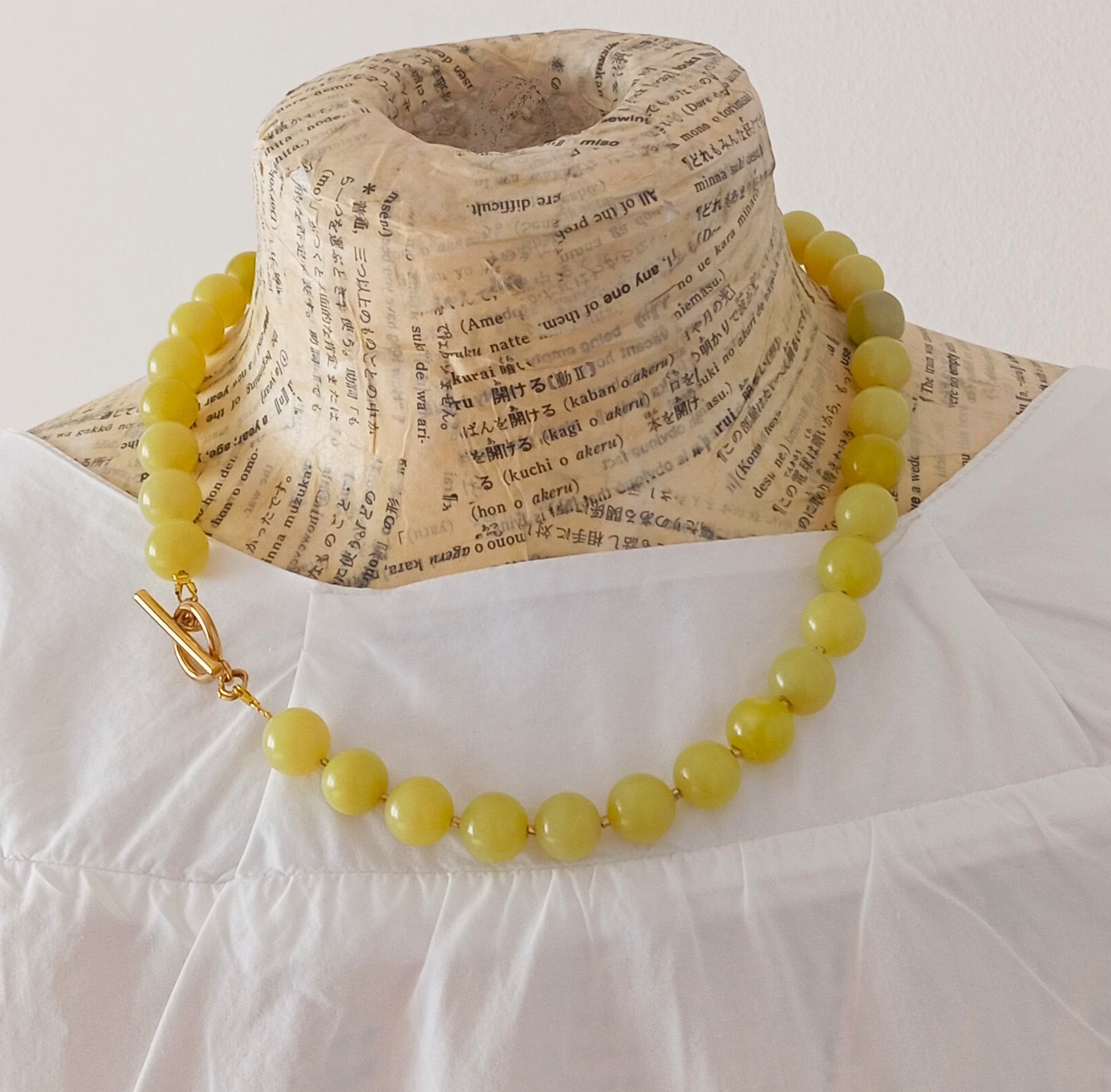 מחרוזת עשויה חרוזי ג'ייד בצבע ירוק ליים, וחרוזי מיוקי קטנים זהובים. סגירת טוגל קדמית. אביזרי מתכת בציפוי זהוב. המחרוזת נענדת קרובה לצוואר.