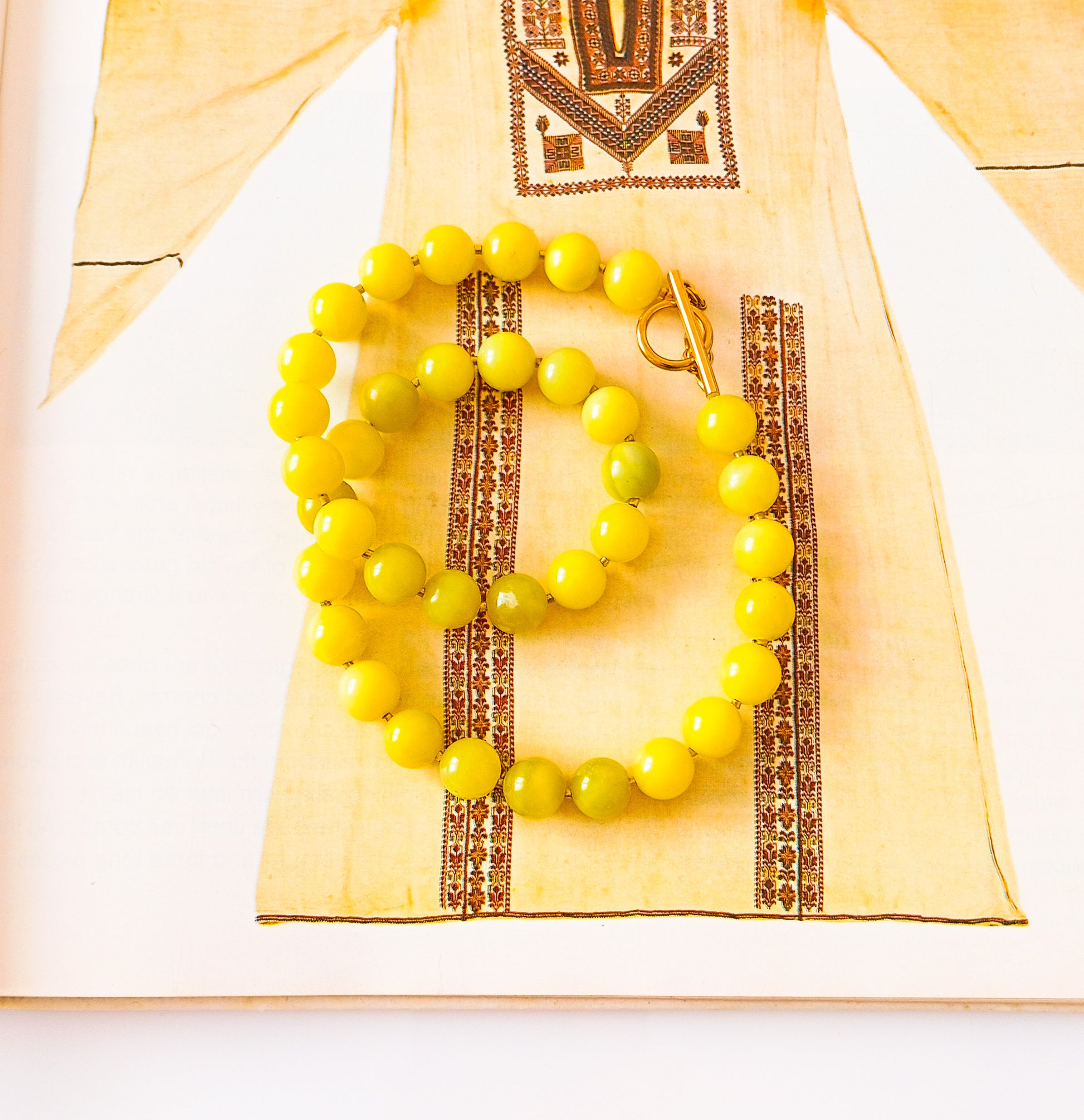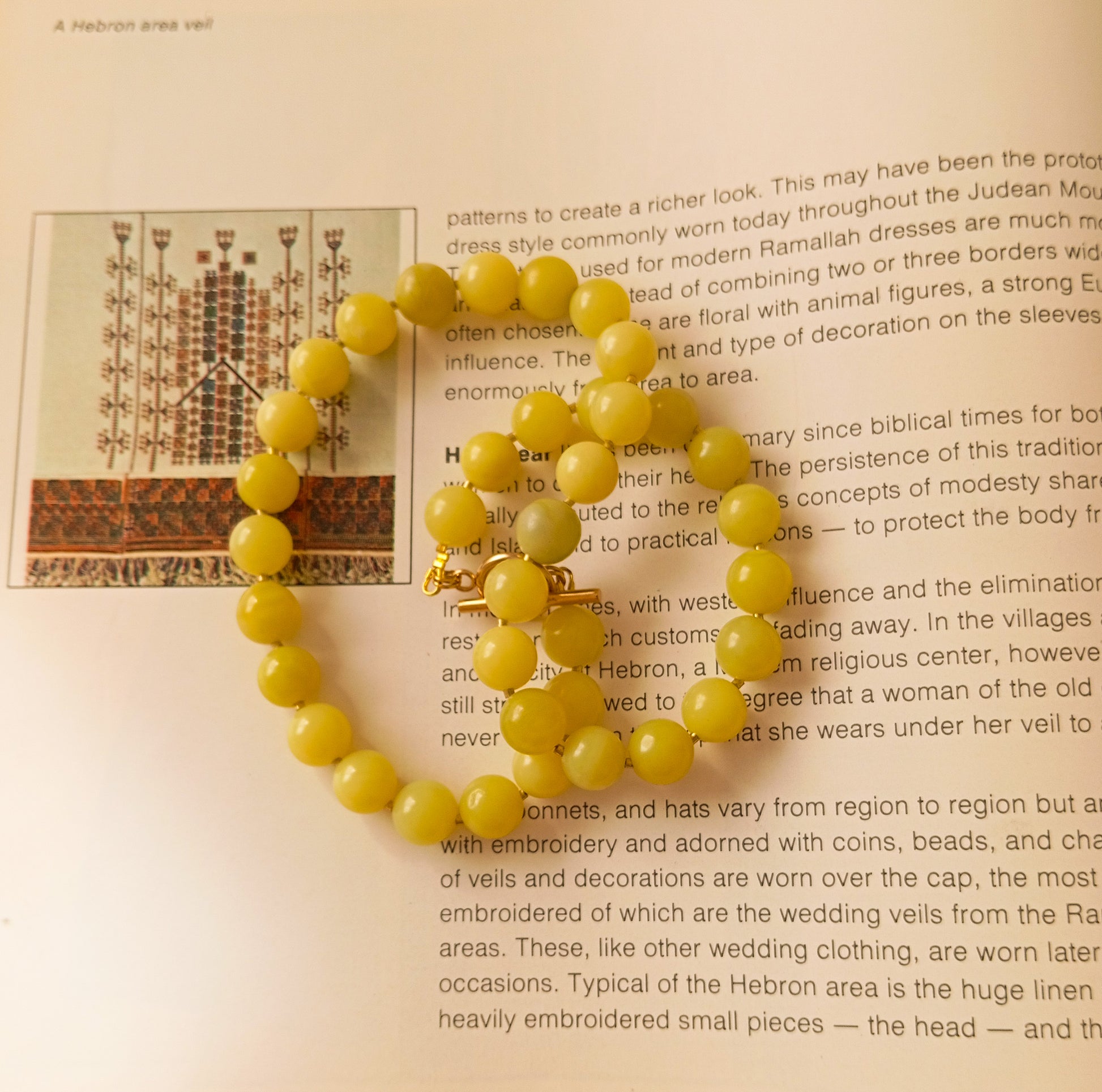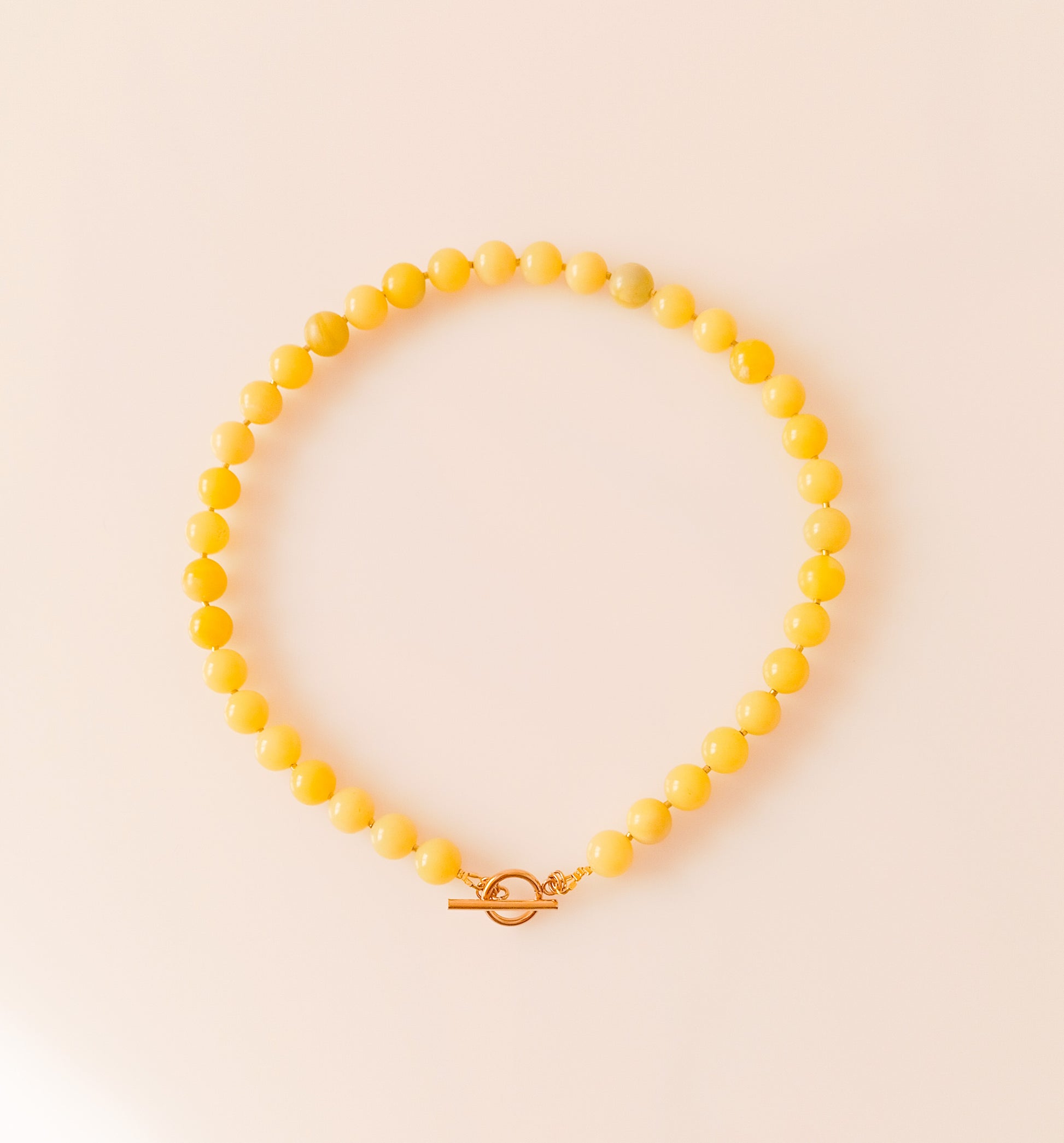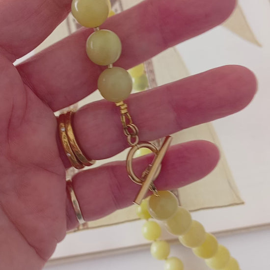 מחרוזת עשויה חרוזי ג'ייד בצבע ירוק ליים, וחרוזי מיוקי קטנים זהובים. סגירת טוגל קדמית. אביזרי מתכת בציפוי זהוב. המחרוזת נענדת קרובה לצוואר.