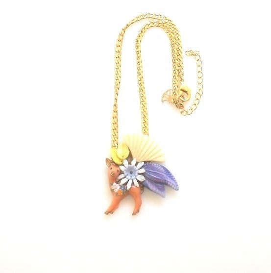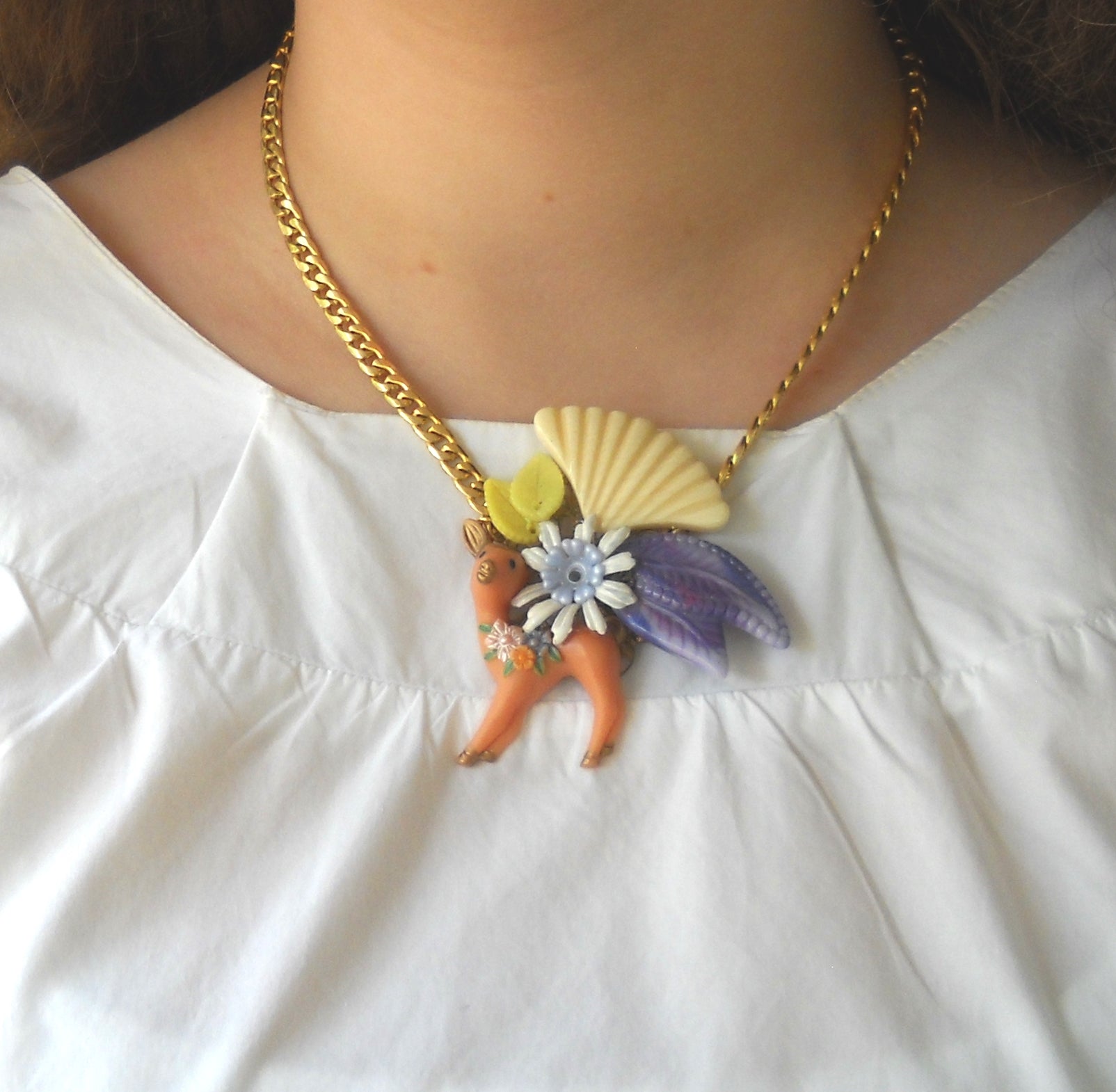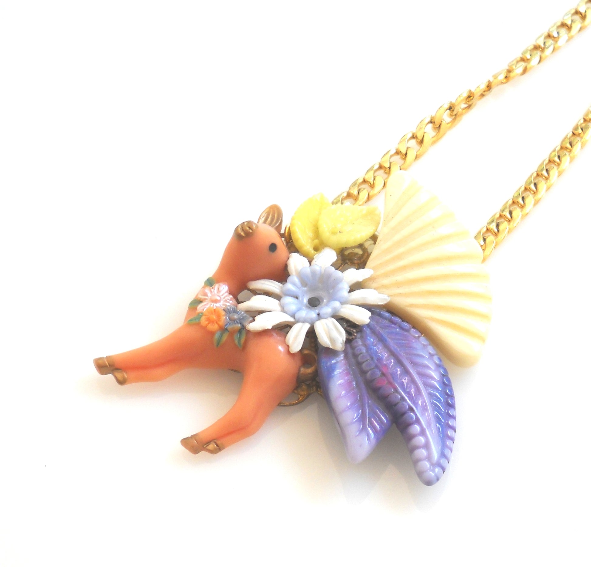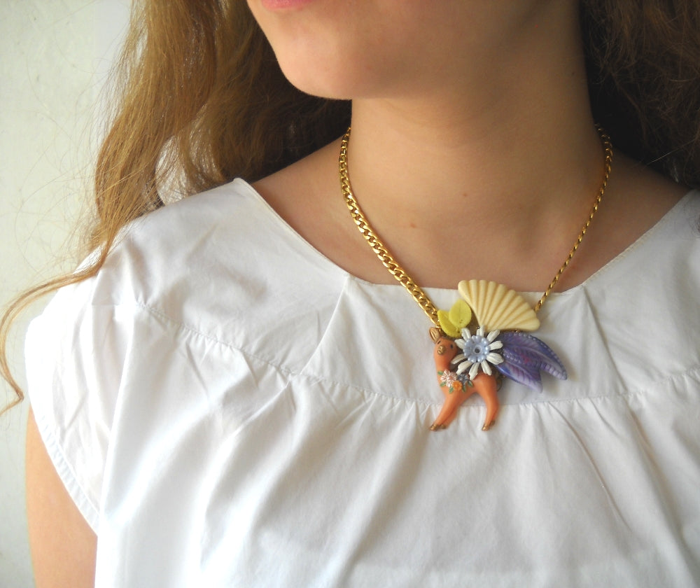 שרשרת מלאה הומור ונאיביות, קולאז' פרחוני עם דמות במבי מתוקה. התליון במידה בינונית, בצבעוניות פסטלית רגועה, אבל לא ניתן להתעלם ממנו.