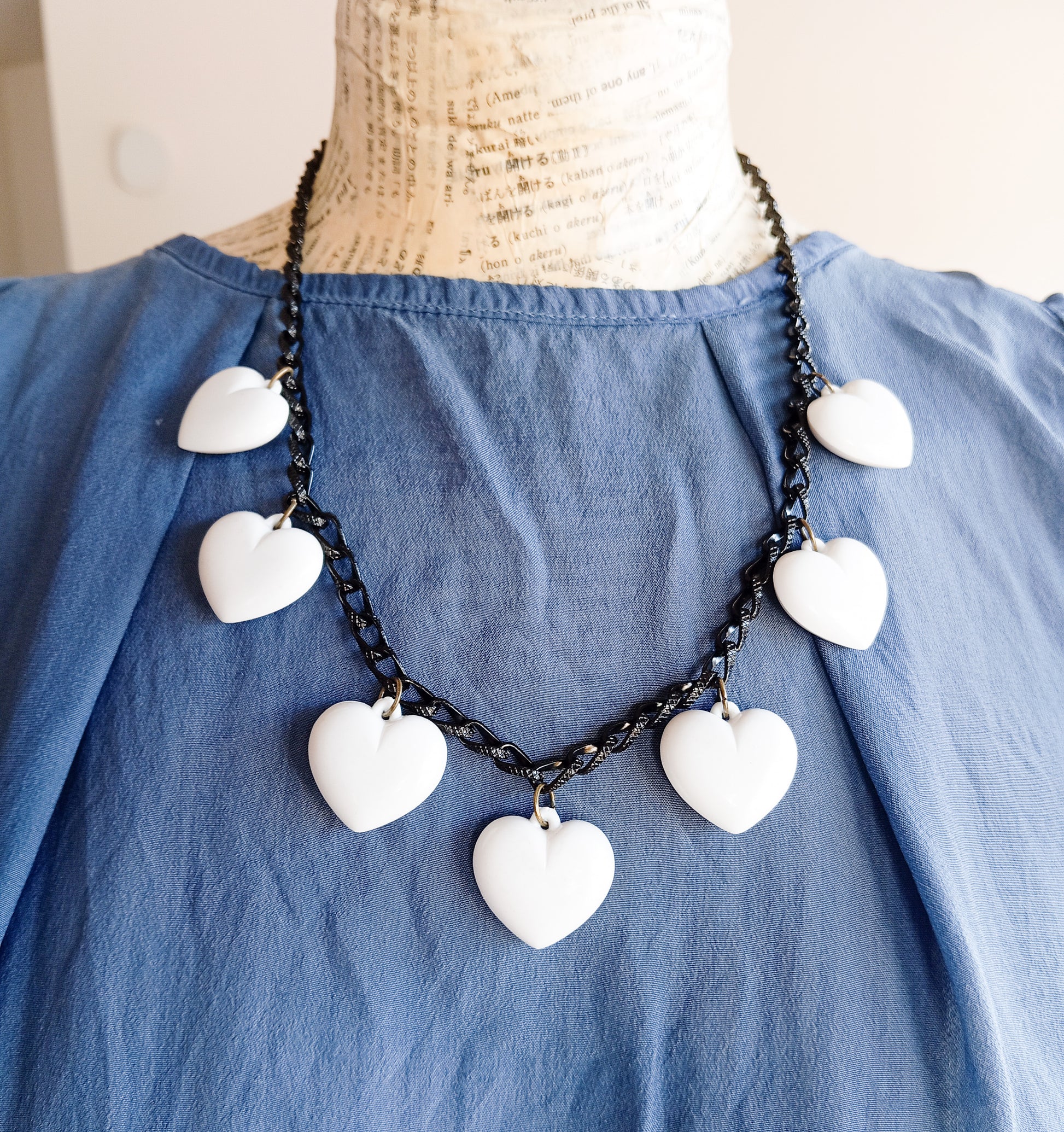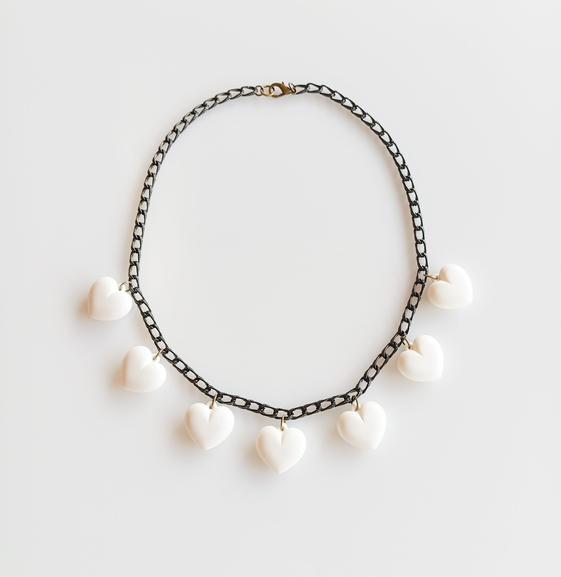 שרשרת נוכחות מונוכרומטית. שרשרת חוליות בציפוי שחור עם 7 תליוני לב שמנמנים מפלסטיק וינטאג'.