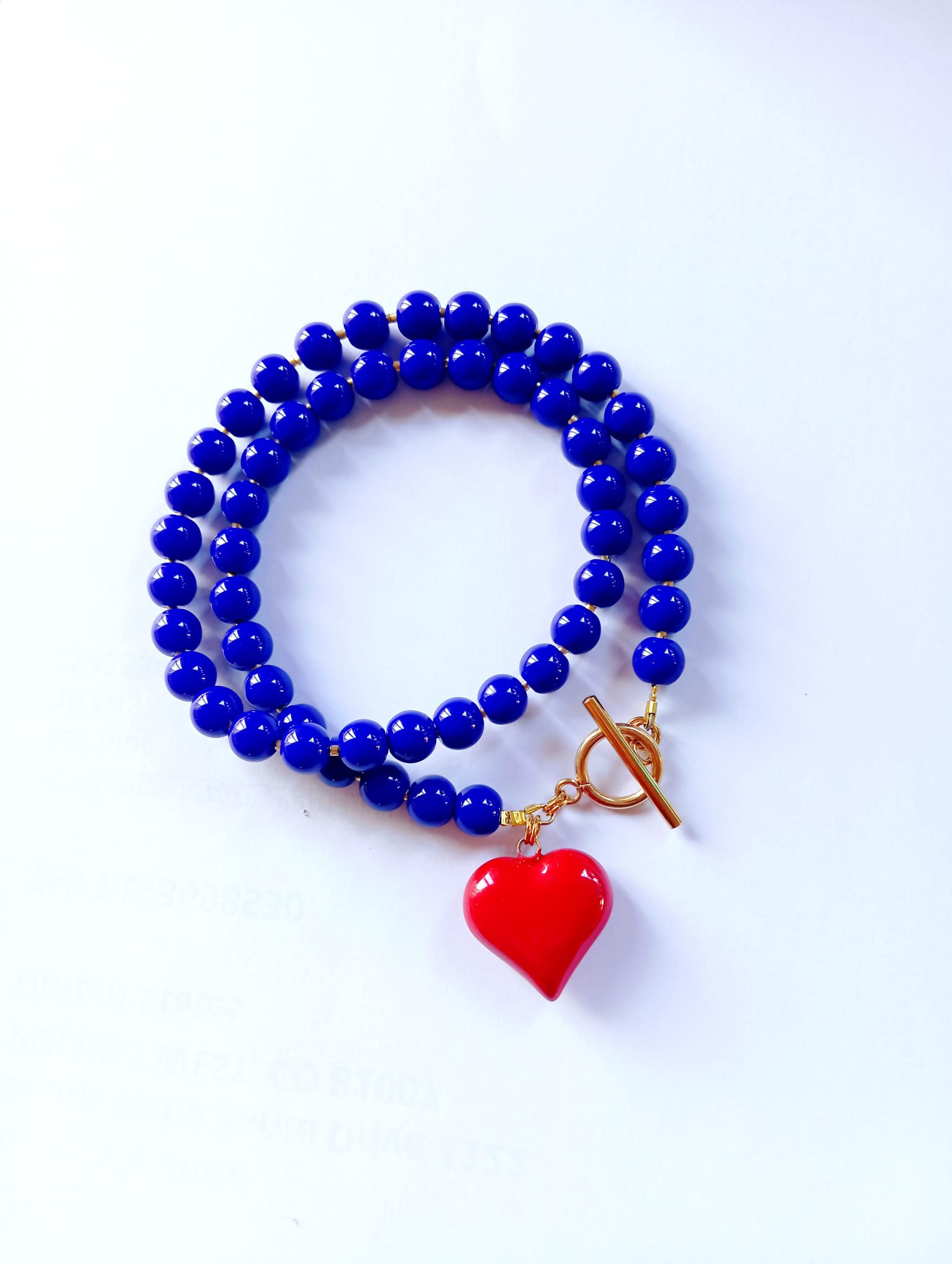מחרוזת עשויה חרוזי זכוכית בצבע כחול כהה וחרוזי מיוקי קטנים זהובים. תליון לב תלת מימדי בציפוי אדום וסגירת טוגל קדמית. אביזרי מתכת בציפוי זהוב.