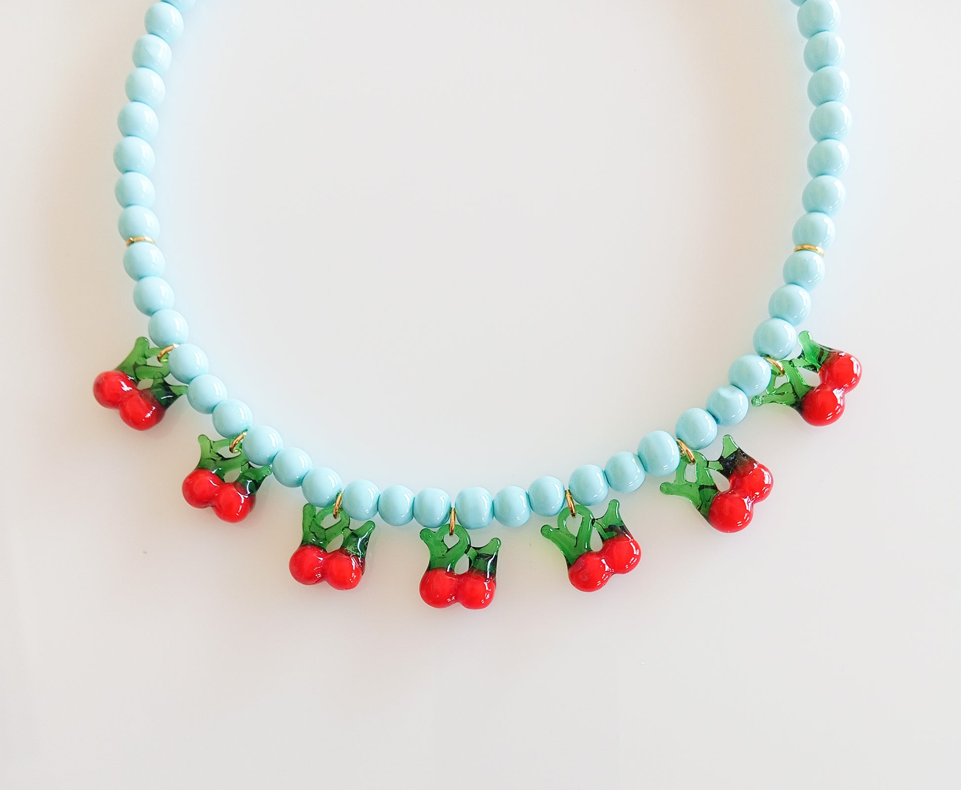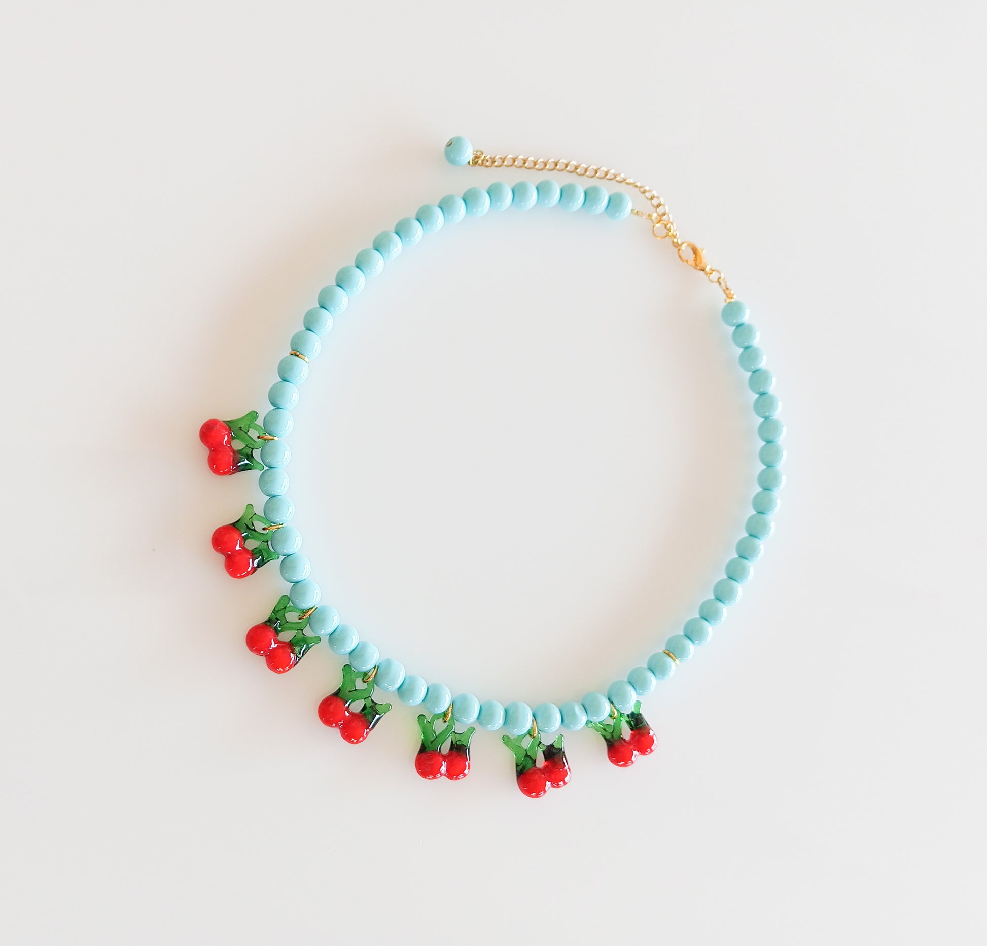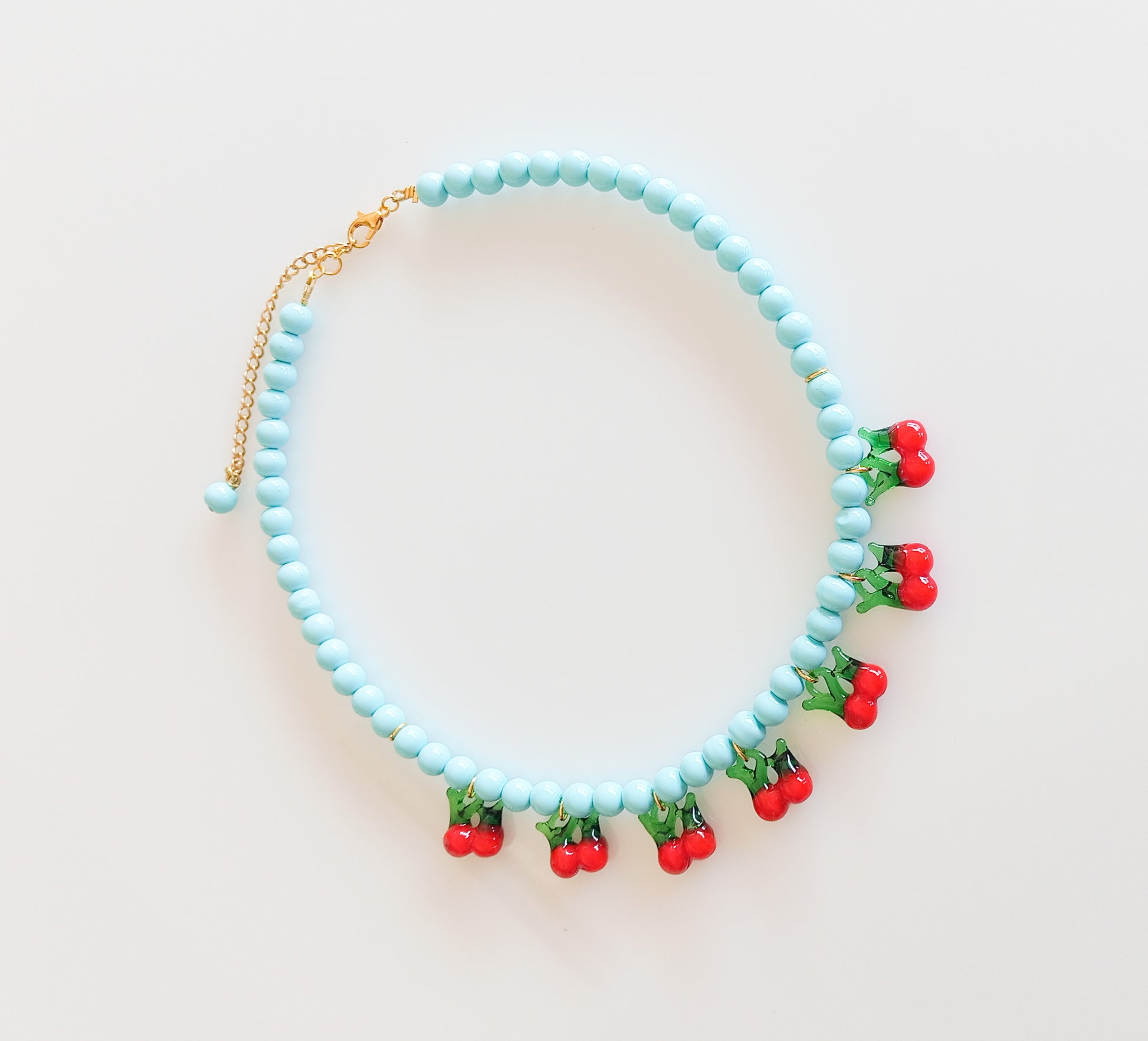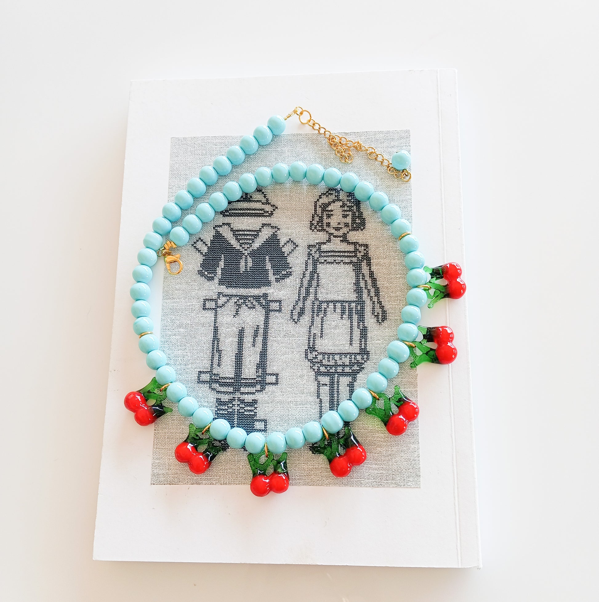 שרשרת רומנטית עשויה חרוזי זכוכית בצבע תכלת טורקיז בהיר, עם תליוני דובדבנים עשויים זכוכית בעבודת יד (LAMPWORK). אם סגנון נקי וטיפה מיושן מדבר ללבך – זו השרשרת שלך. מאזכרת עולם ישן של חלומות ילדות.