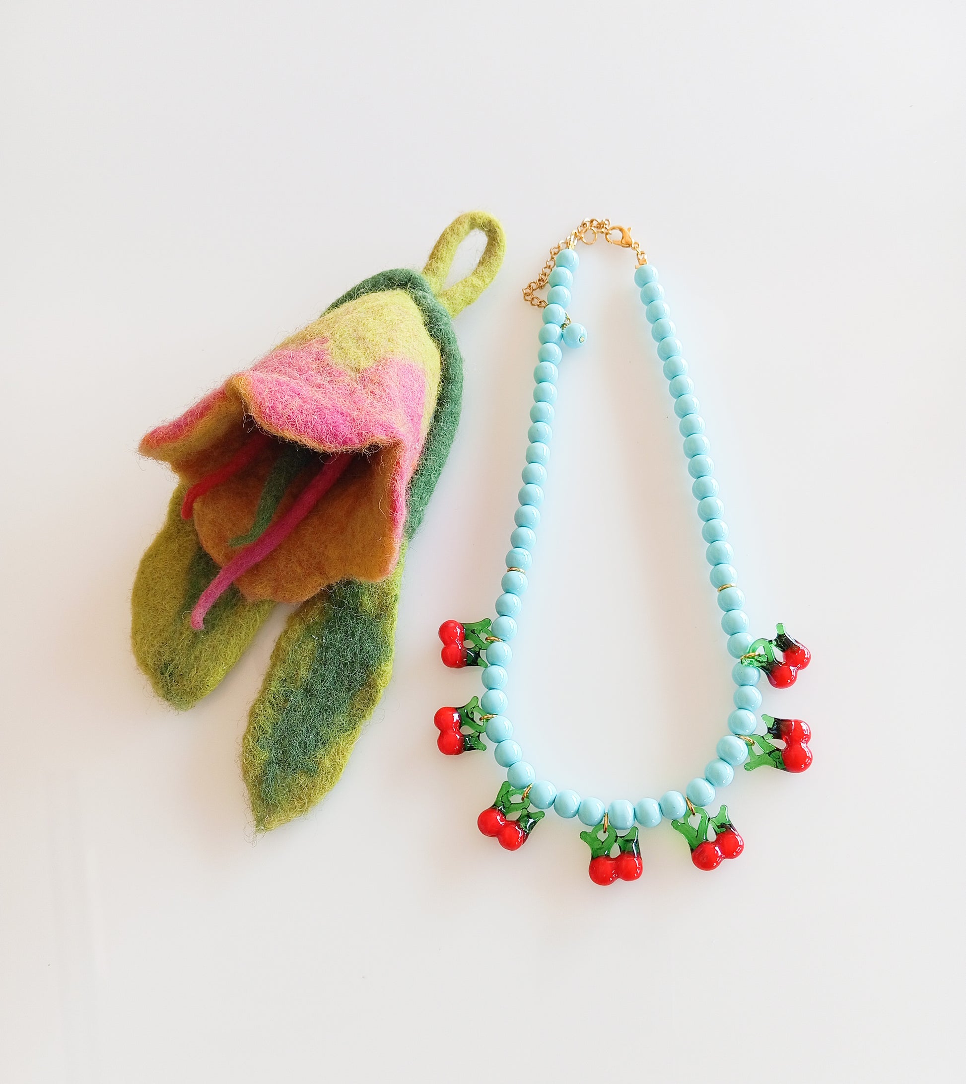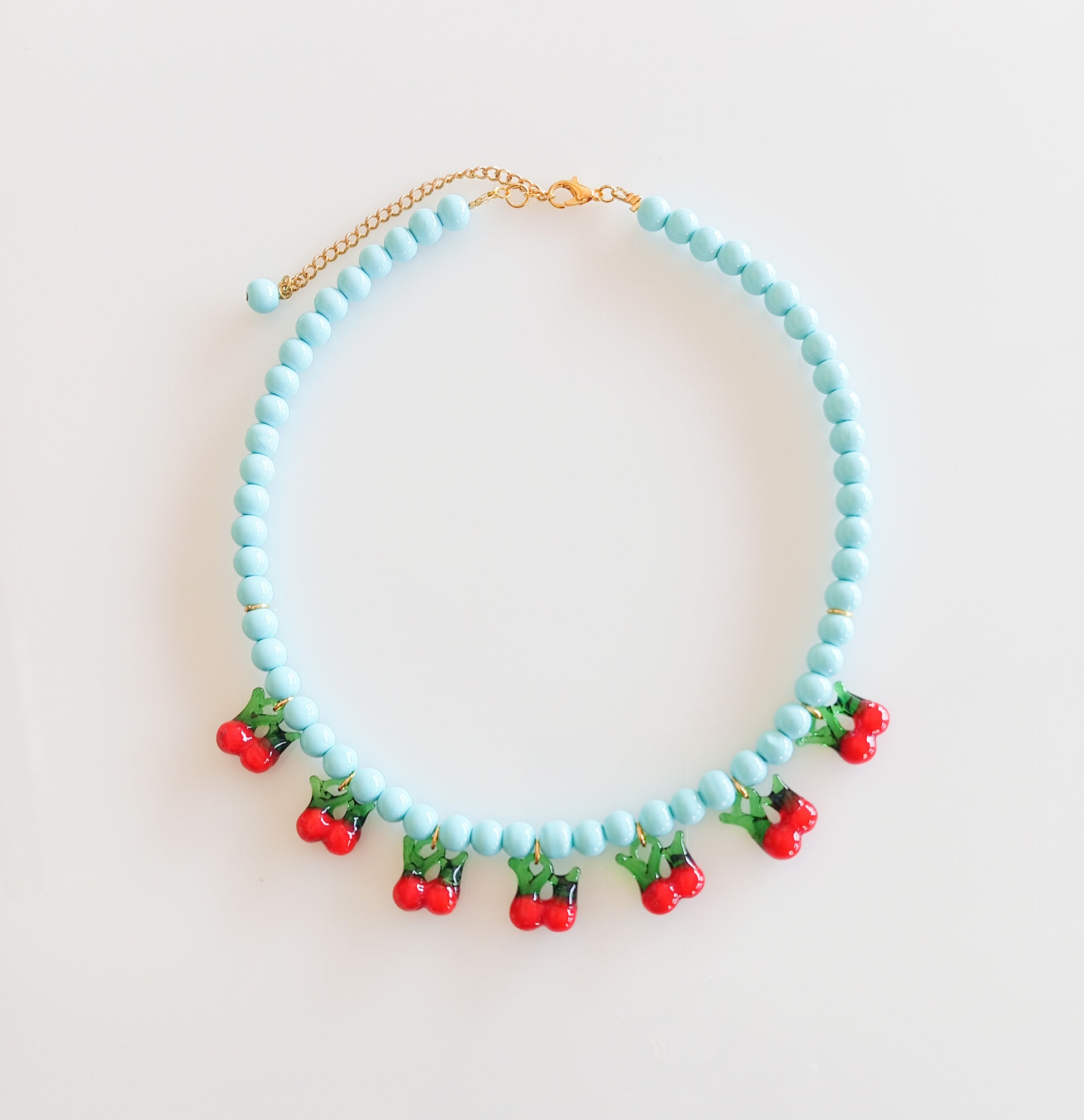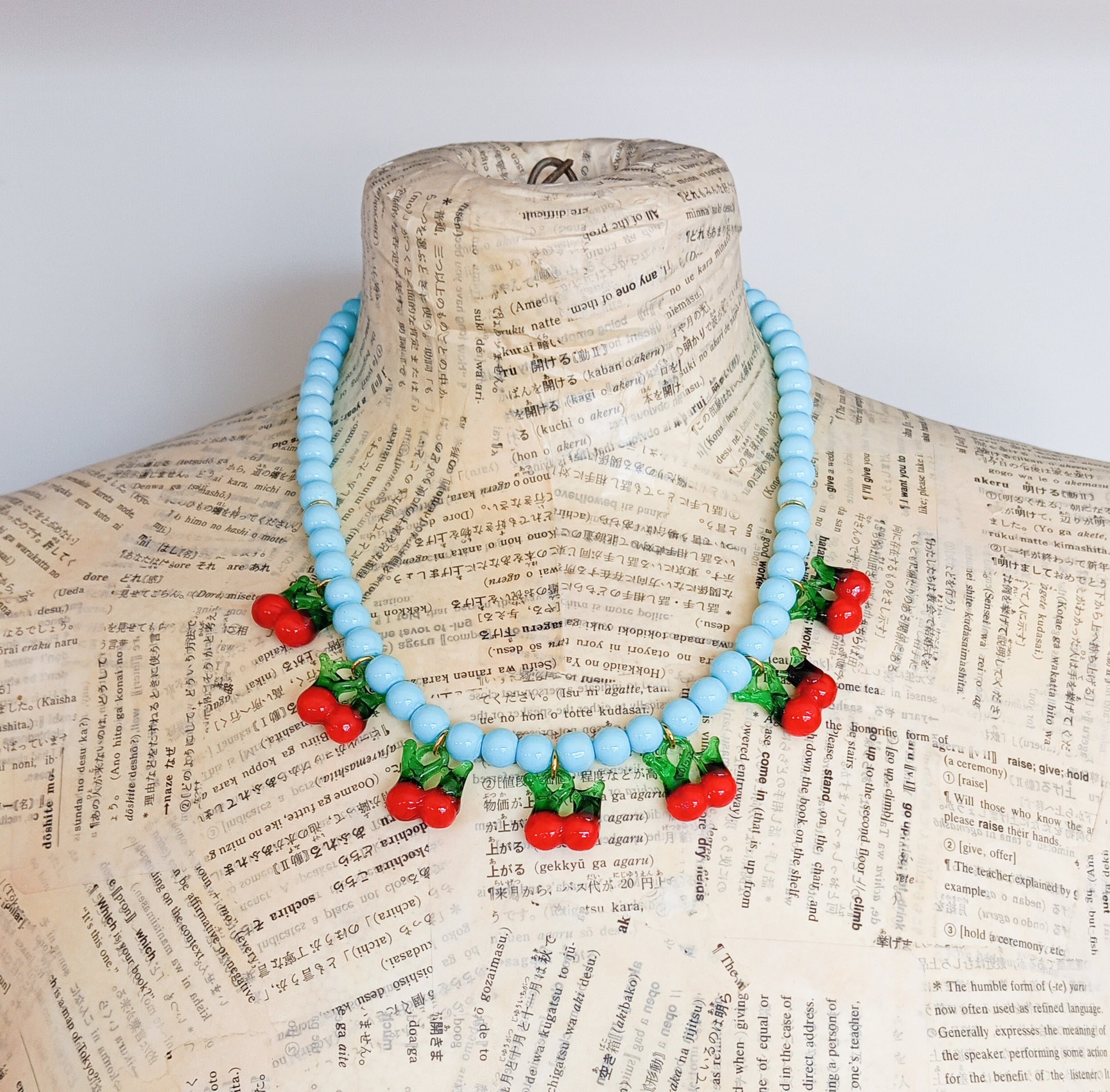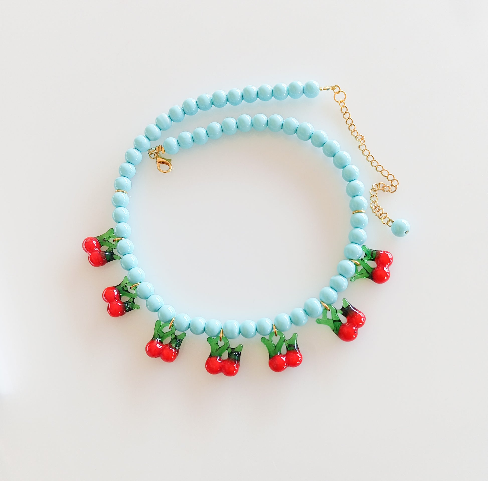 שרשרת רומנטית עשויה חרוזי זכוכית בצבע תכלת טורקיז בהיר, עם תליוני דובדבנים עשויים זכוכית בעבודת יד (LAMPWORK). אם סגנון נקי וטיפה מיושן מדבר ללבך – זו השרשרת שלך. מאזכרת עולם ישן של חלומות ילדות.