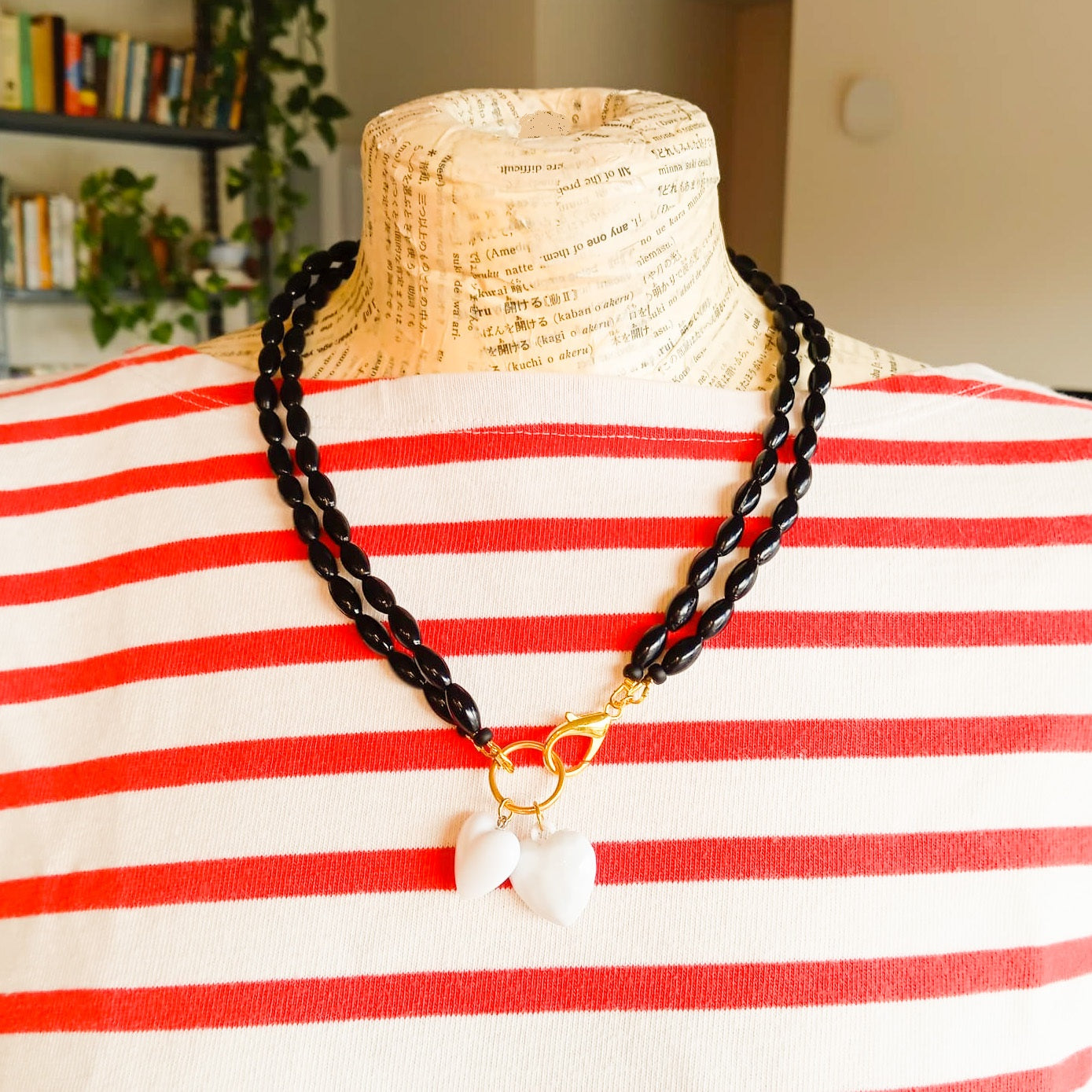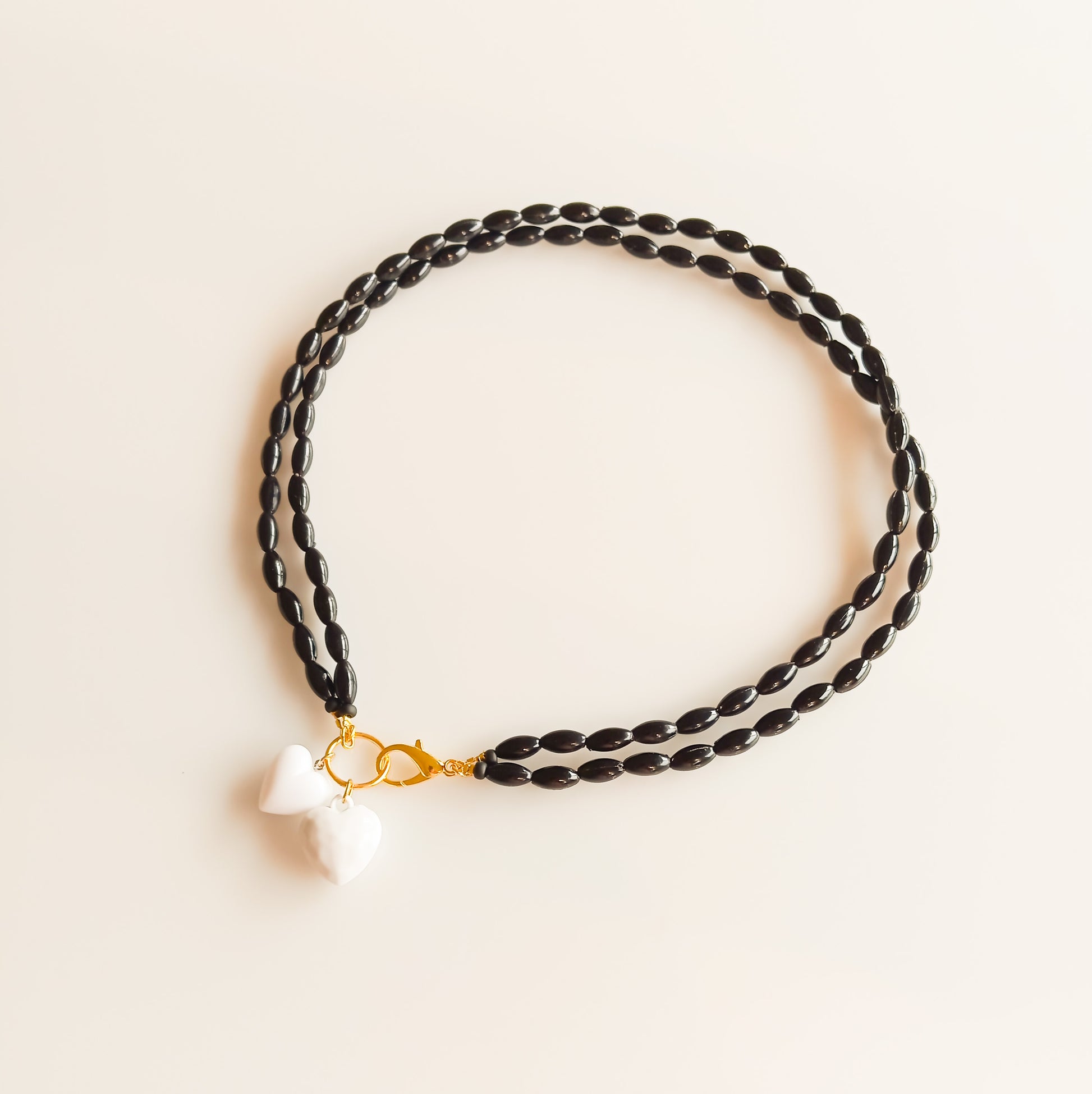 מחרוזת עשויה שתי שורות שלחרוזי אורז בצבע שחור. סגירה קדמית עם 2 תליוני לב לבנים וינטאג'.