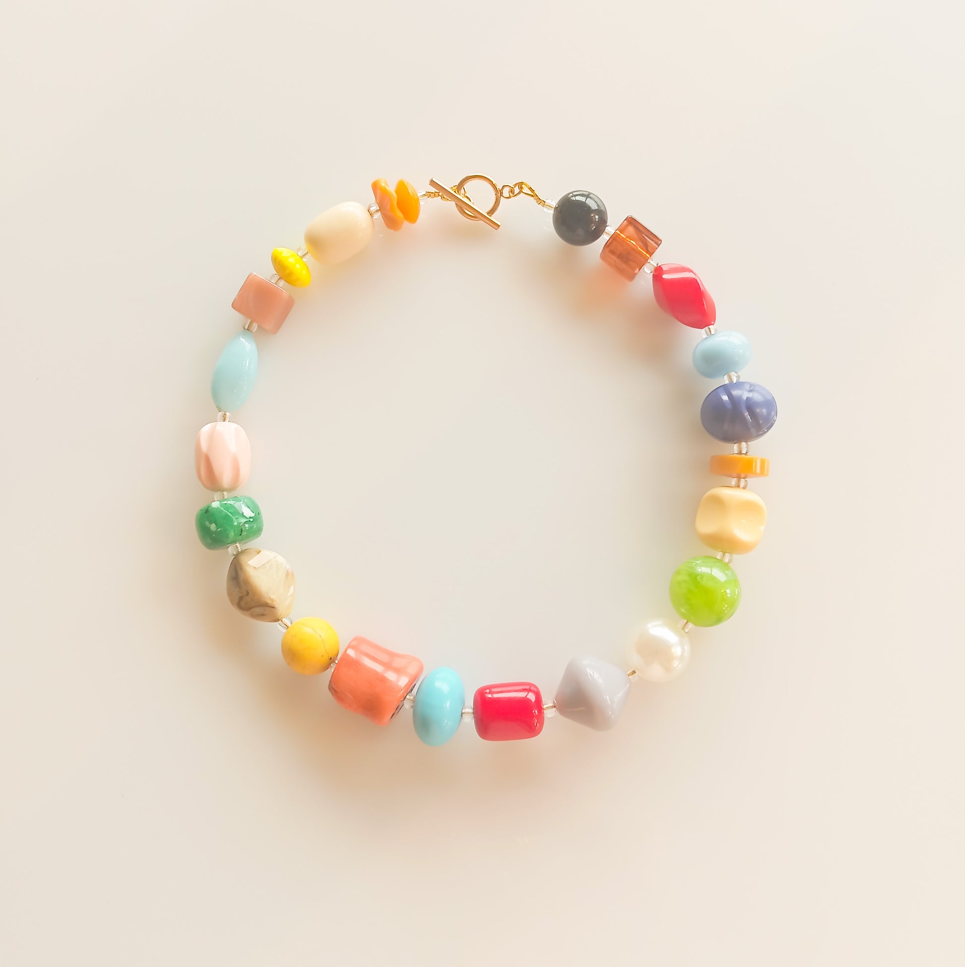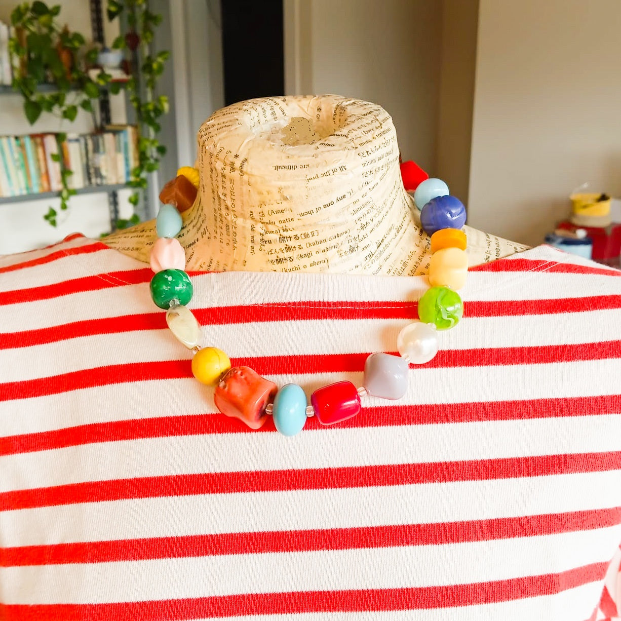 מחרוזת עשויה חרוזים צבעוניים גדולים מהאוסף הפרטי שלי, וחרוזי מיוקי קטנים שקופים. סגירת טוגל אחורית. אביזרי מתכת בציפוי זהוב. המחרוזת נענדת קרוב יחסית לצוואר.