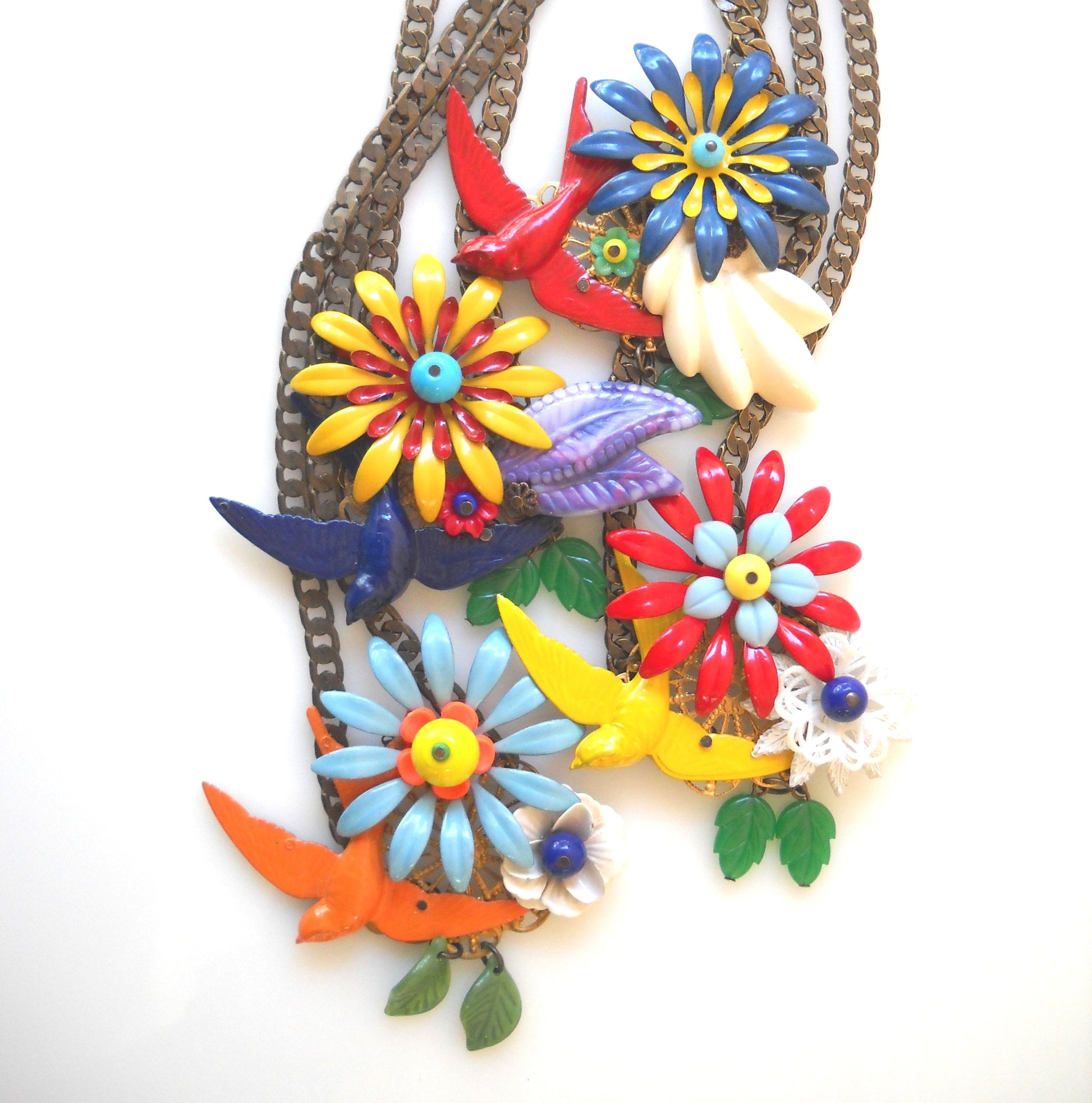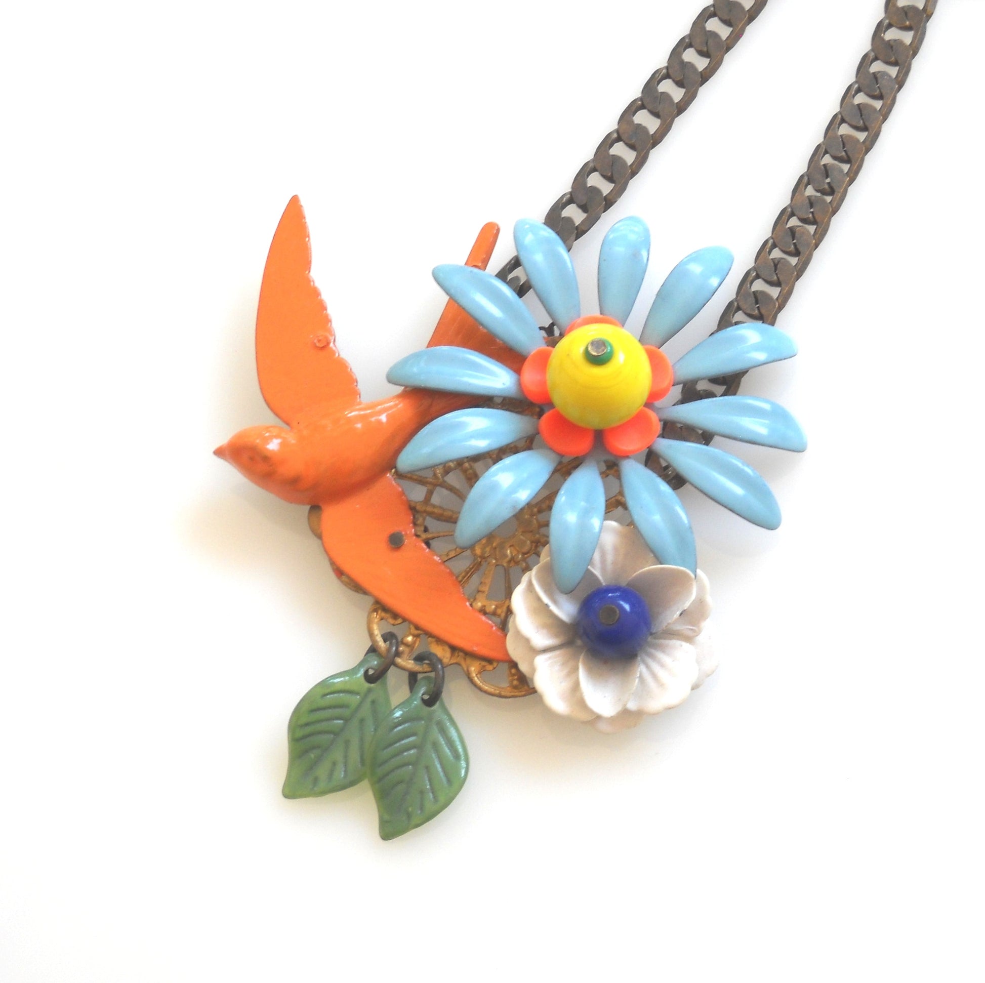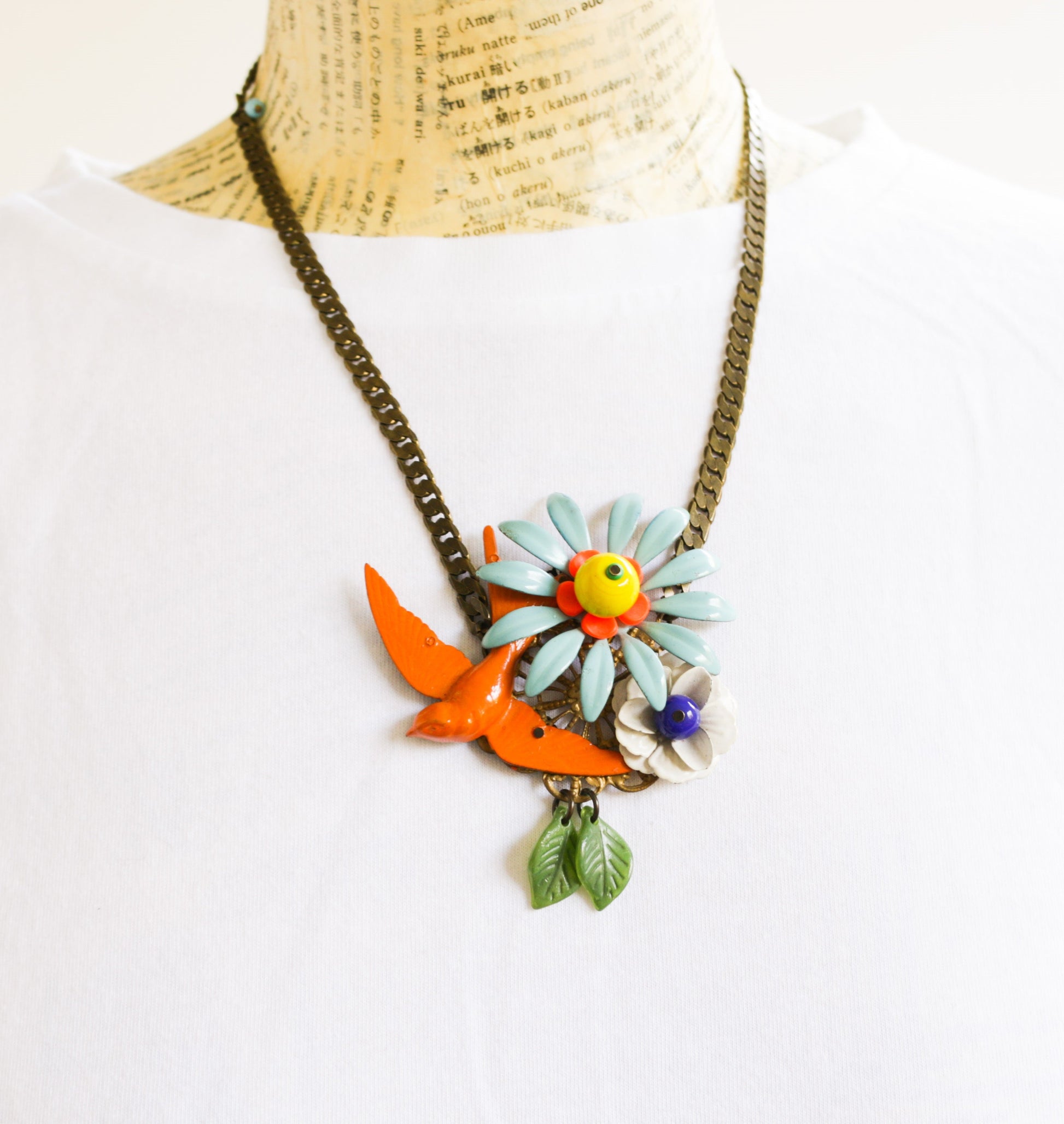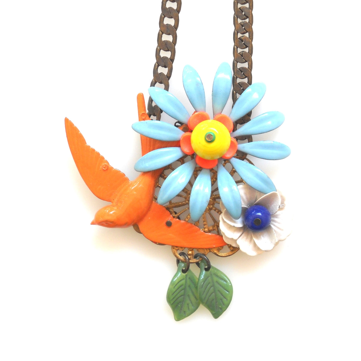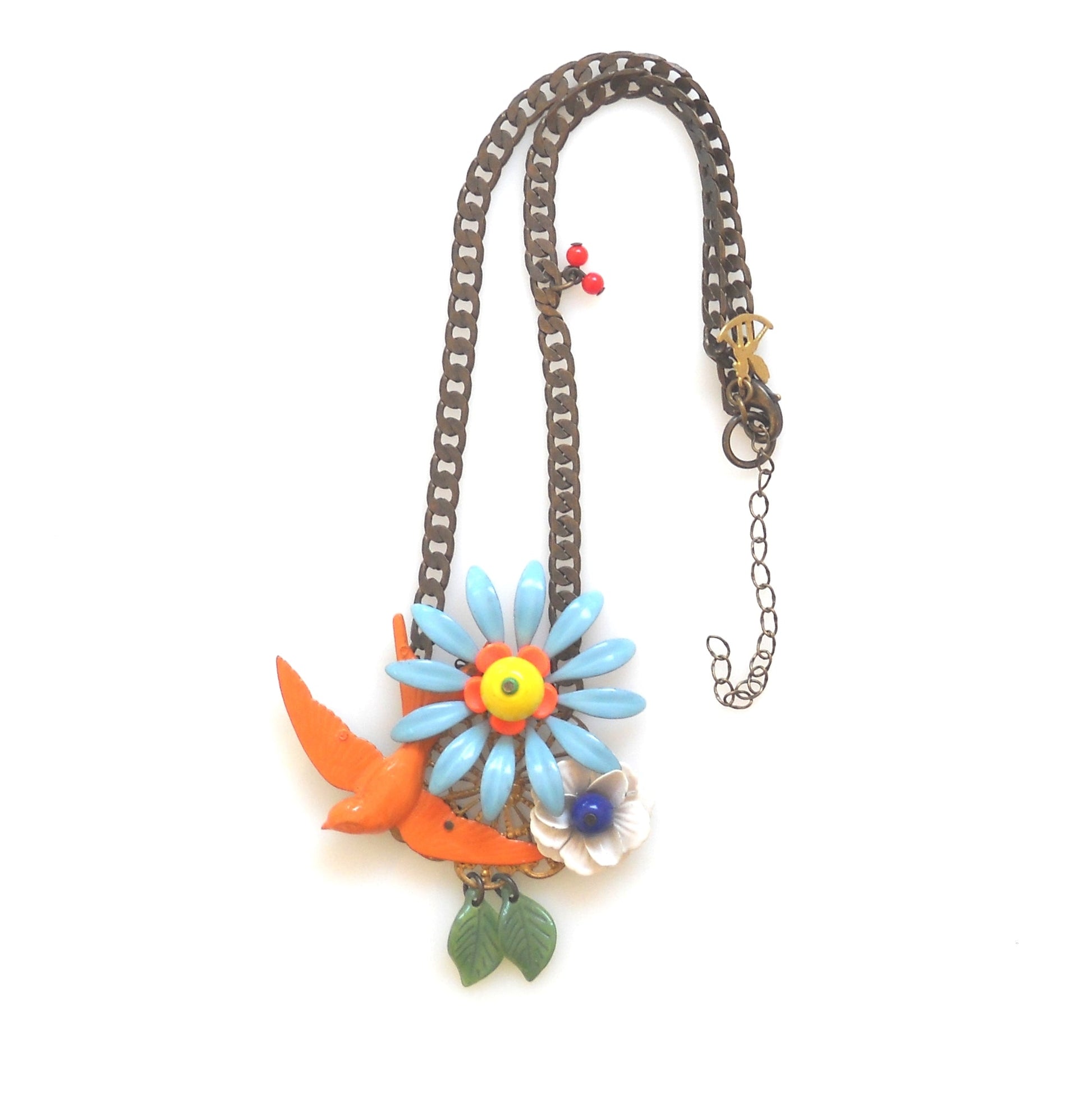 שרשרת נוכחות צבעונית מעודנת בסגנון נאיבי רטרו וינטאג'. סדרת 'עדן'. שרשרת מתכת בציפוי ברונזה, עם תליון מרכזי. סנונית בצבע כתום, פרח גדול בצבע תכלת, פרחים ועלים בלבן וירוק.