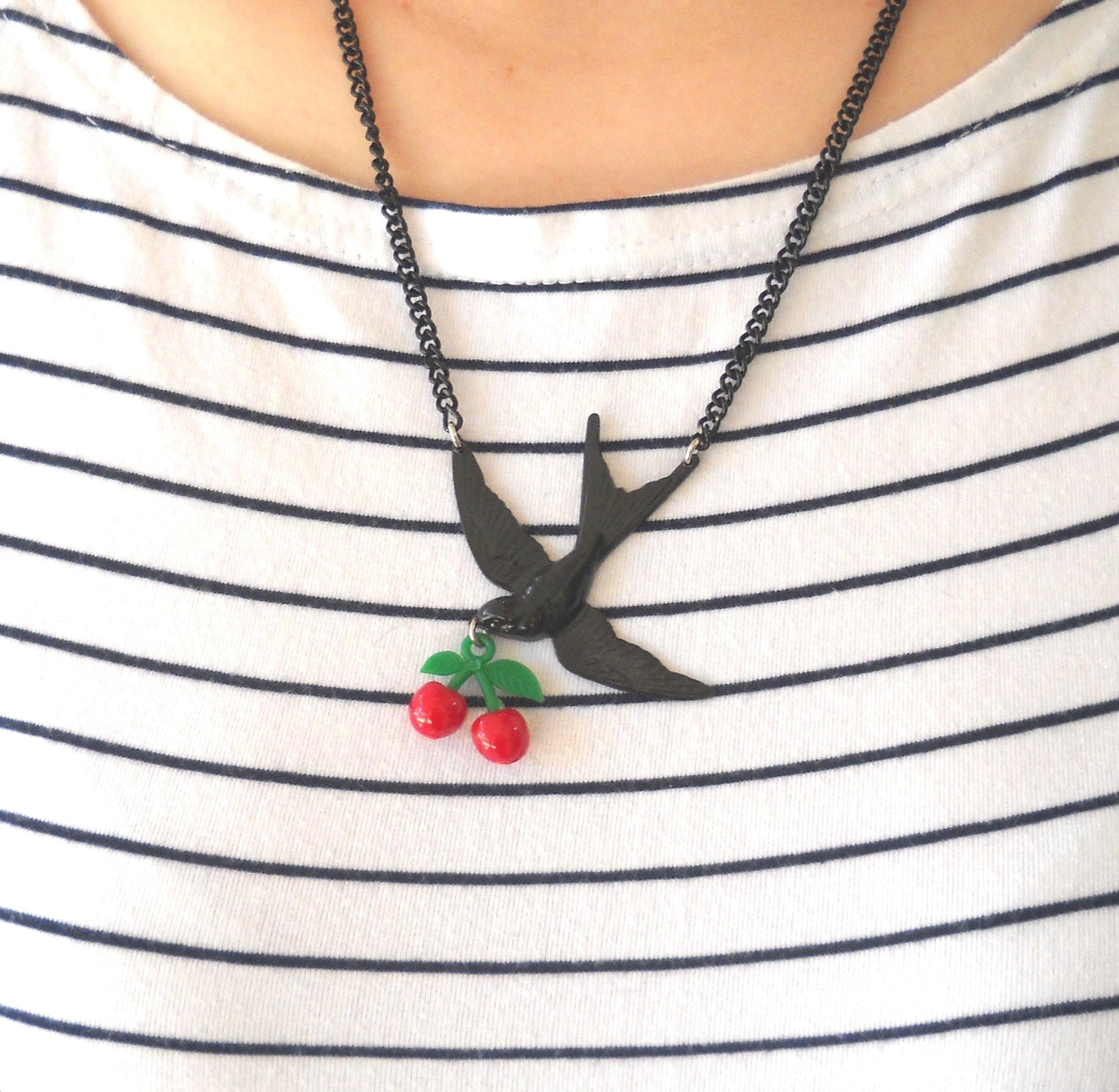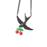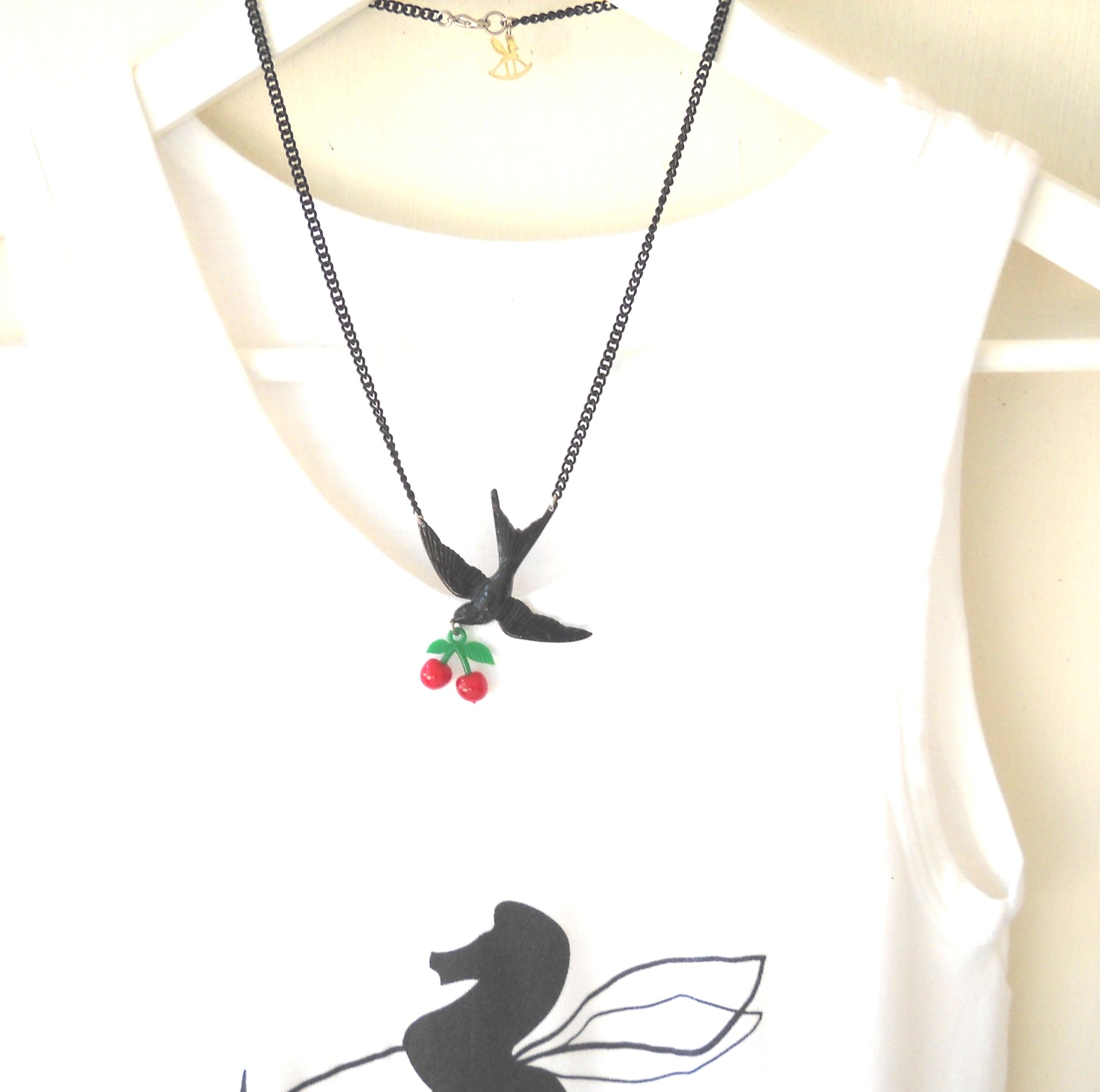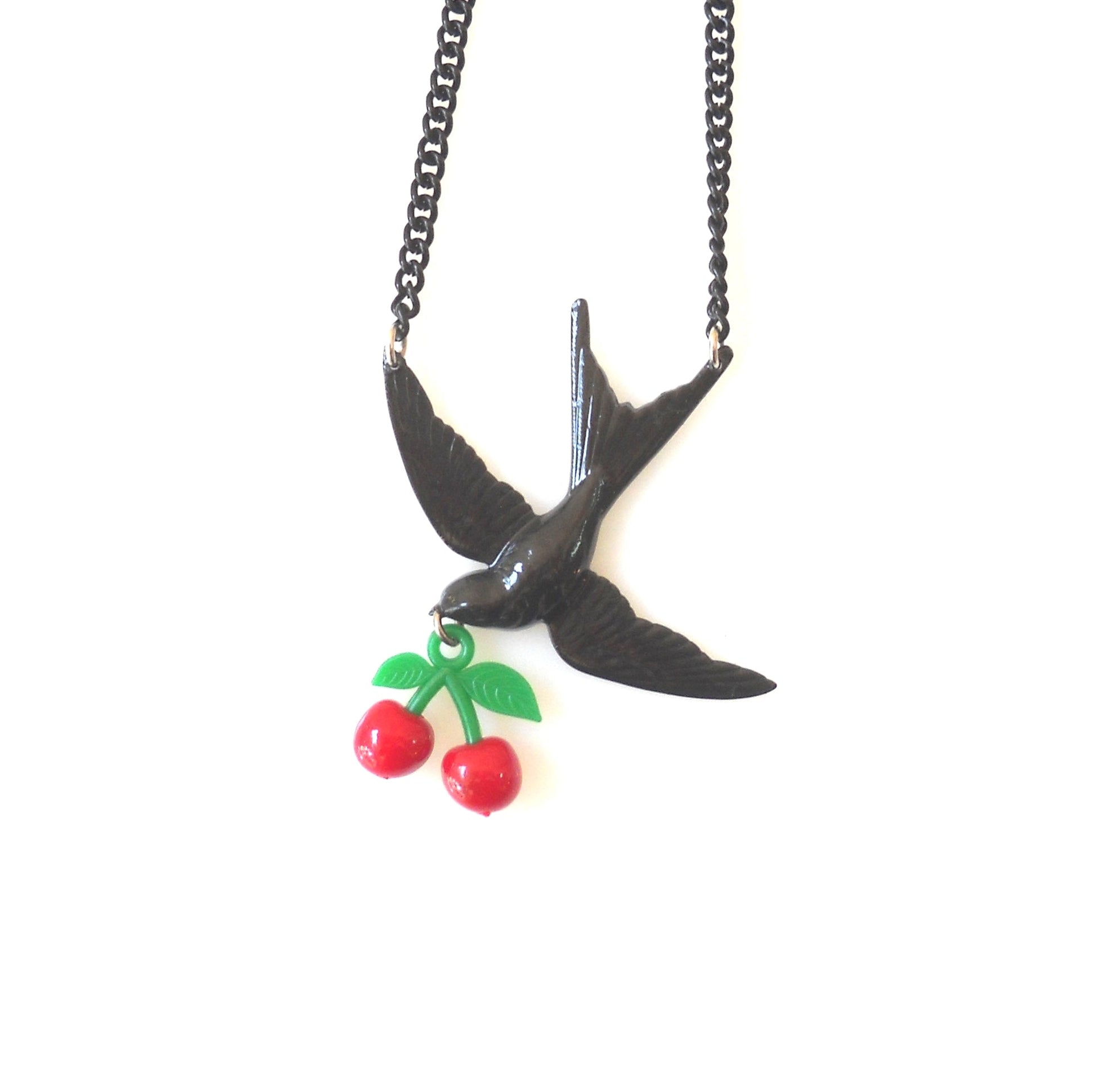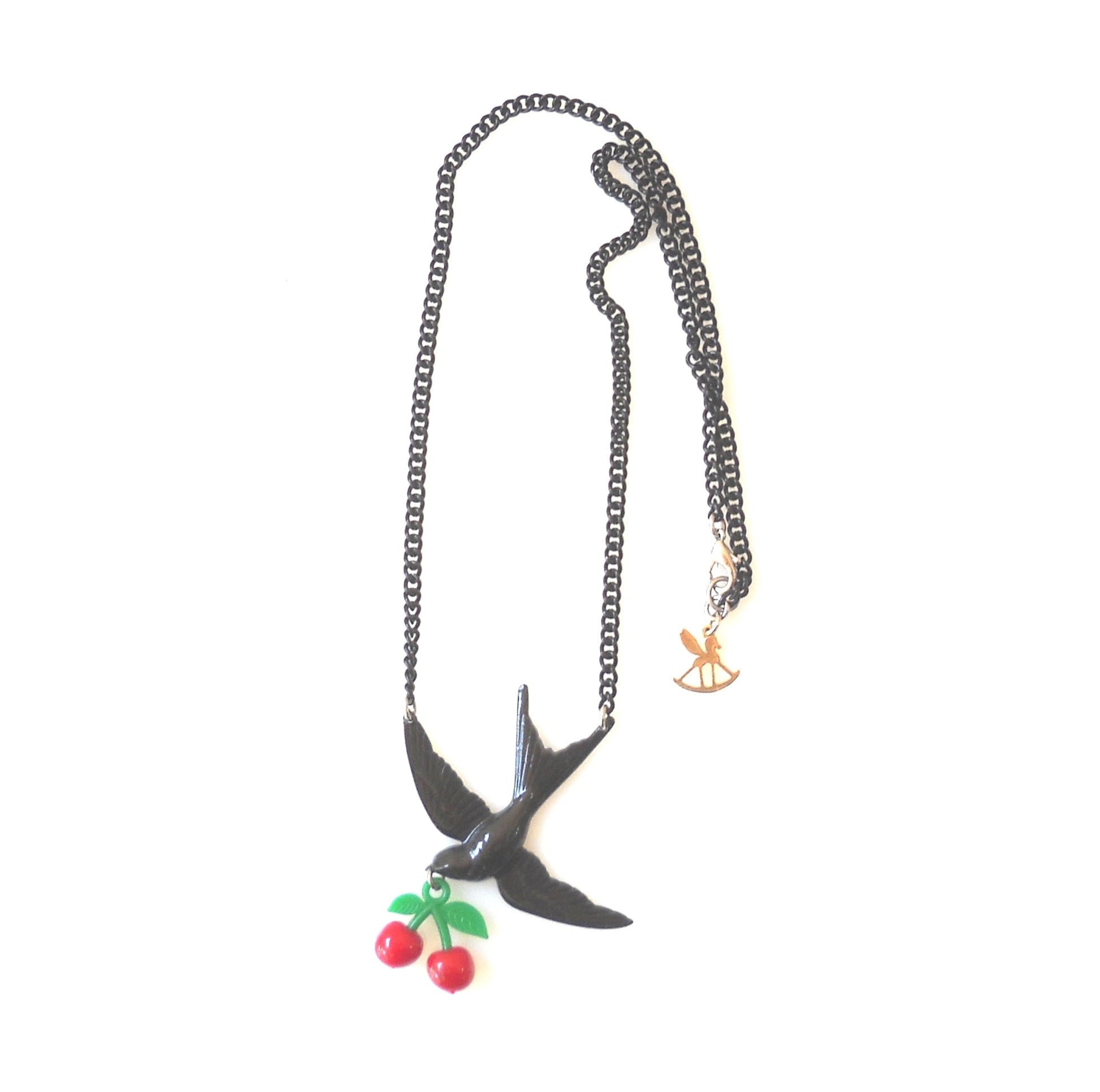 סנונית שחורה, במצב תעופה, שאוחזת במקור זוג דובדבנים, על שרשרת שחורה.