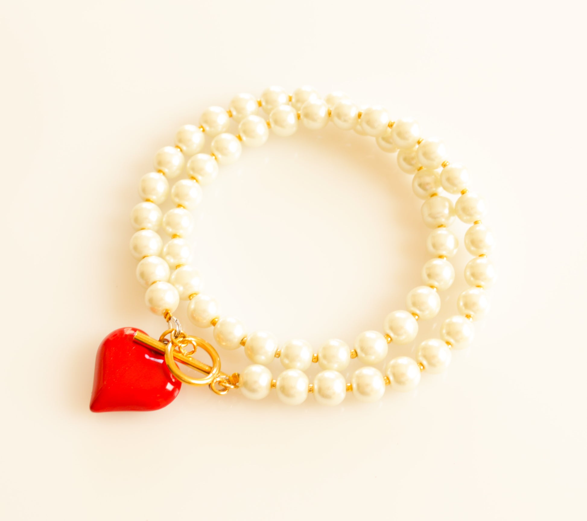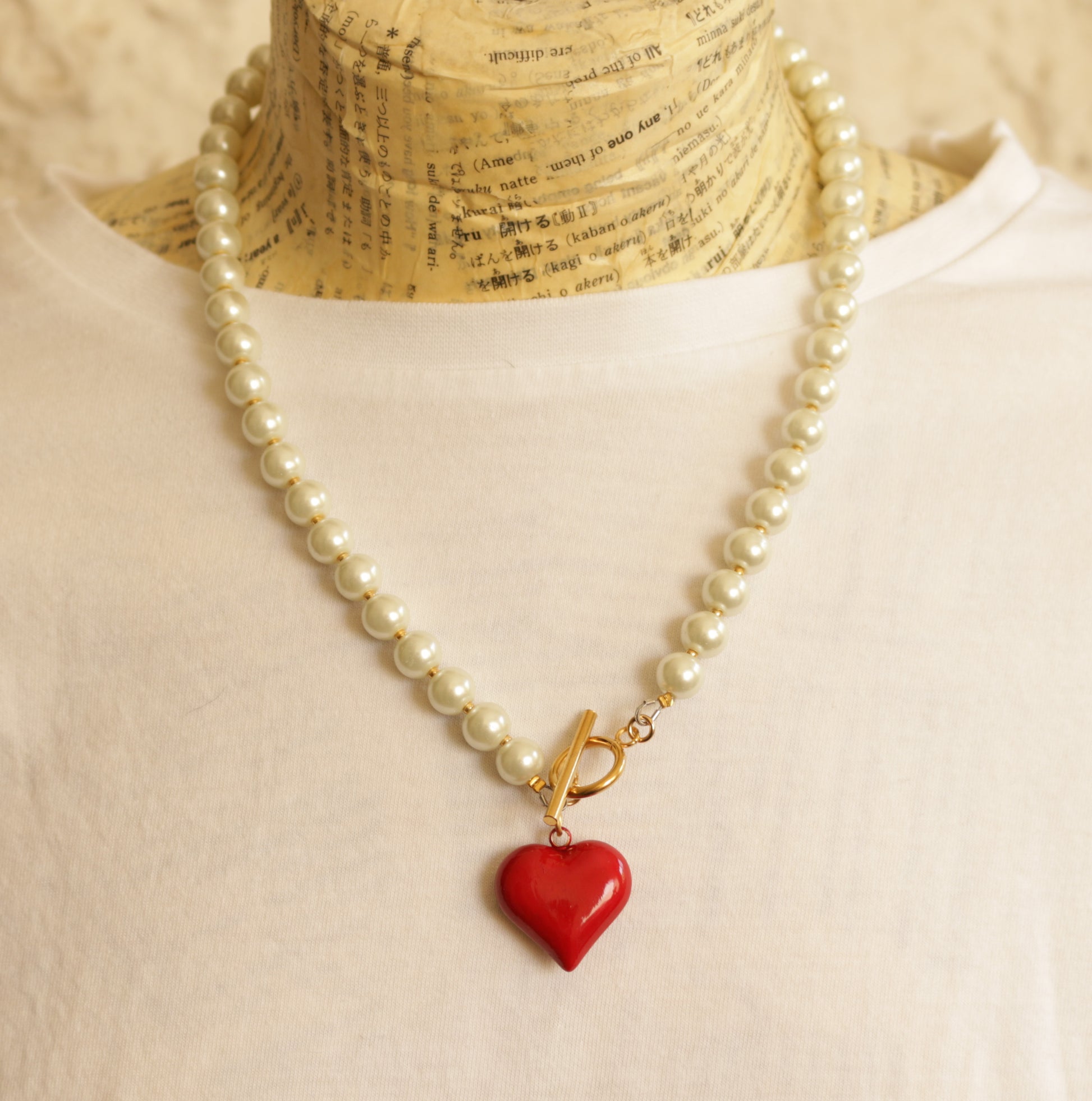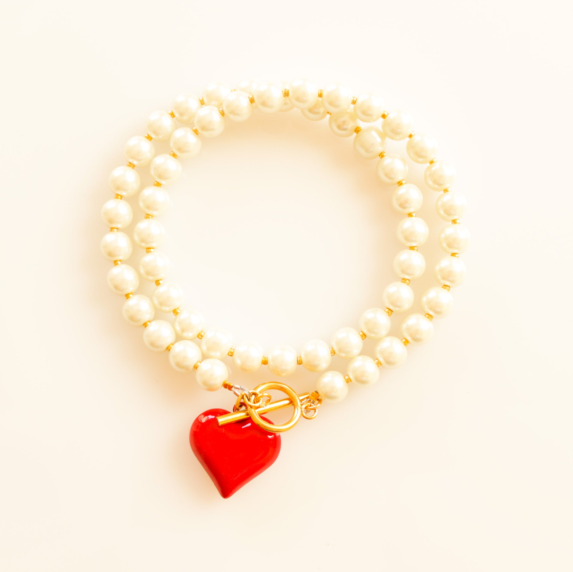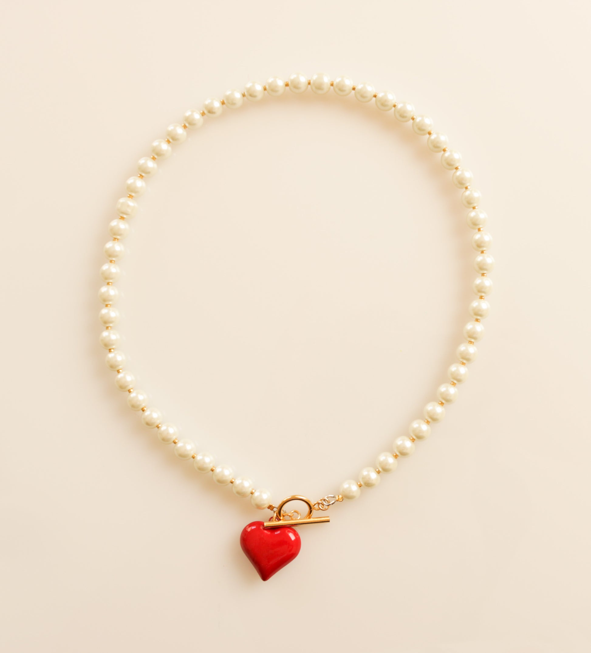 מחרוזת עשויה פניני זכוכית וחרוזי מיוקי קטנים זהובים. תליון לב תלת מימדי בציפוי אדום וסגירת טוגל קדמית,  אביזרי מתכת בציפוי זהוב.