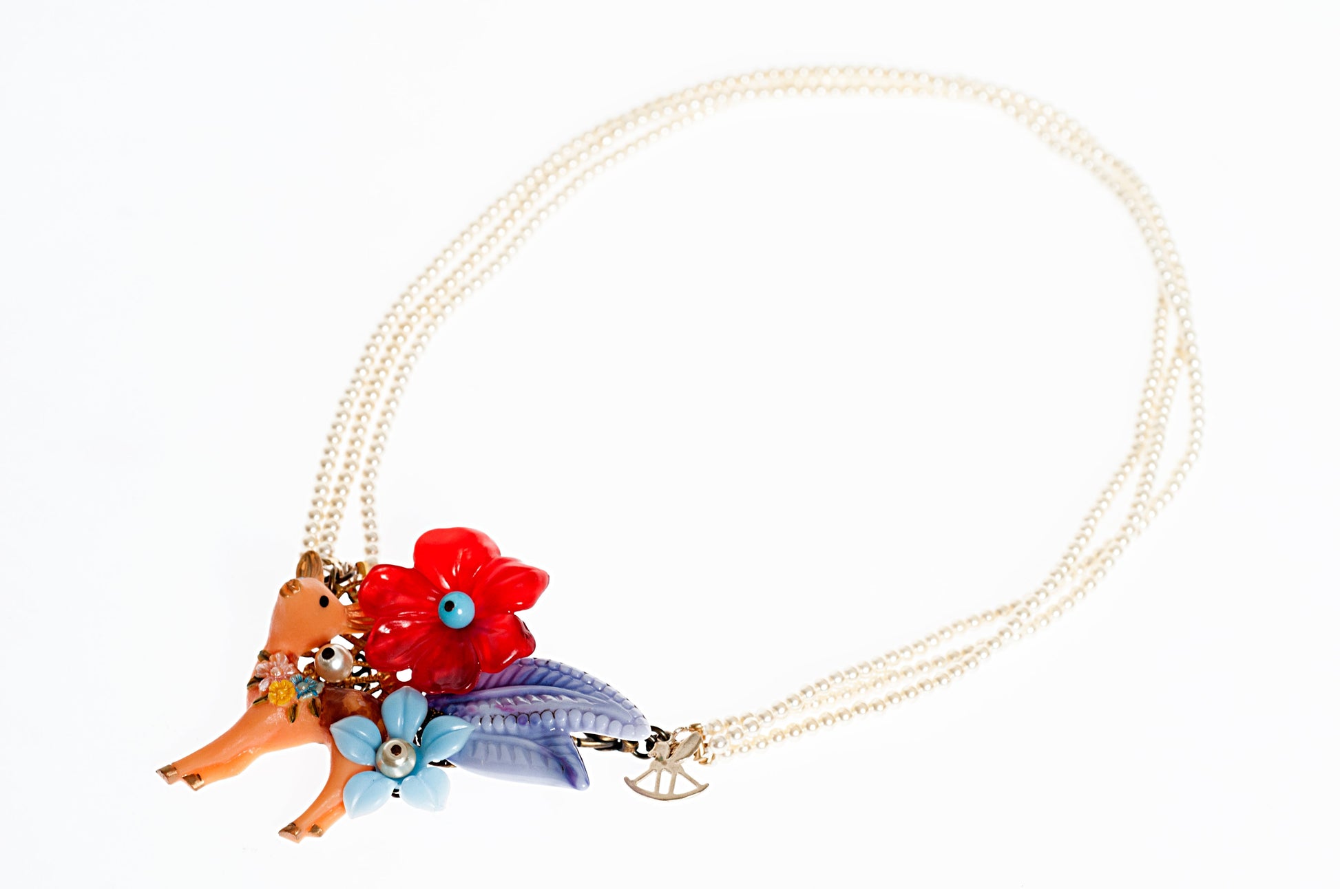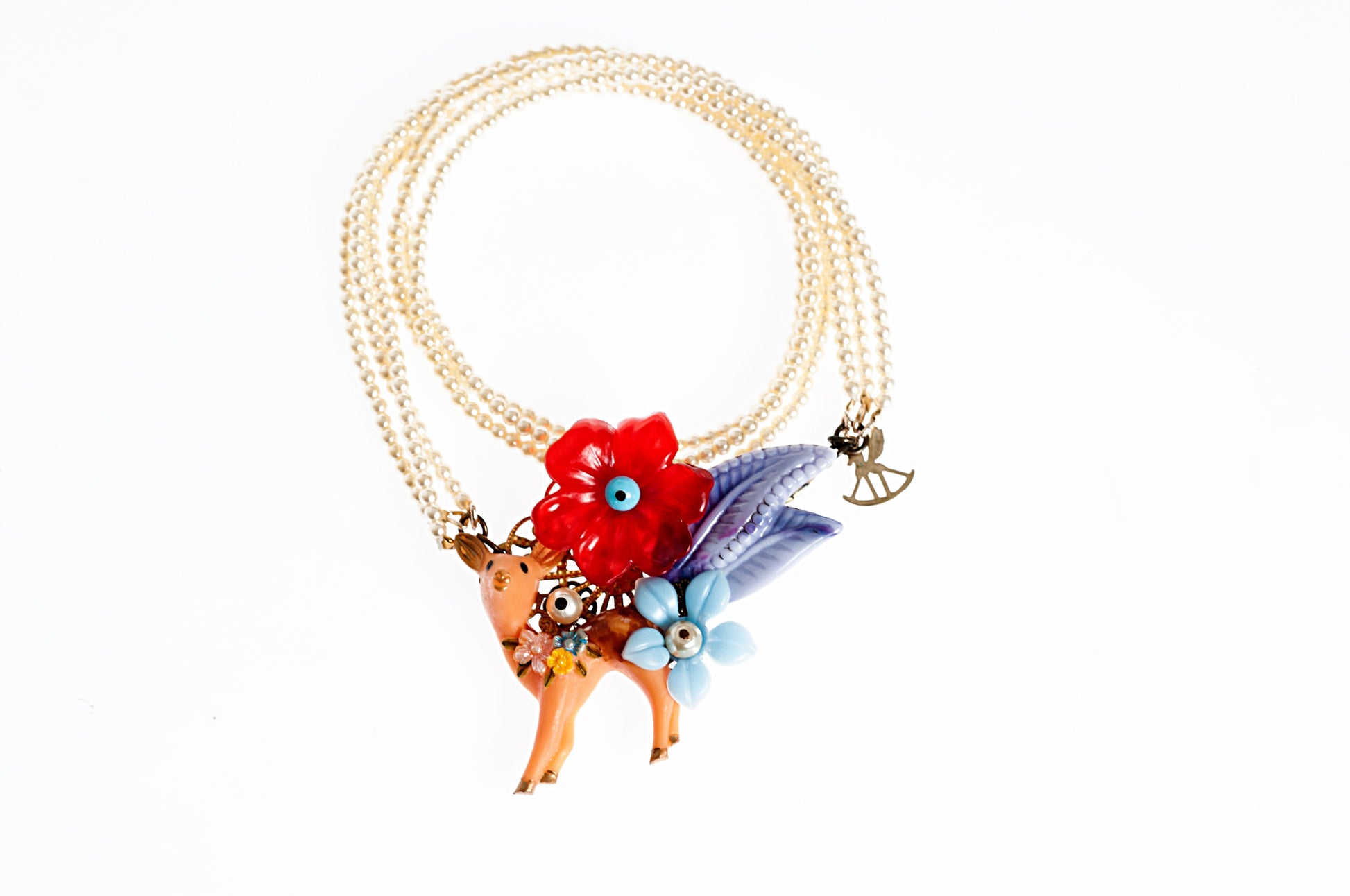 שרשרת מלאה הומור ונאיביות, קולאז' פרחוני עדין עם דמות במבי מתוקה, על 3 שורות של פנינים קטנות. התליון במידה בינונית, עם צבעוניות רגועה, אבל לא ניתן להתעלם ממנו.