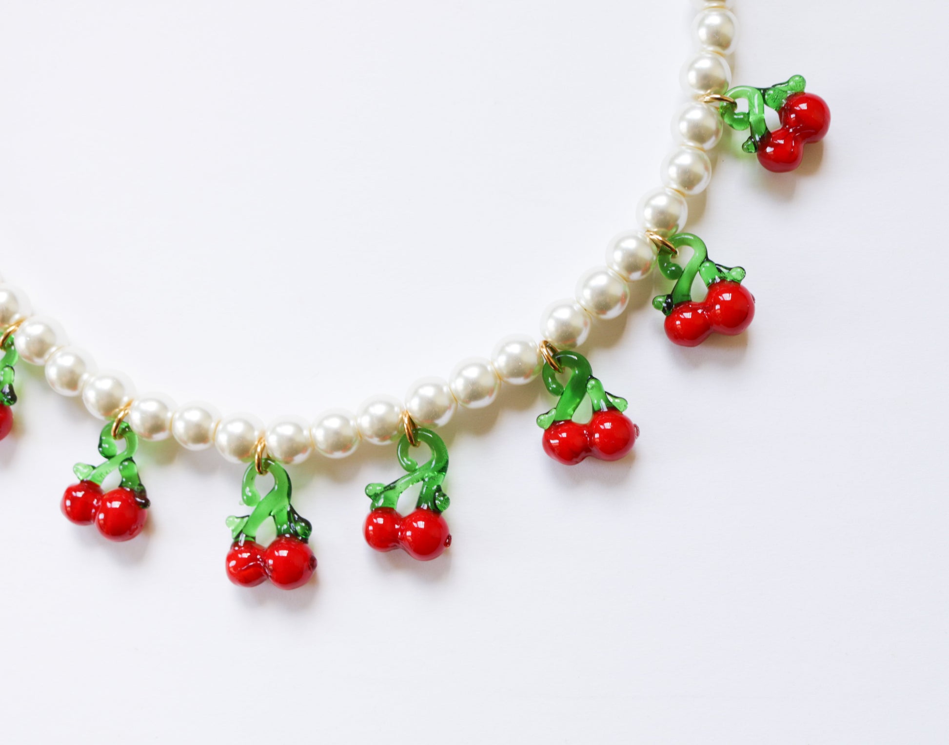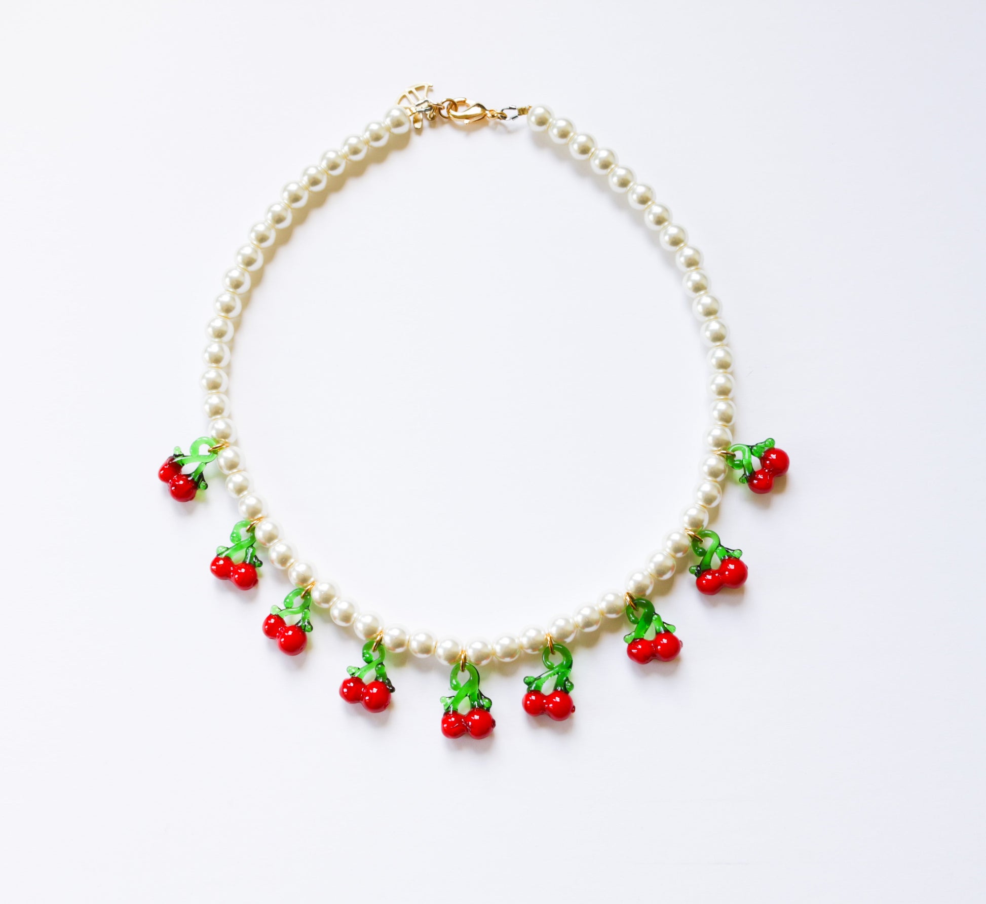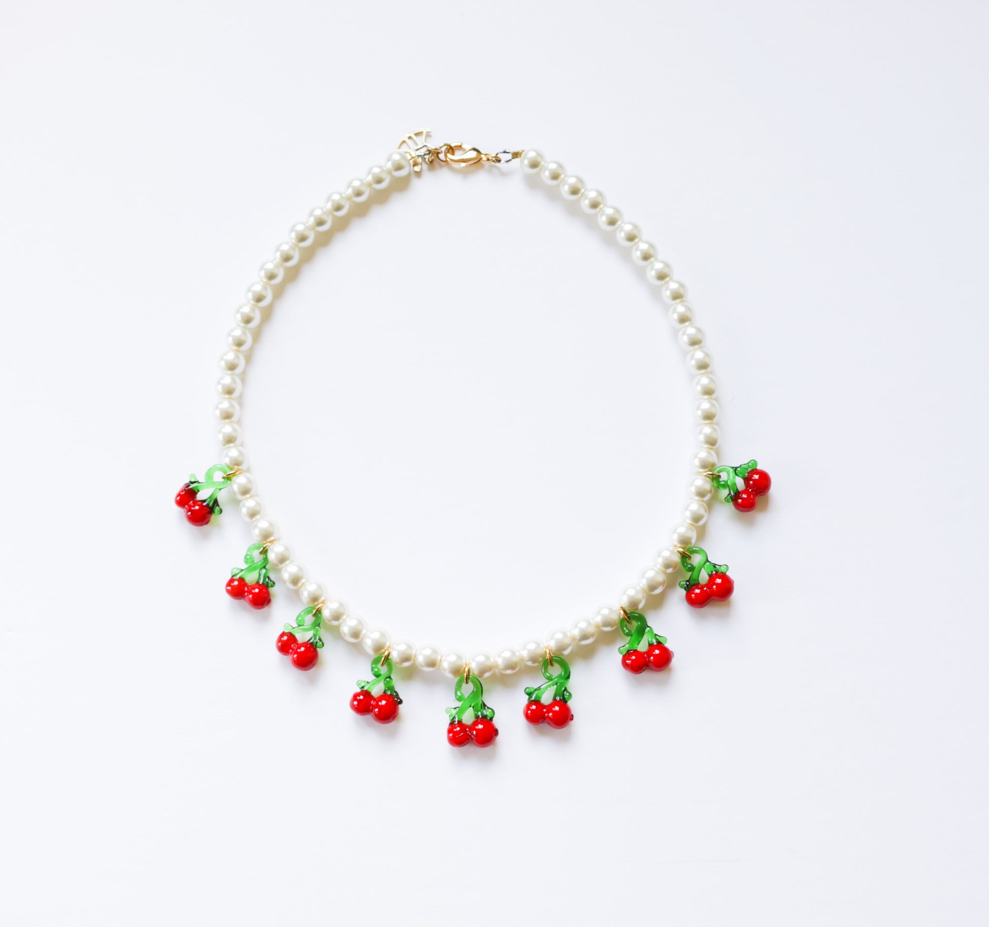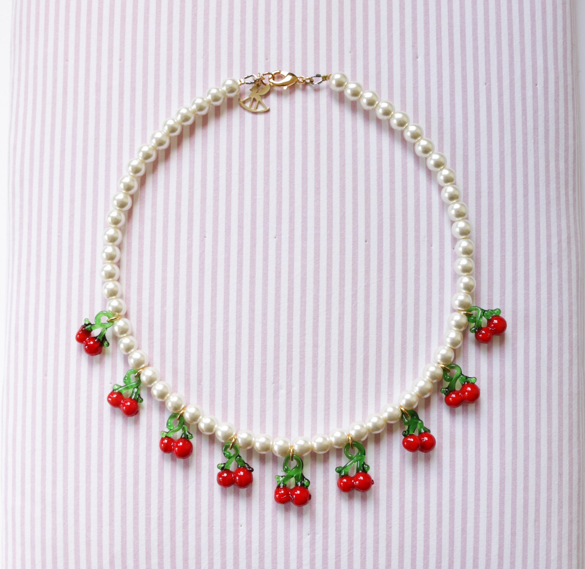 שרשרת רומנטית עשויה פניני זכוכית באיכות גבוהה, עם דובדבנים עשויים זכוכית בעבודת יד (LAMPWORK). אם סגנון נקי וטיפה מיושן מדבר ללבך – זו השרשרת שלך. מאזכרת עולם ישן של חלומות ילדות.