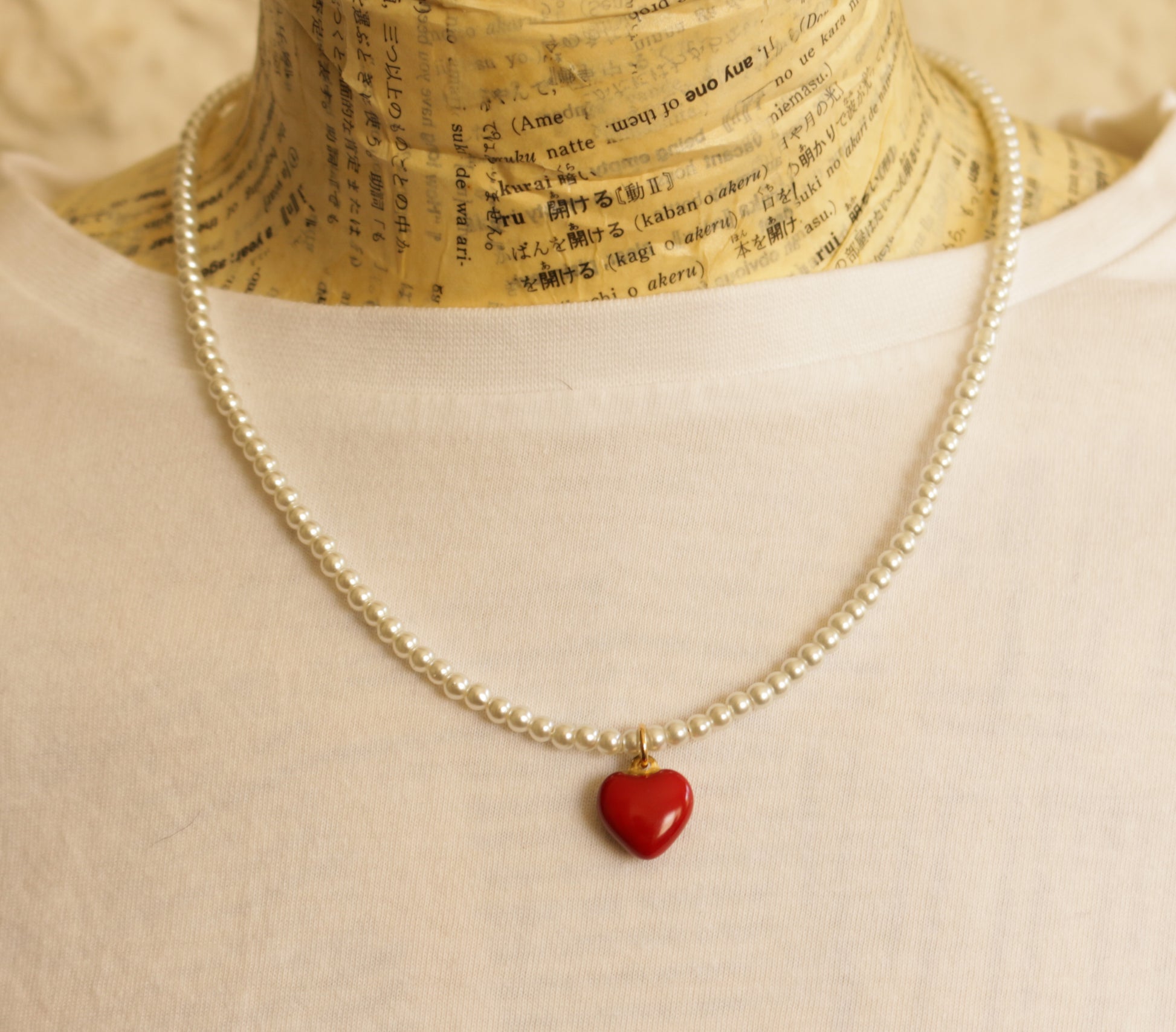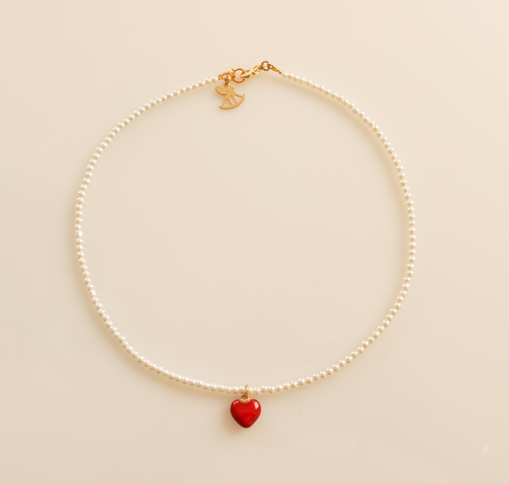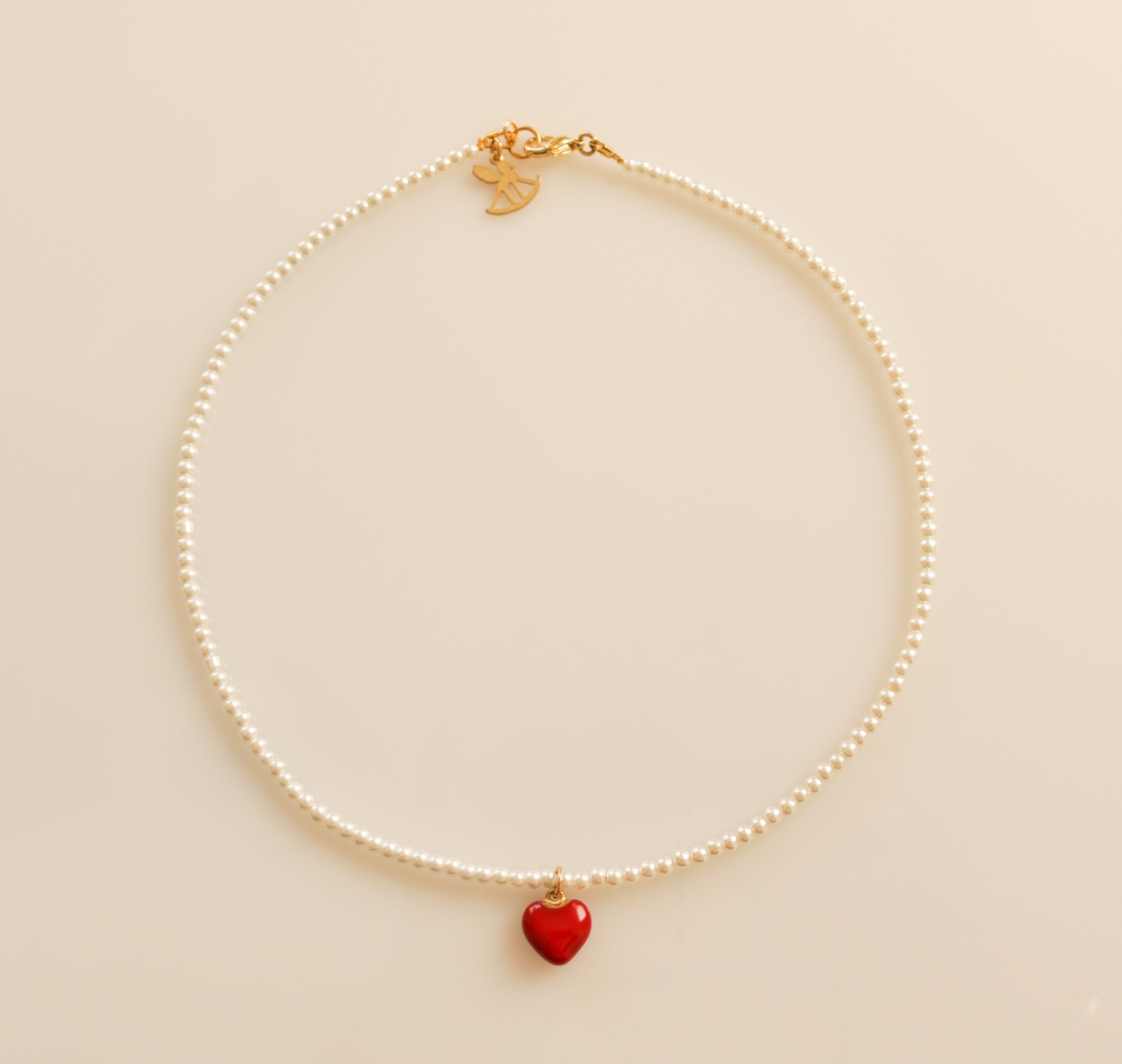 שרשרת פנינים קטנות עם לב אדום או זהוב