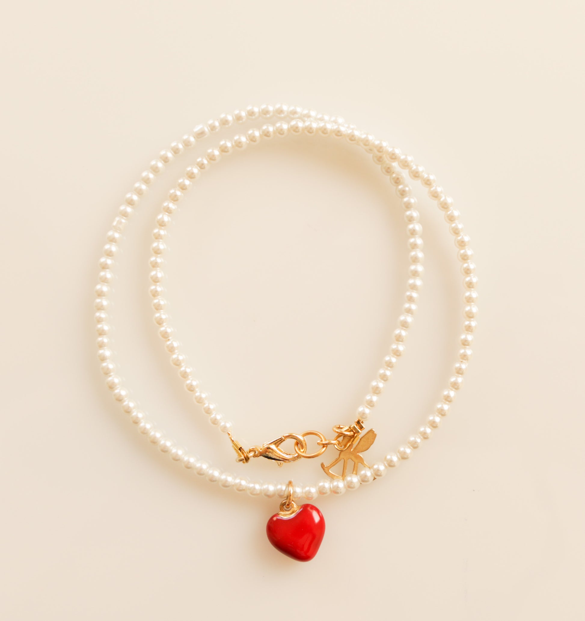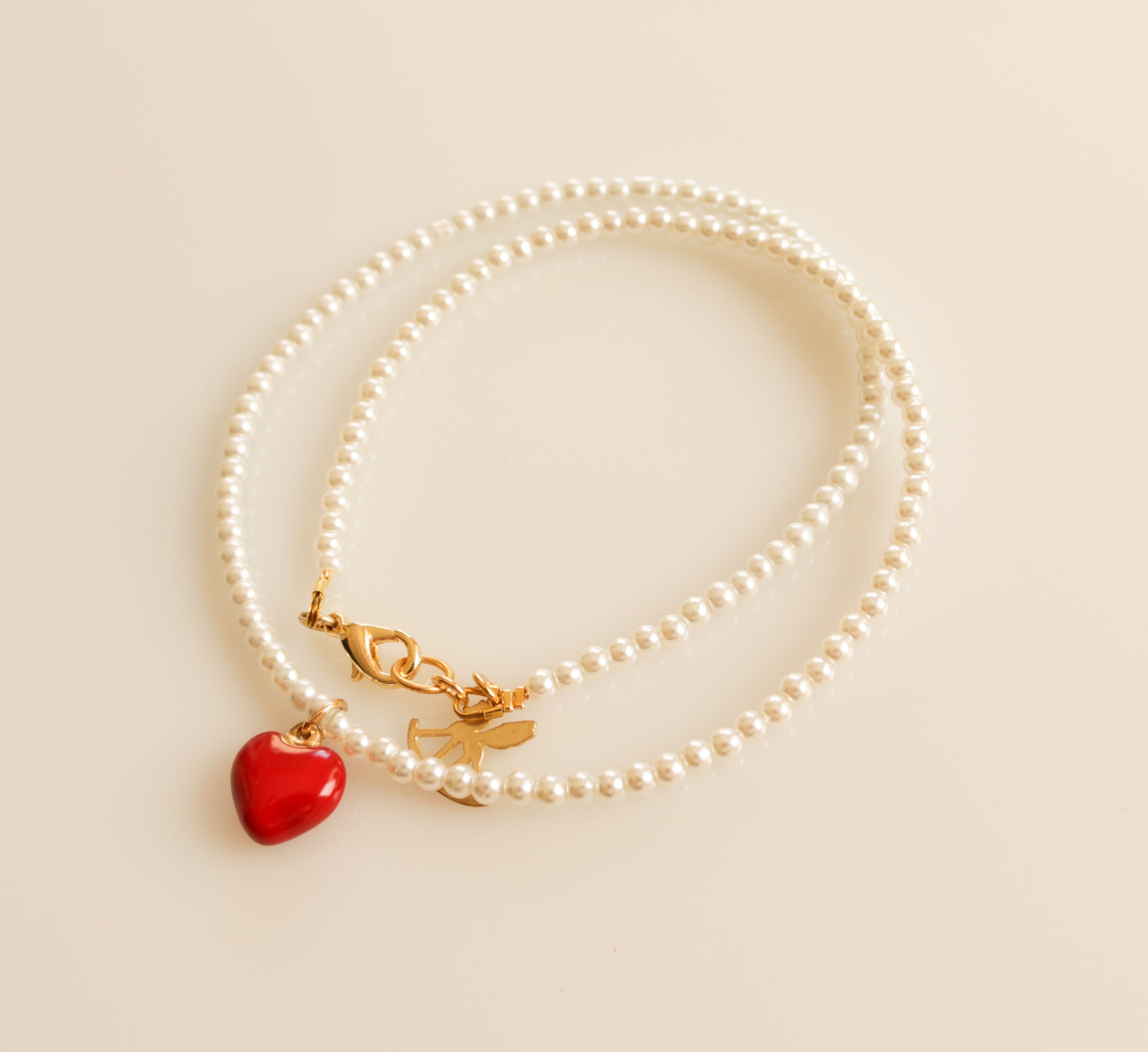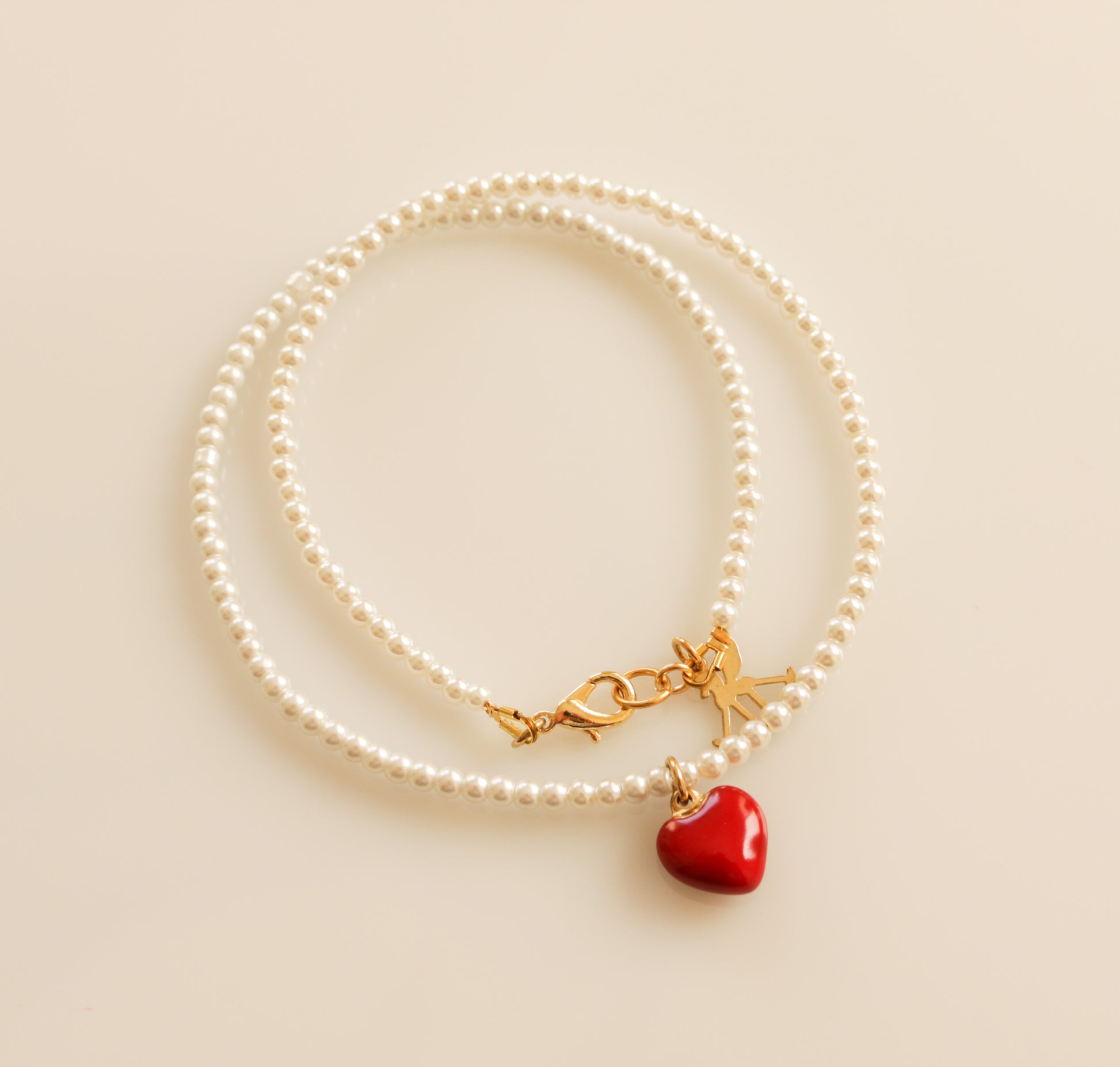 שרשרת פנינים קטנות עם לב אדום או זהוב