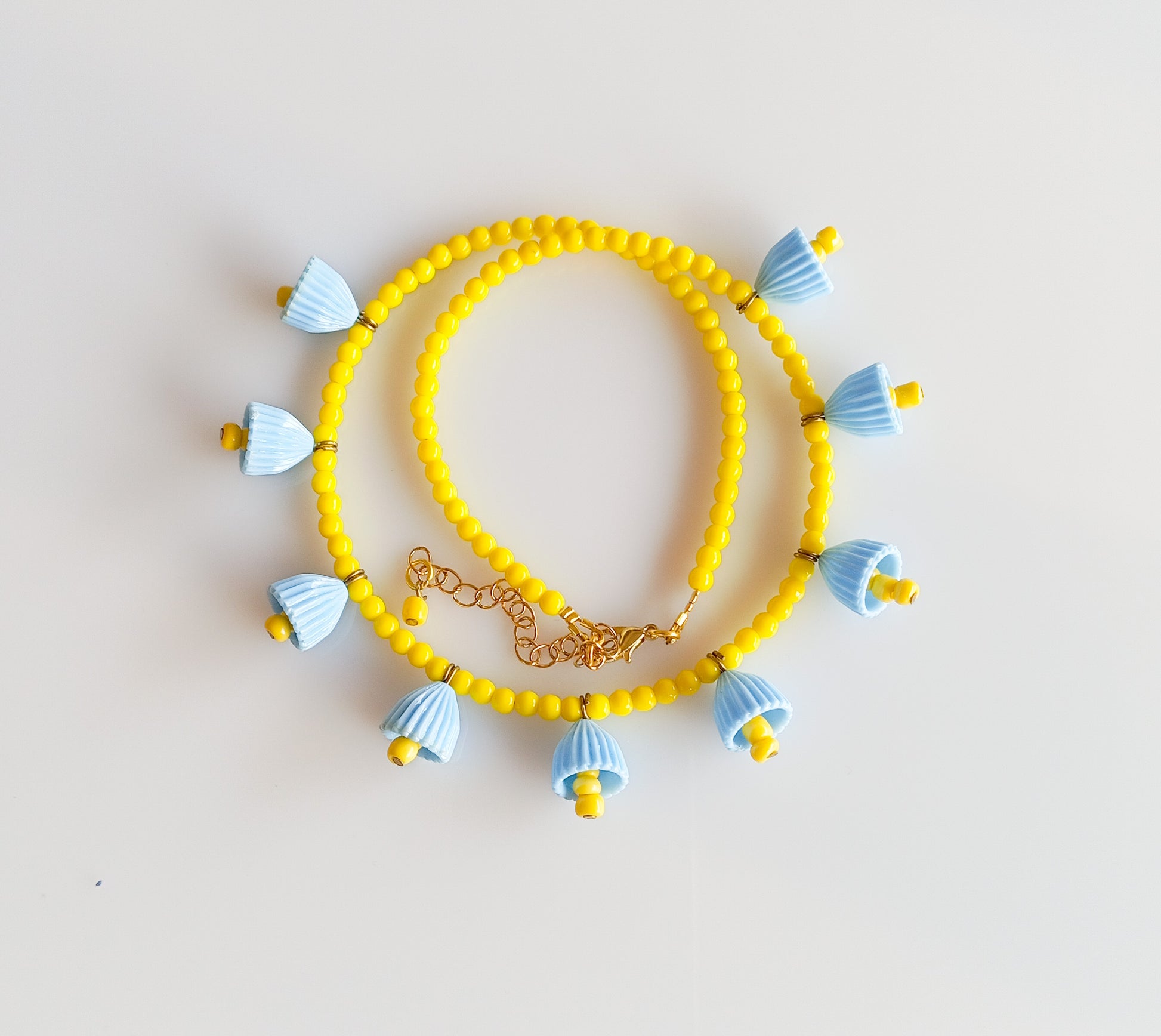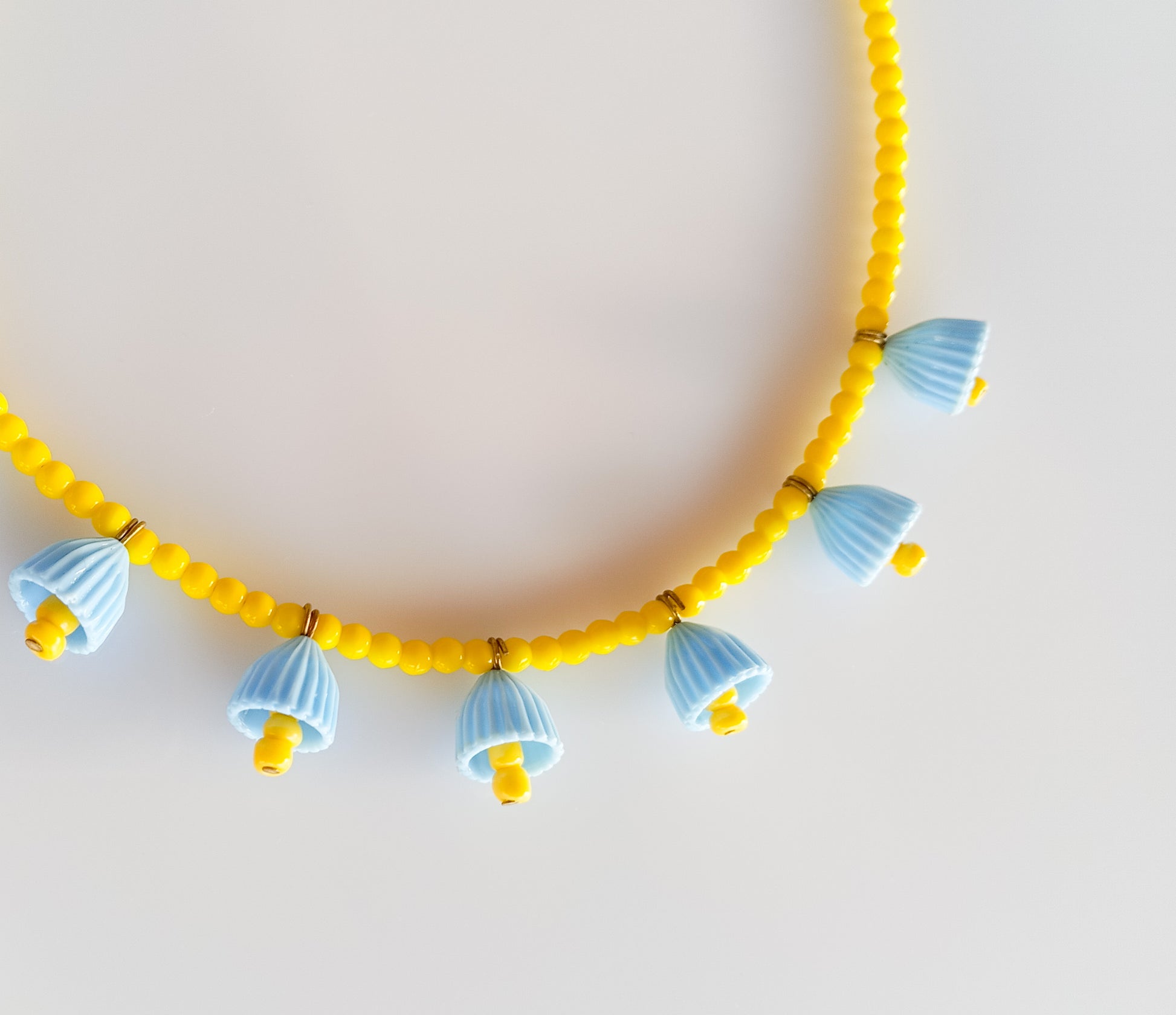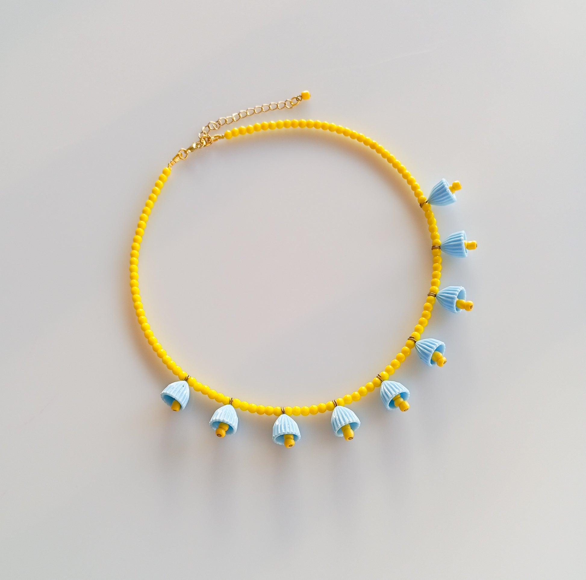 שרשרת חרוזים עדינה עשויה פרחי פעמונית בתכלת עם חרוזים צהובים. למי שאוהבת סגנון תכשיטים של שנות החמישים בצירוף צבעים קלאסי.  נהדרת גם בתור מתנה למישהיא שאת אוהבת במיוחד.