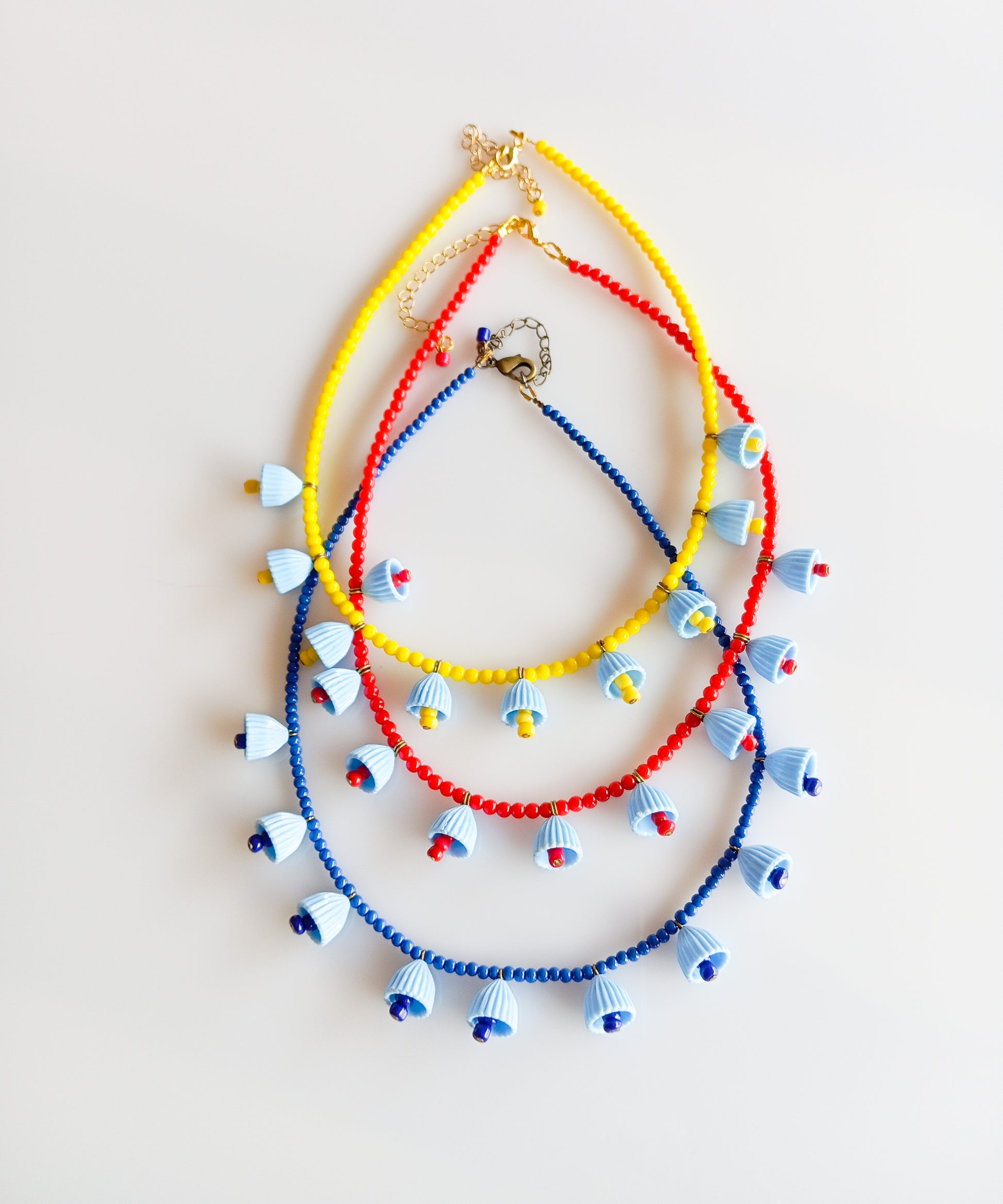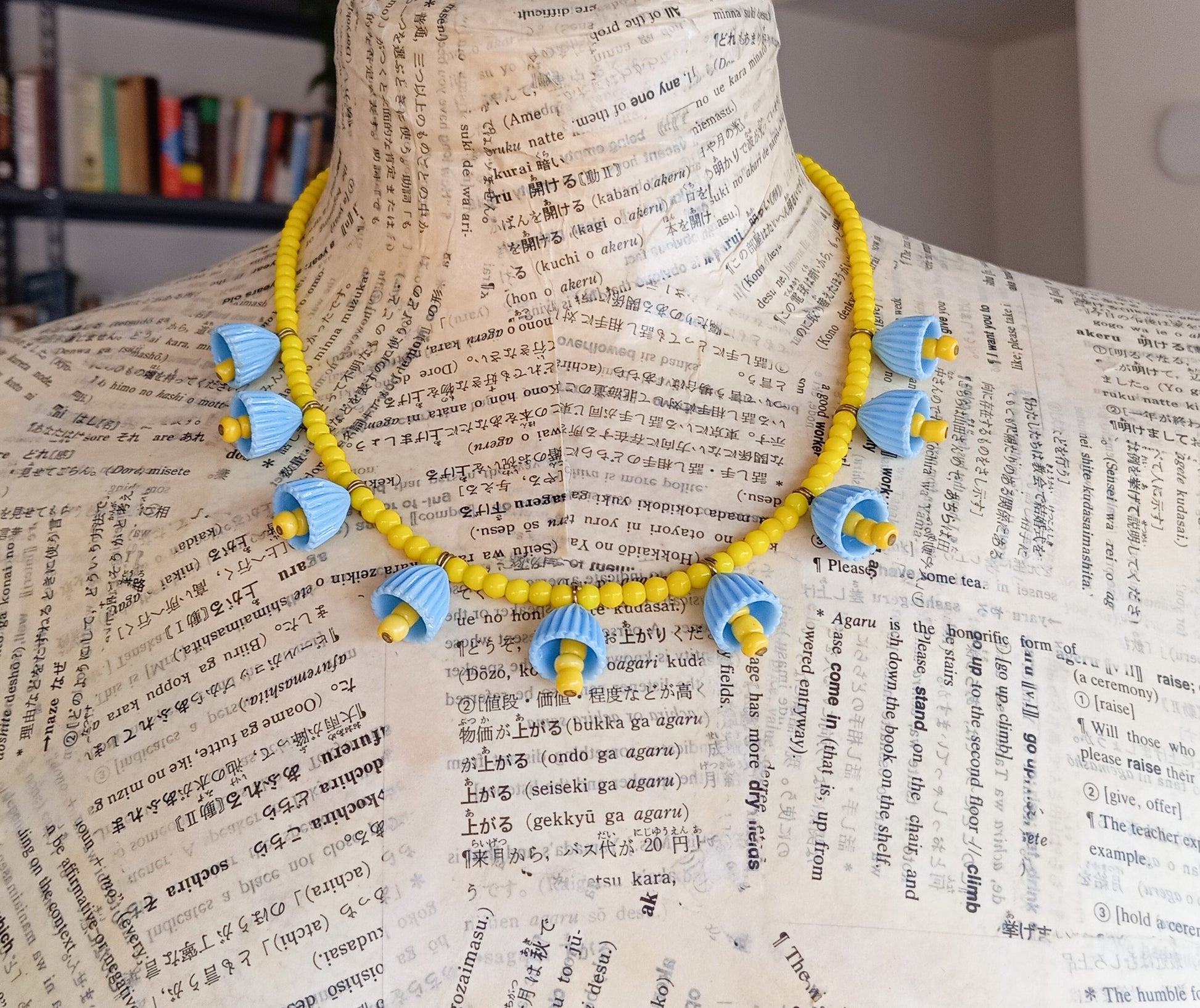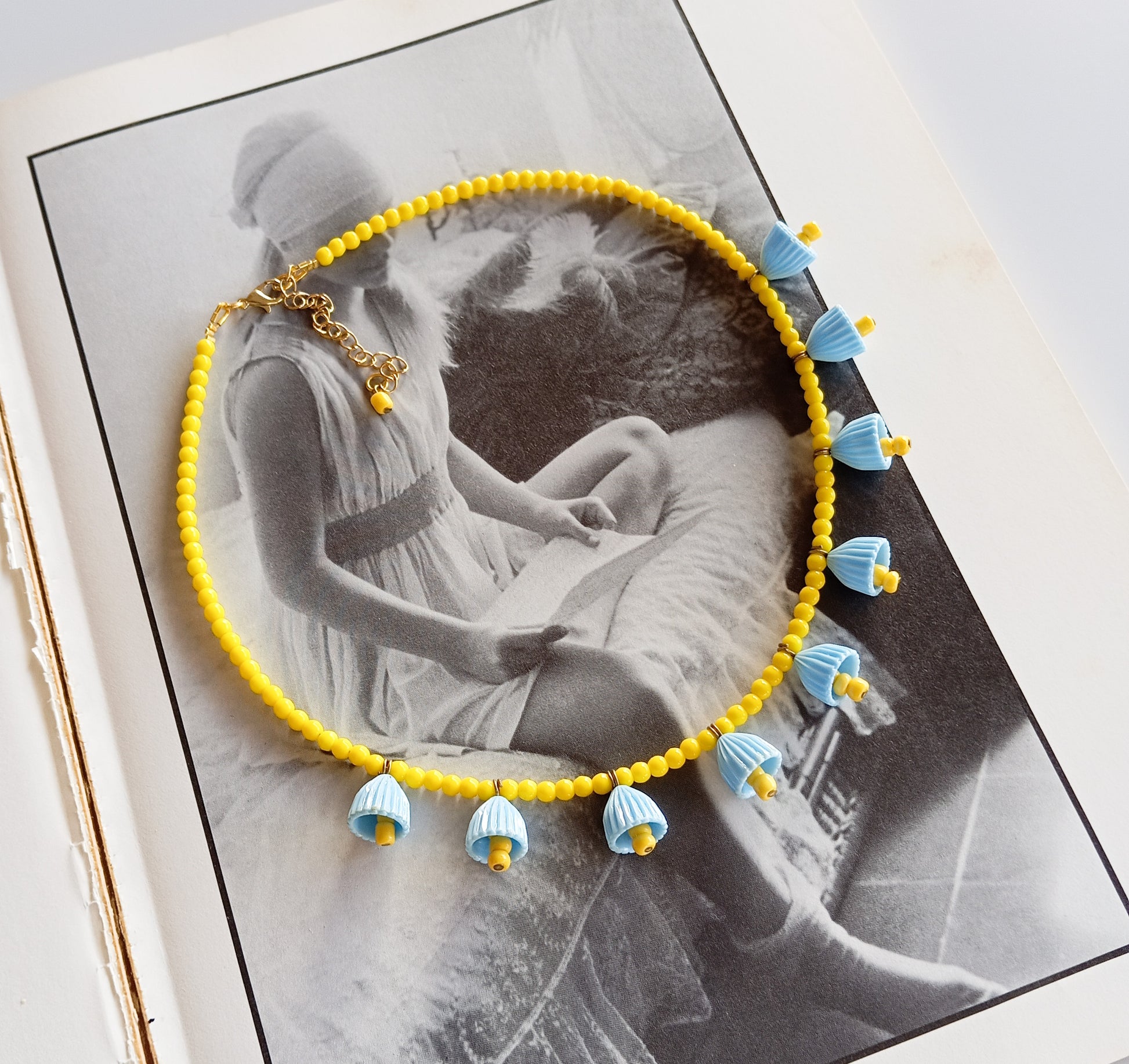 שרשרת חרוזים עדינה עשויה פרחי פעמונית בתכלת עם חרוזים צהובים. למי שאוהבת סגנון תכשיטים של שנות החמישים בצירוף צבעים קלאסי.  נהדרת גם בתור מתנה למישהיא שאת אוהבת במיוחד.