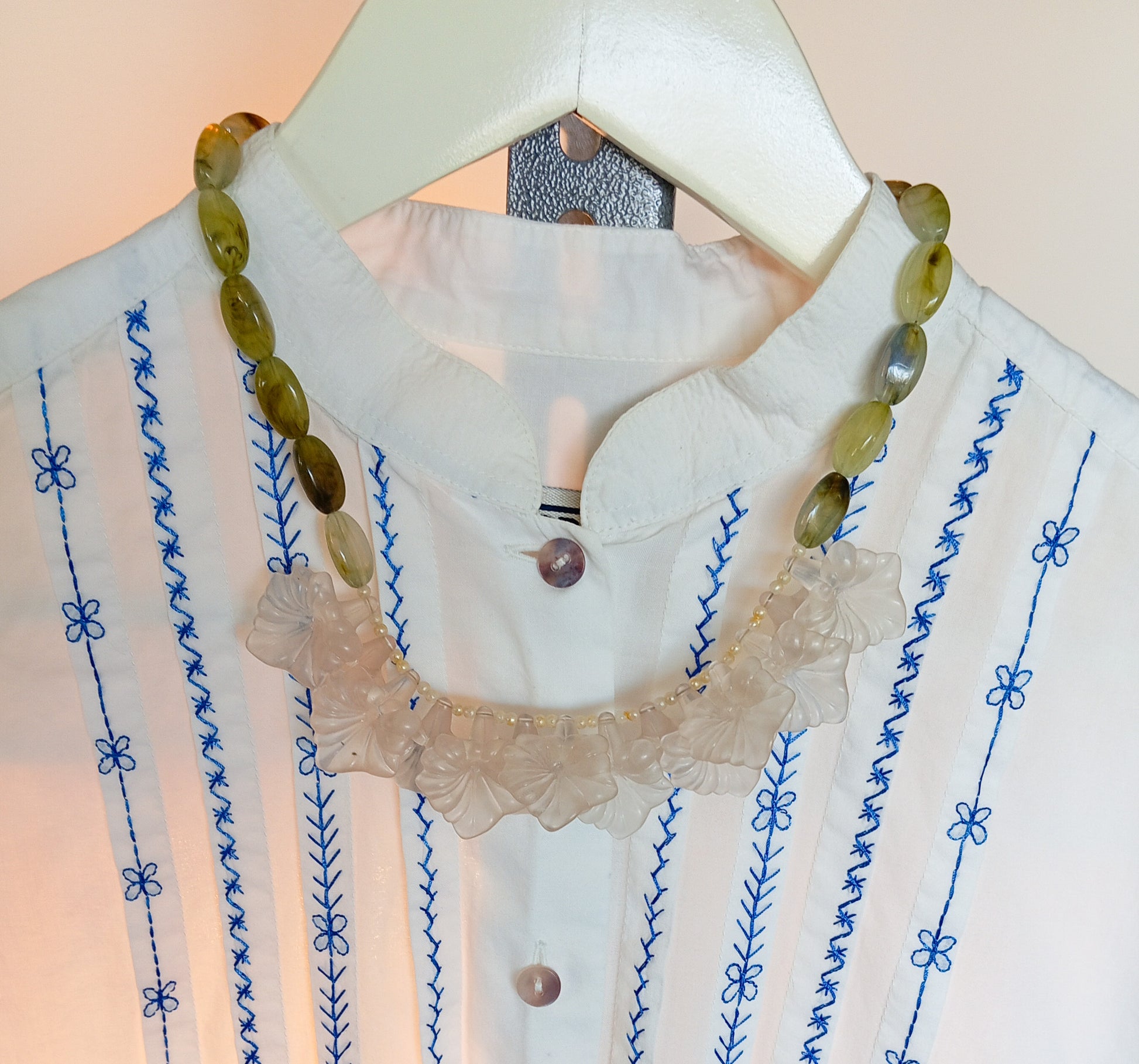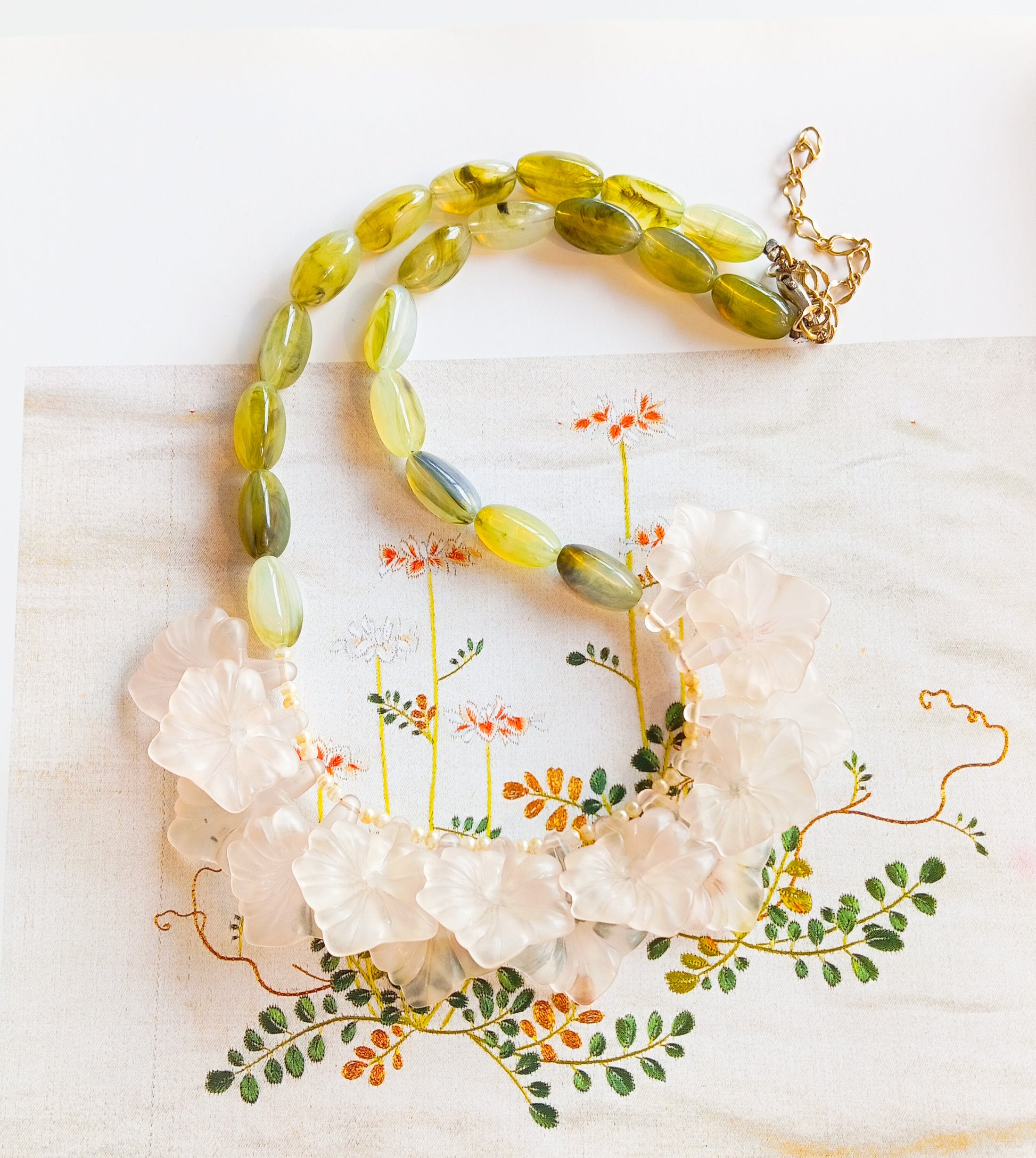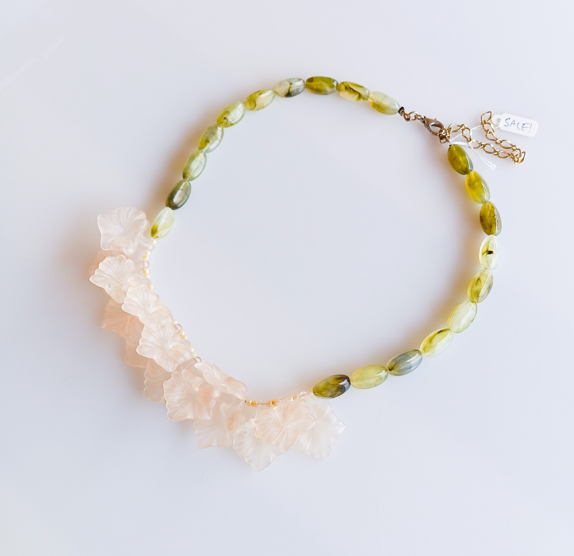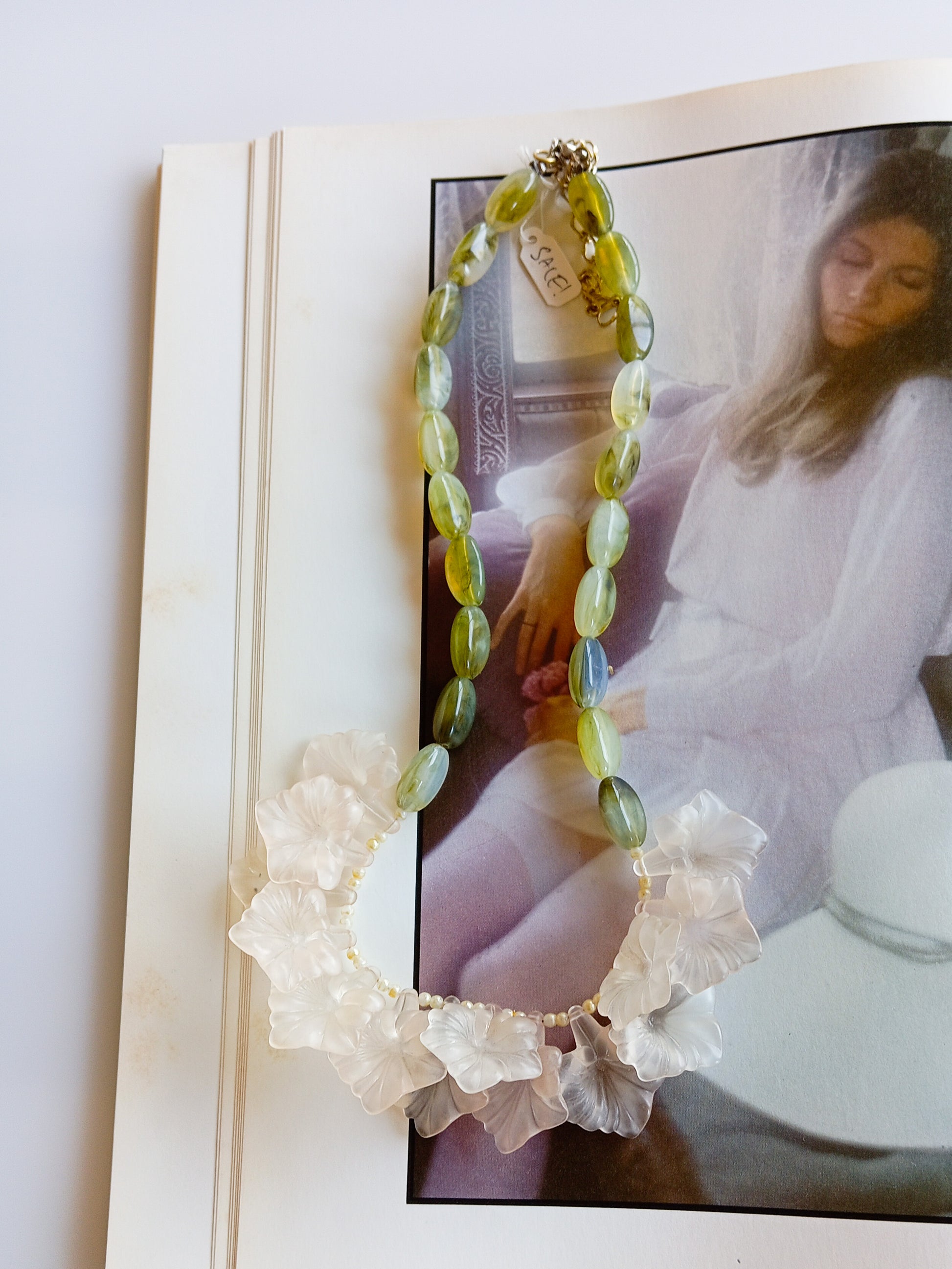שרשרת מיוחדת מחרוזים וינטאג' עשויה פרחים בוורוד עתיק וחרוזים בירוק זית. הצירוף של וורוד/ירוק לא מפסיק להפתיע, ובנוסף יש כאן משחק של שקיפויות שנותן עידון ועניין.
