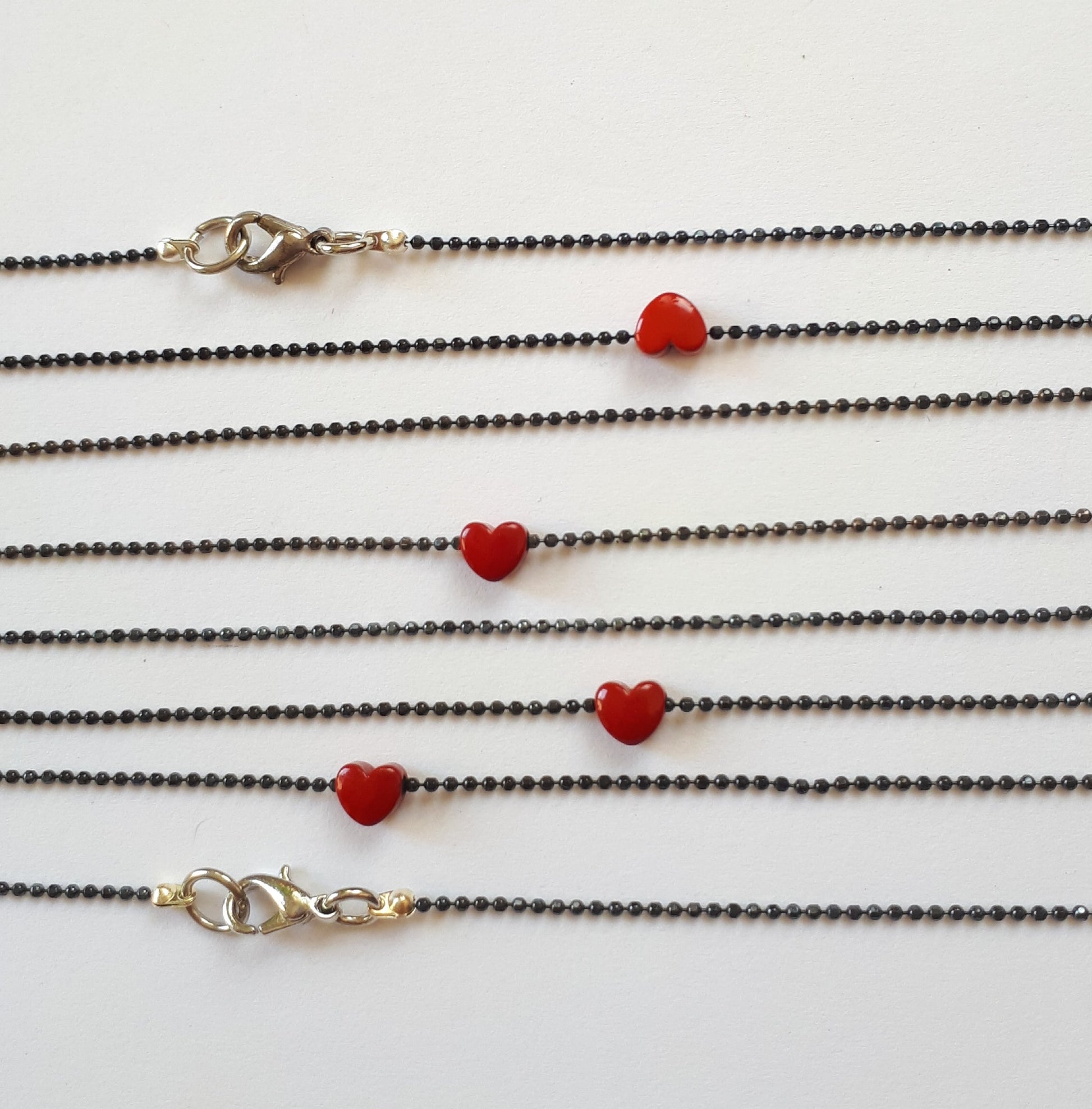 שרשרת לב אמאייל אדום קטנטן, מושחל על שרשרת כדורונים עשויה כסף מושחר. נענדת קרוב לצוואר. זו שרשרת עדינה עם נקודה אדומה קטנה שמושכת את העין. מתאימה מאד כחלק מאוסף של כמה שרשרות שנענדות יחד, באורכים שונים. השרשרת מתאימה מאד גם כמתנה לנערות צעירות.